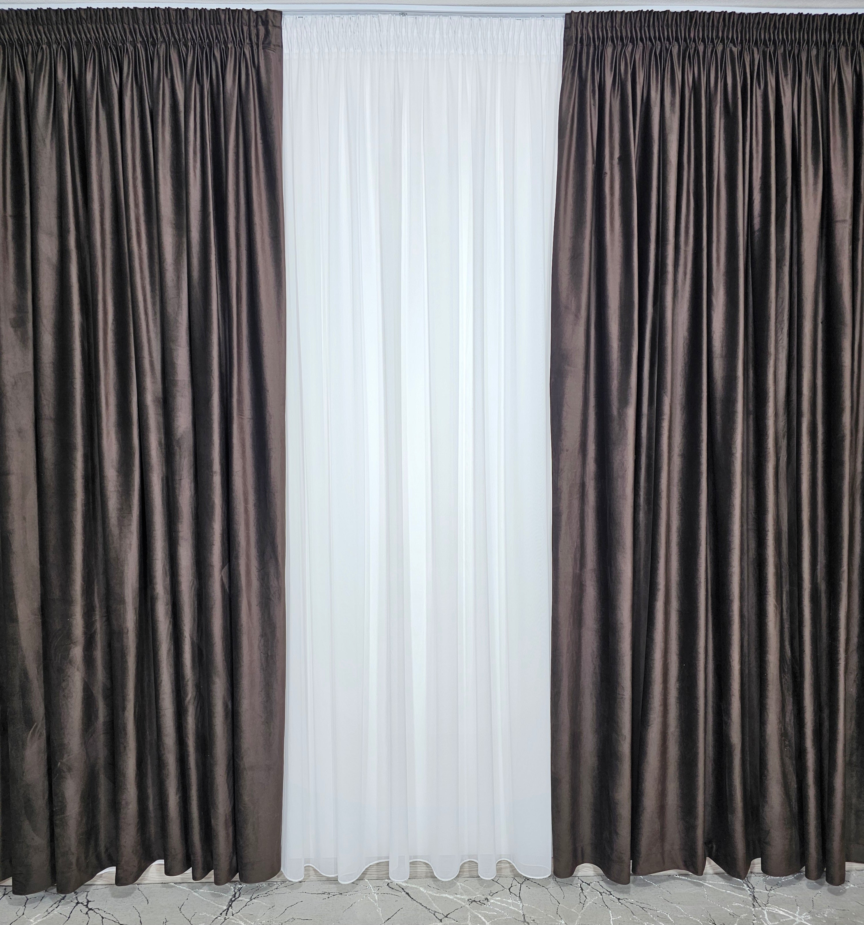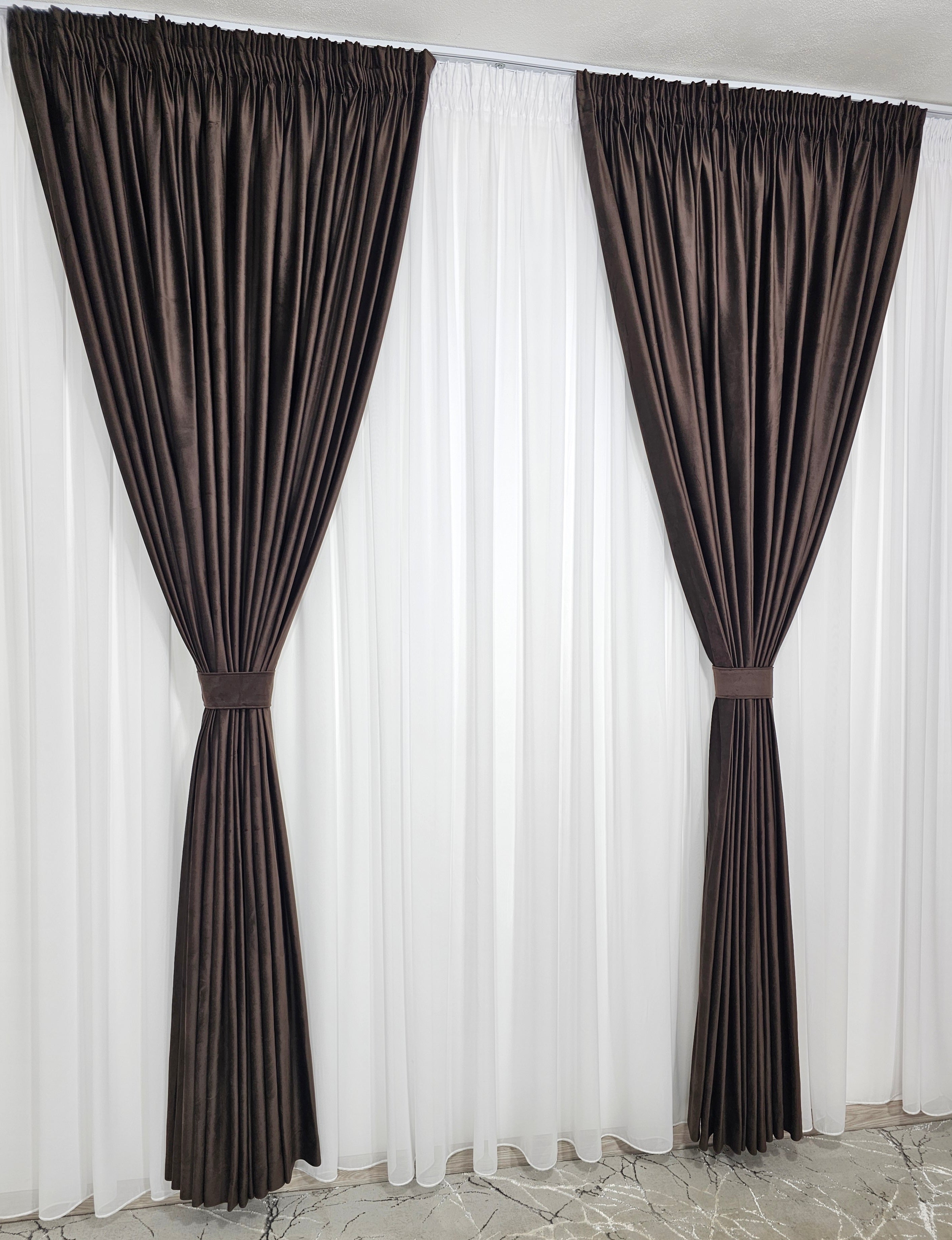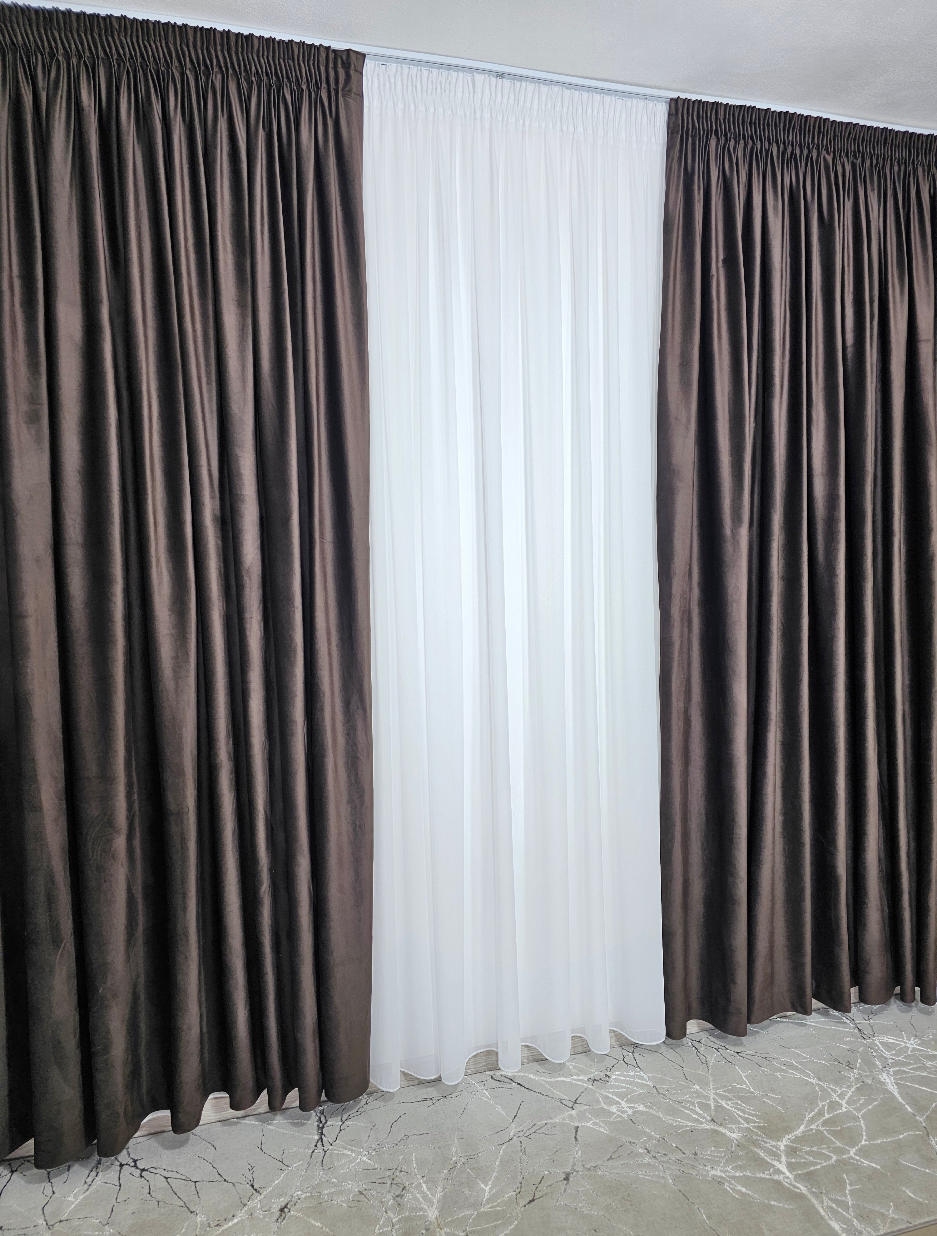Draperia din catifea maro închis adaugă un nivel de rafinament oricărui spațiu, combinând funcționalitatea cu un design elegant. Este soluția ideală pentru a crea un ambient cald, confortabil și sofisticat, transformând orice cameră într-un loc primitor și plin de stil.