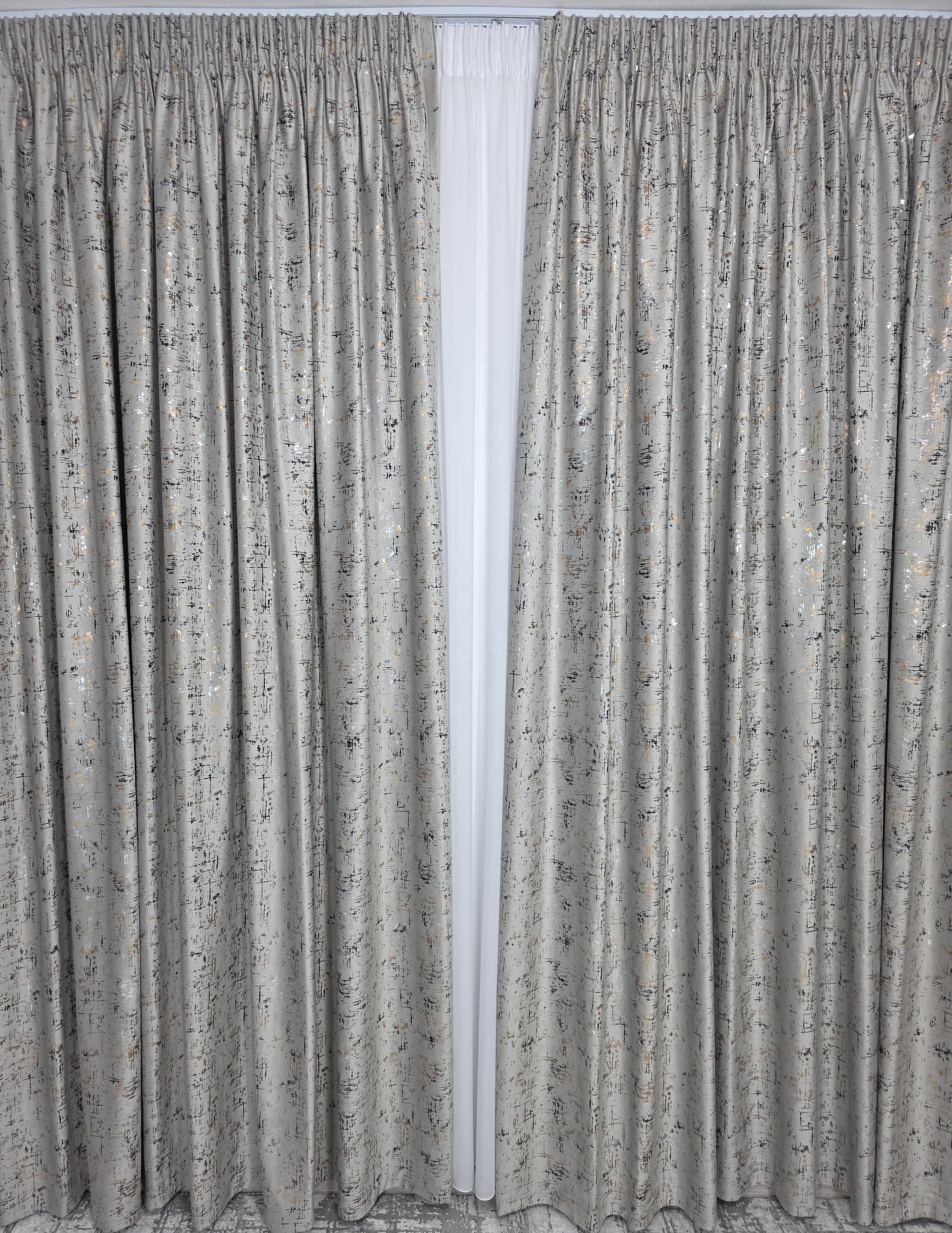 Draperia din catifea crem-gri cu inserții aurii și argintii blackout 80% transformă ferestrele în centrul elegant al încăperii, oferind stil, echilibru și rafinament vizual.