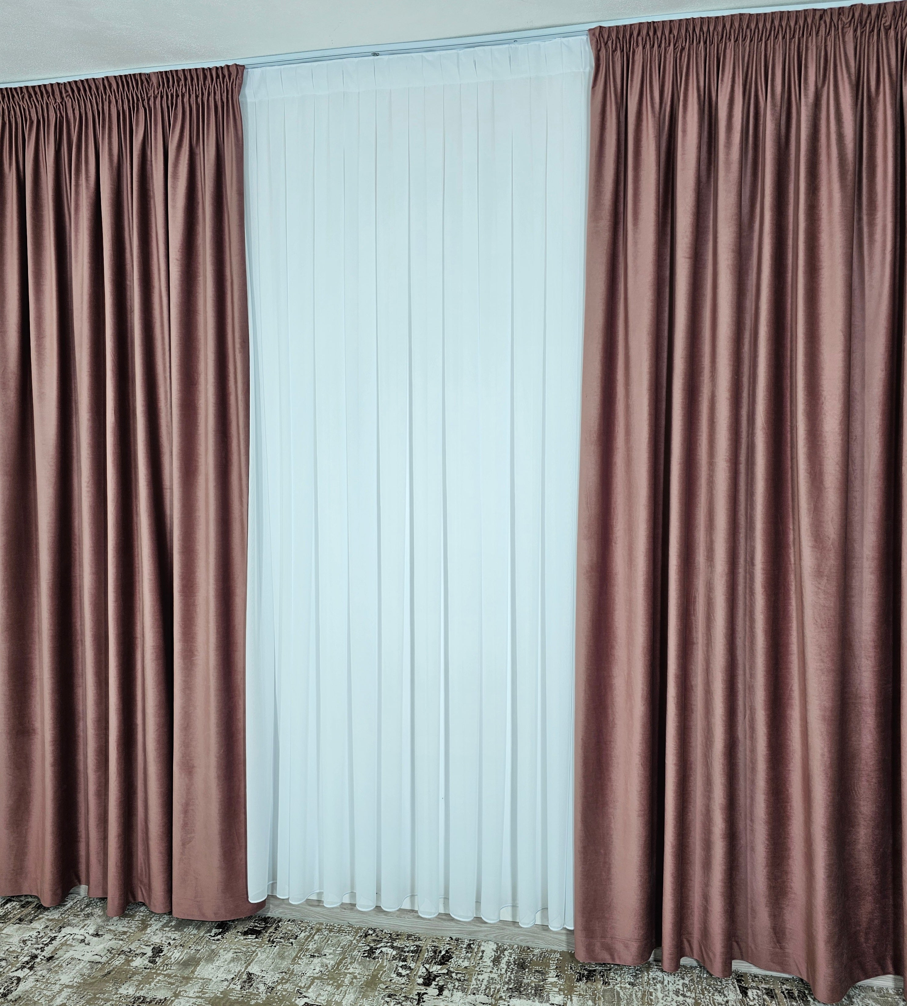 Această draperie adaugă eleganță și rafinament oricărui spațiu, datorită texturii pline de catifea și tonului roze cald, cu o opacitate ideală pentru confort și intimitate.