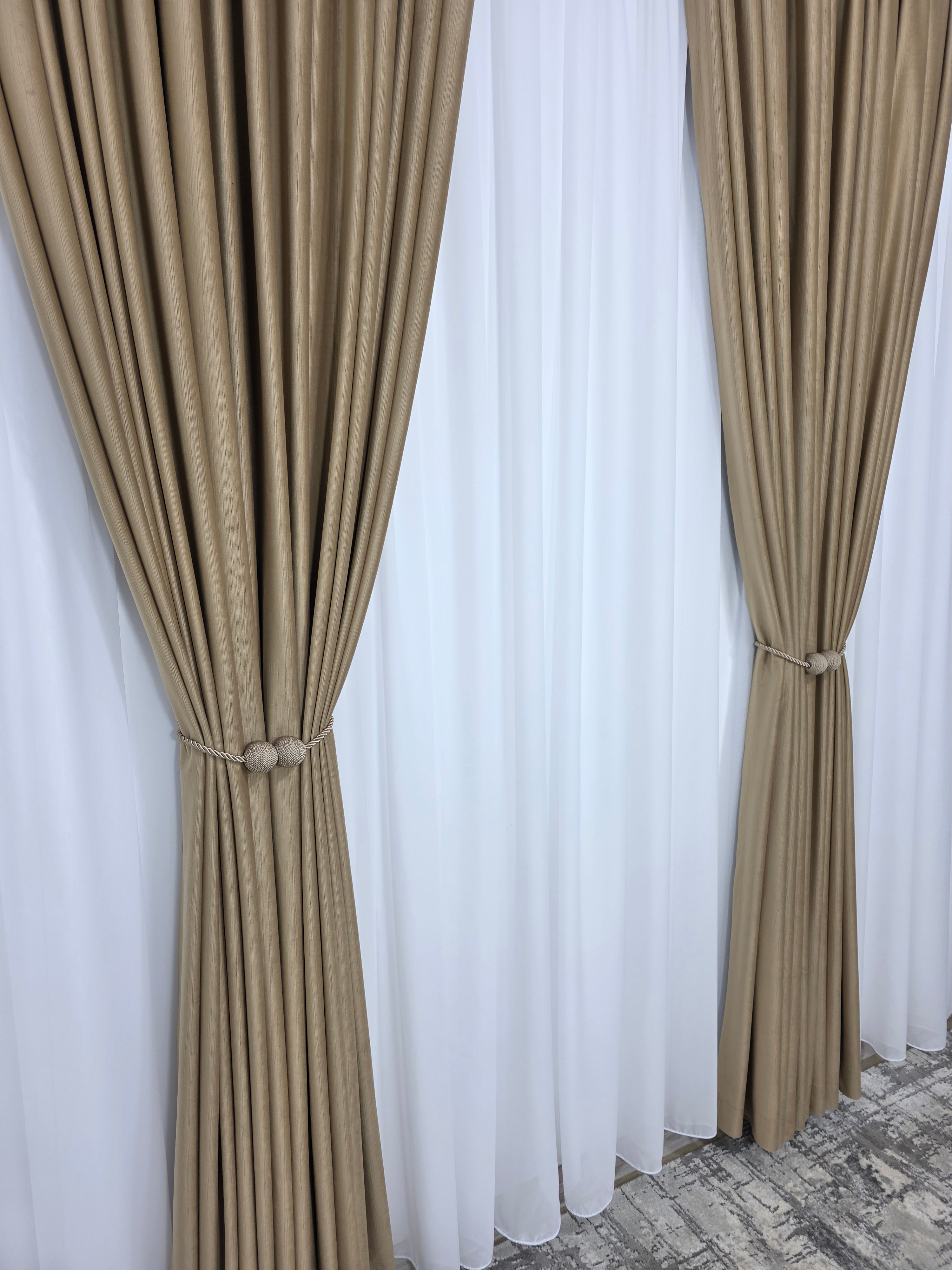 Set Perdea Voal Premium & Draperie Catifea Crem Auriu Tip Velura – Lumină Diafană și Rafinament Nobil în Tonuri Calde