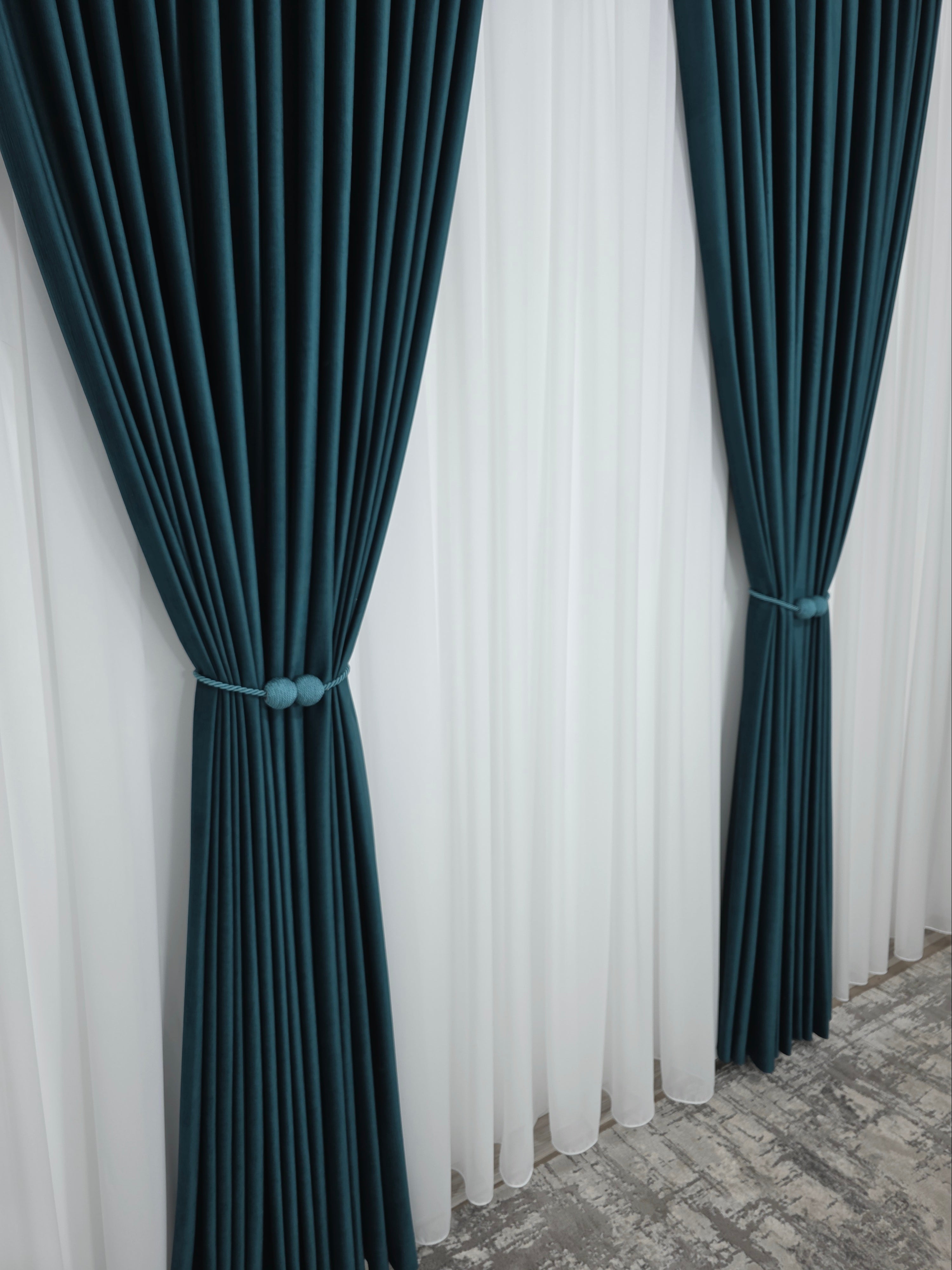 Set Perdea Voal Premium & Draperie Catifea Verde Turcoaz Tip Velura – Contrast Proaspăt și Texturi Delicate pentru un Spațiu Elegant