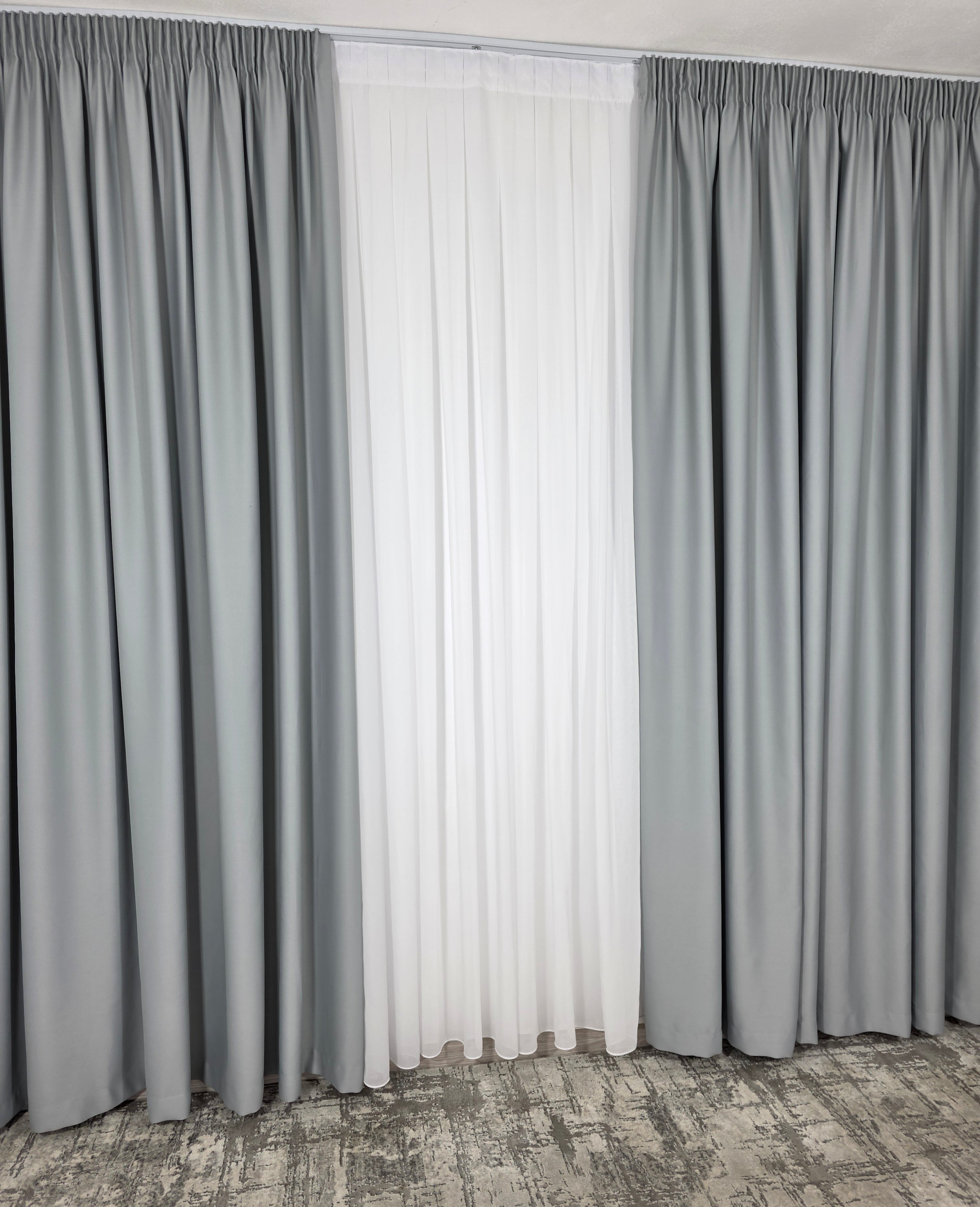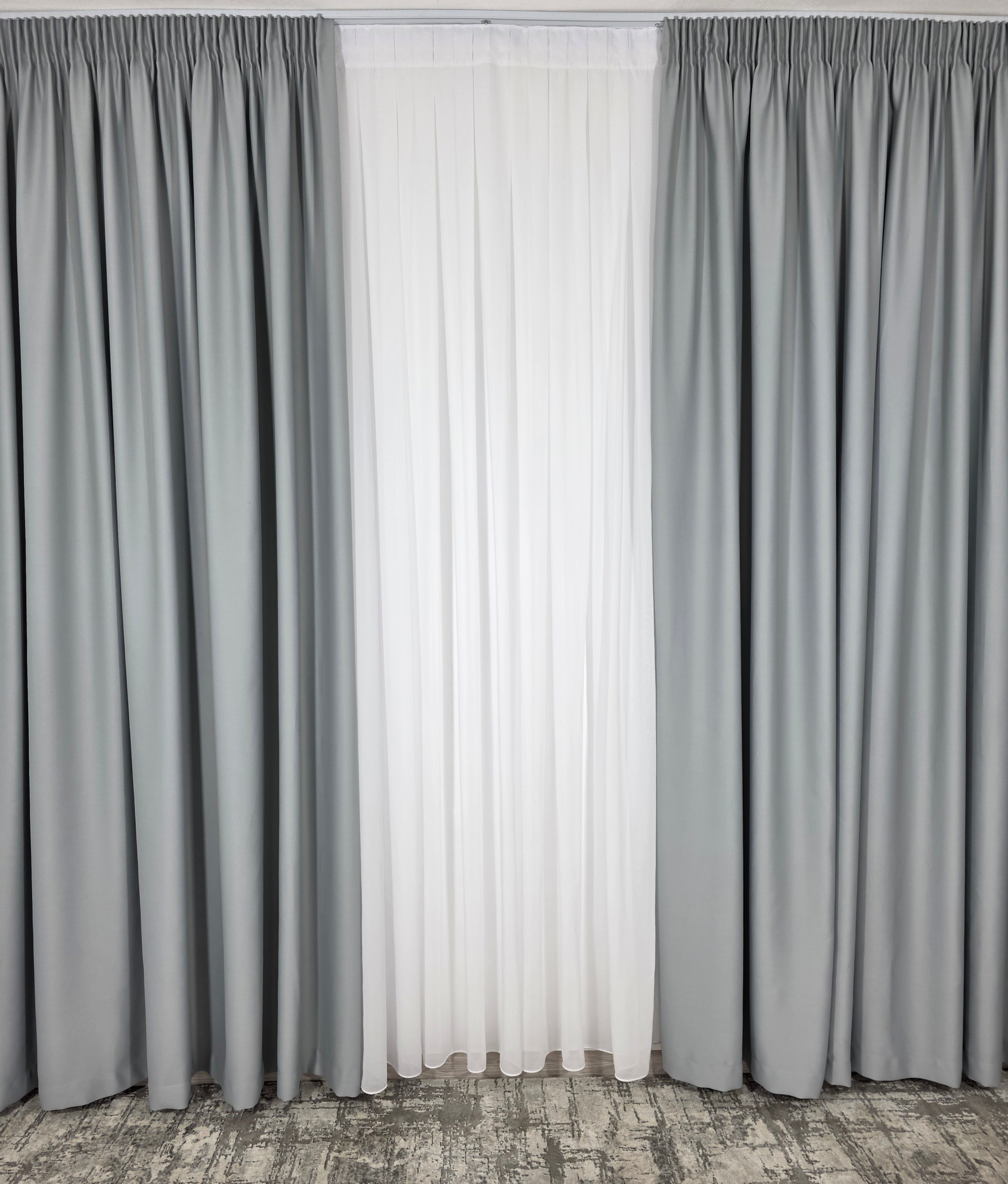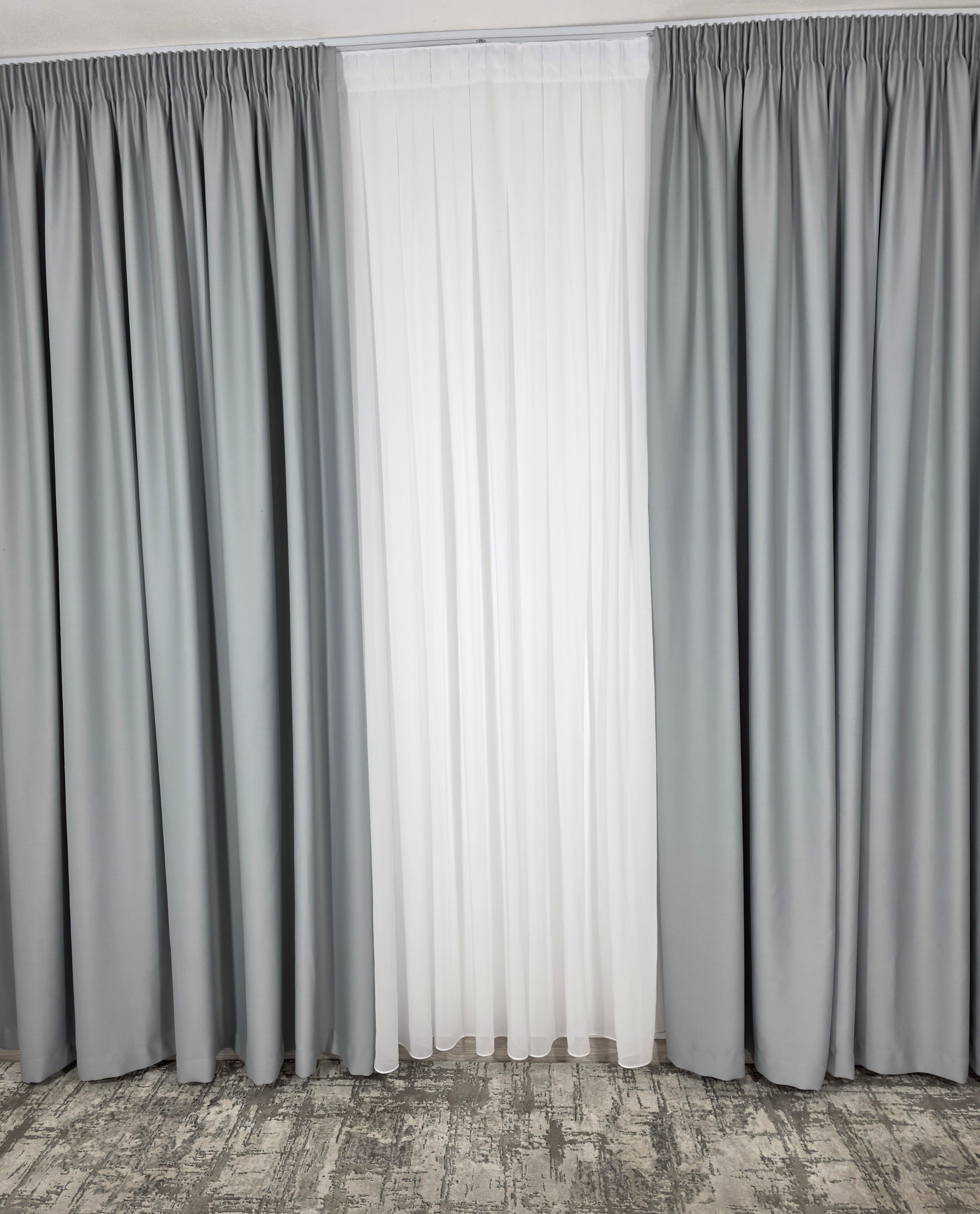 Set Perdea din Mătase Albă & Draperie Gri Deschis Blackout 80 % – Claritate Diafană și Accent Neutru pentru Ferestrele Tale