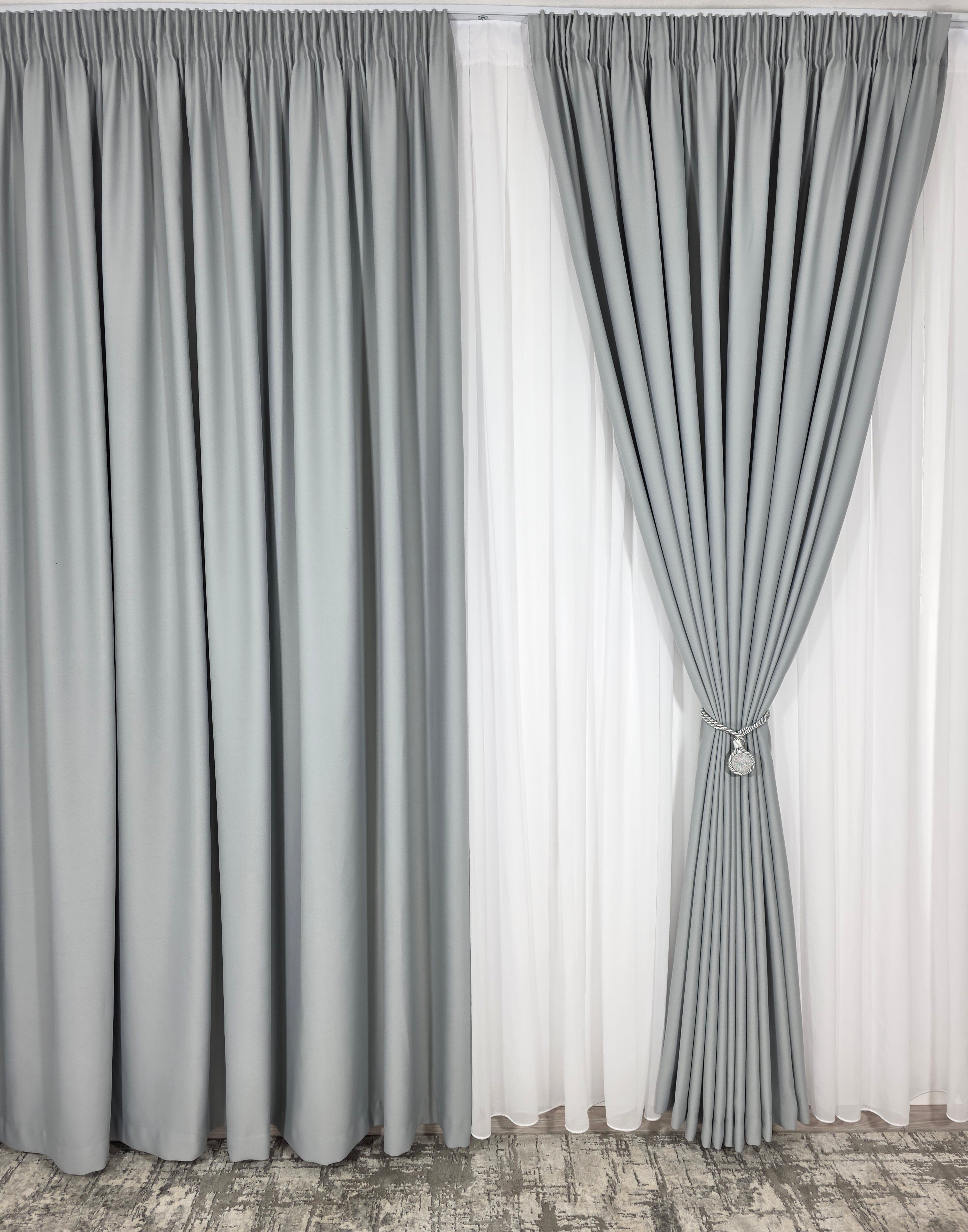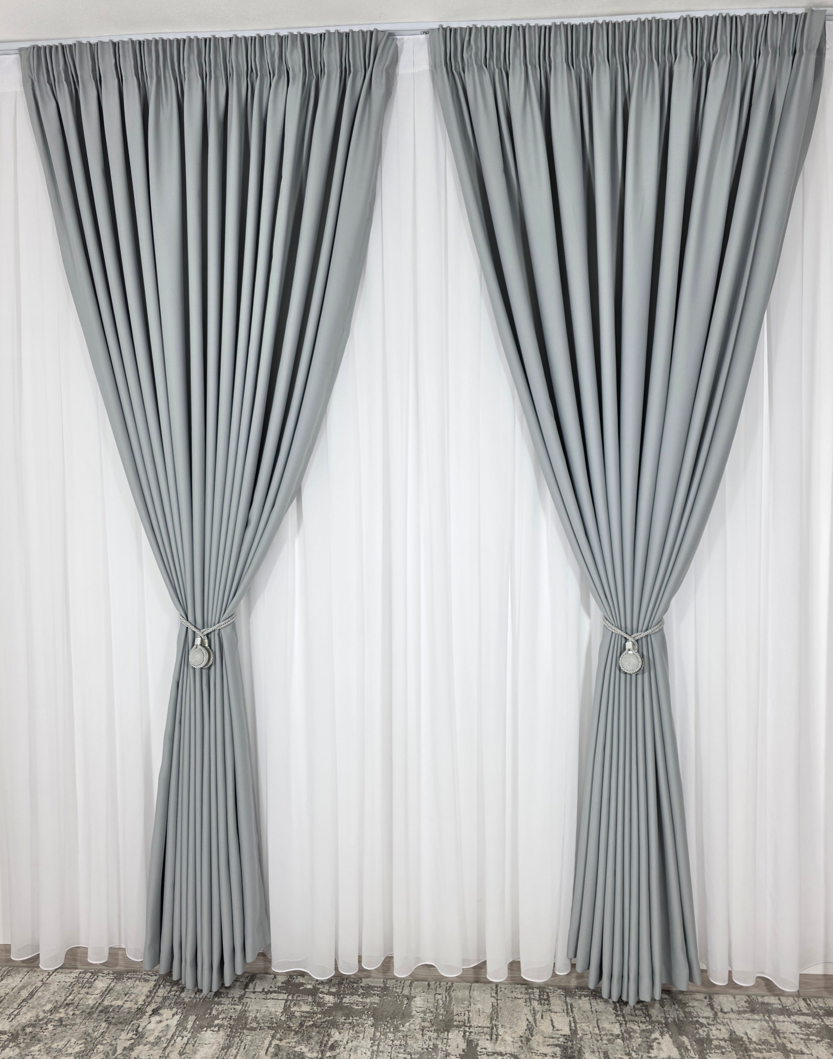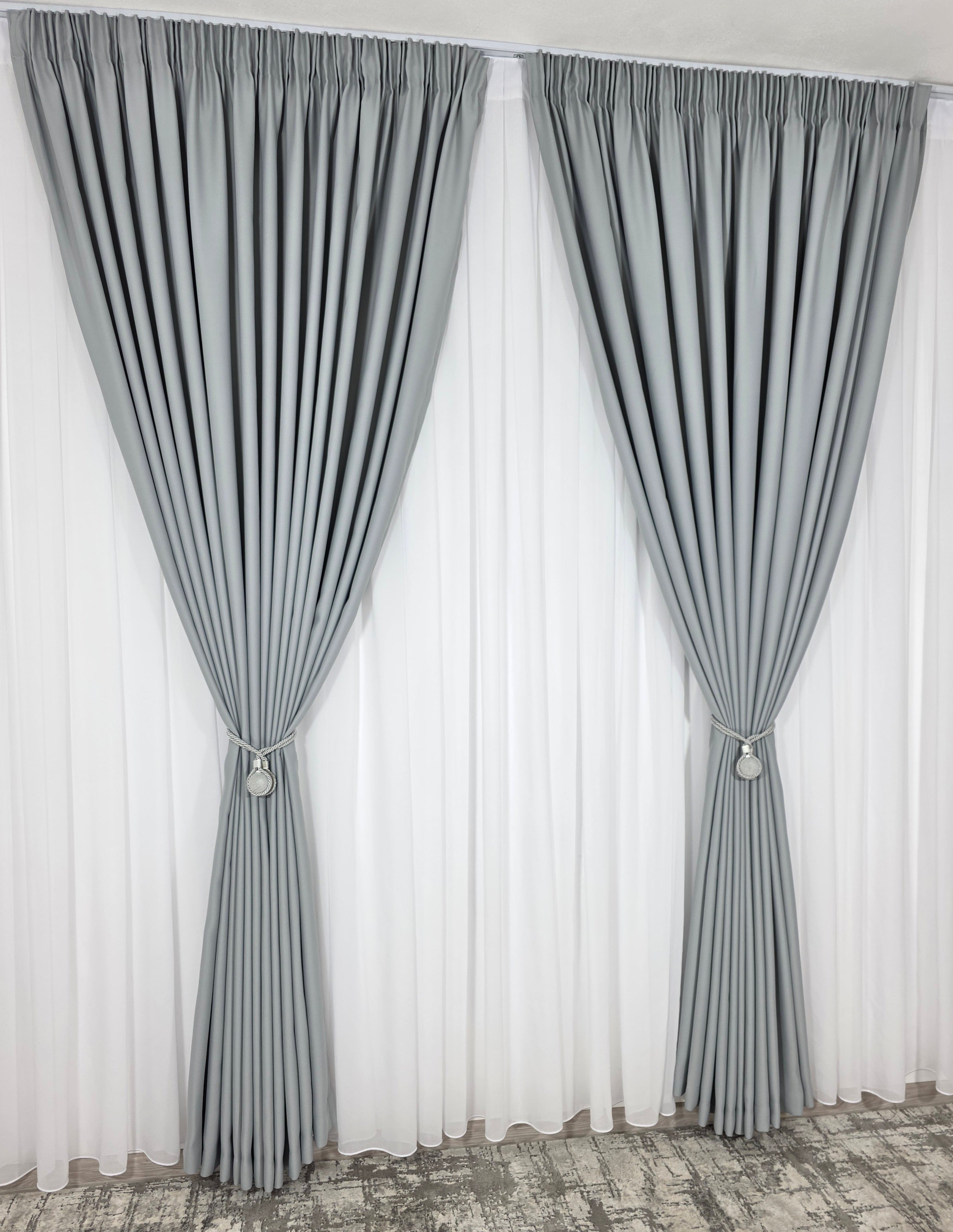 Set Perdea din Mătase Albă & Draperie Gri Deschis Blackout 80 % – Claritate Diafană și Accent Neutru pentru Ferestrele Tale