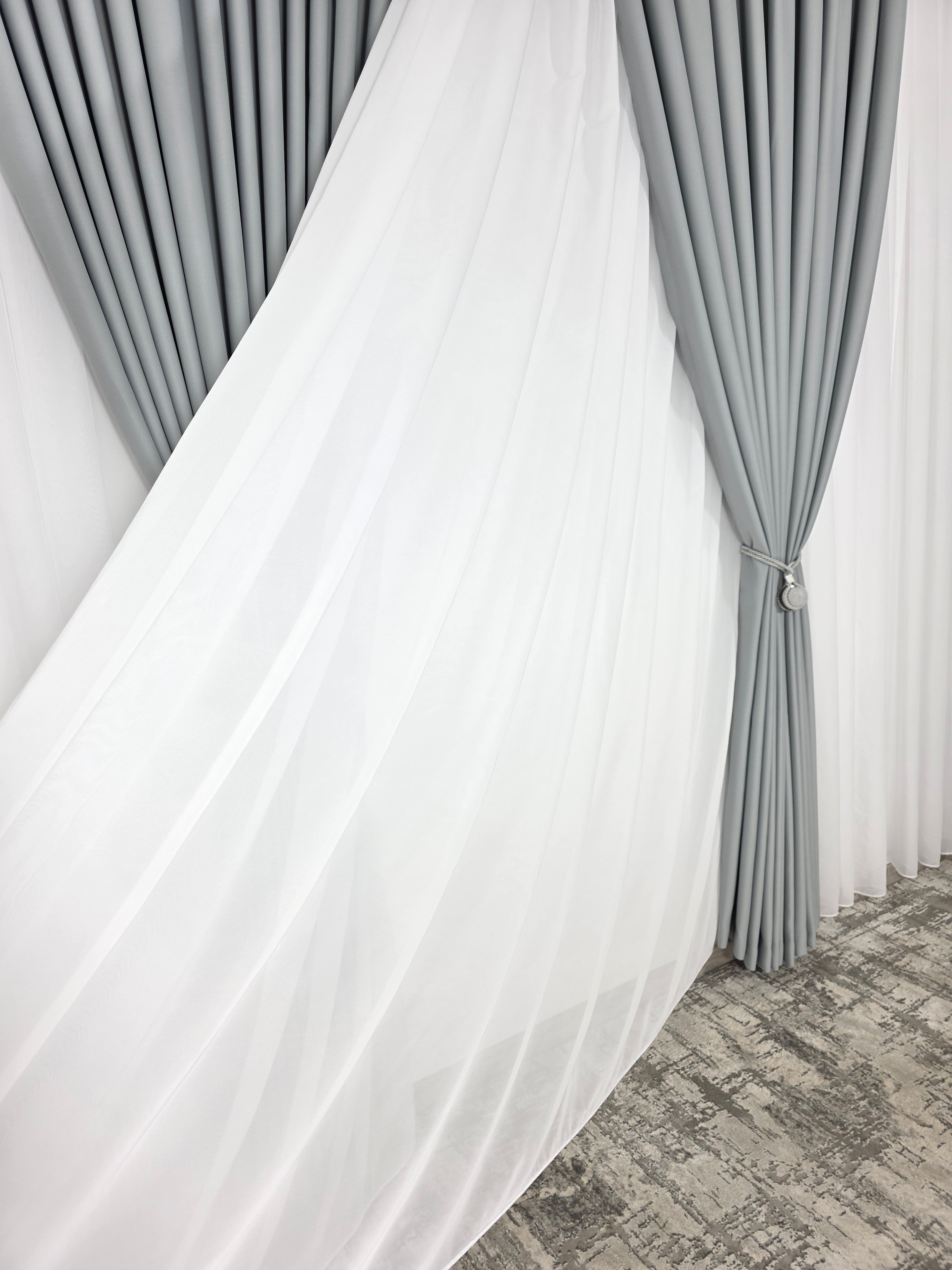 Îmbină luminozitatea pură a albului cu eleganța discreÂtă a tonurilor gri alegând acest set rafinat: perdea din mătase moale, alb imaculat și draperie blackout (~80 %) în nuanță gri deschis. Ansamblul aduce echilibrul perfect dintre delicatețea diafană și controlul eficient al luminii, potrivit interioarelor moderne, minimaliste sau clasice.