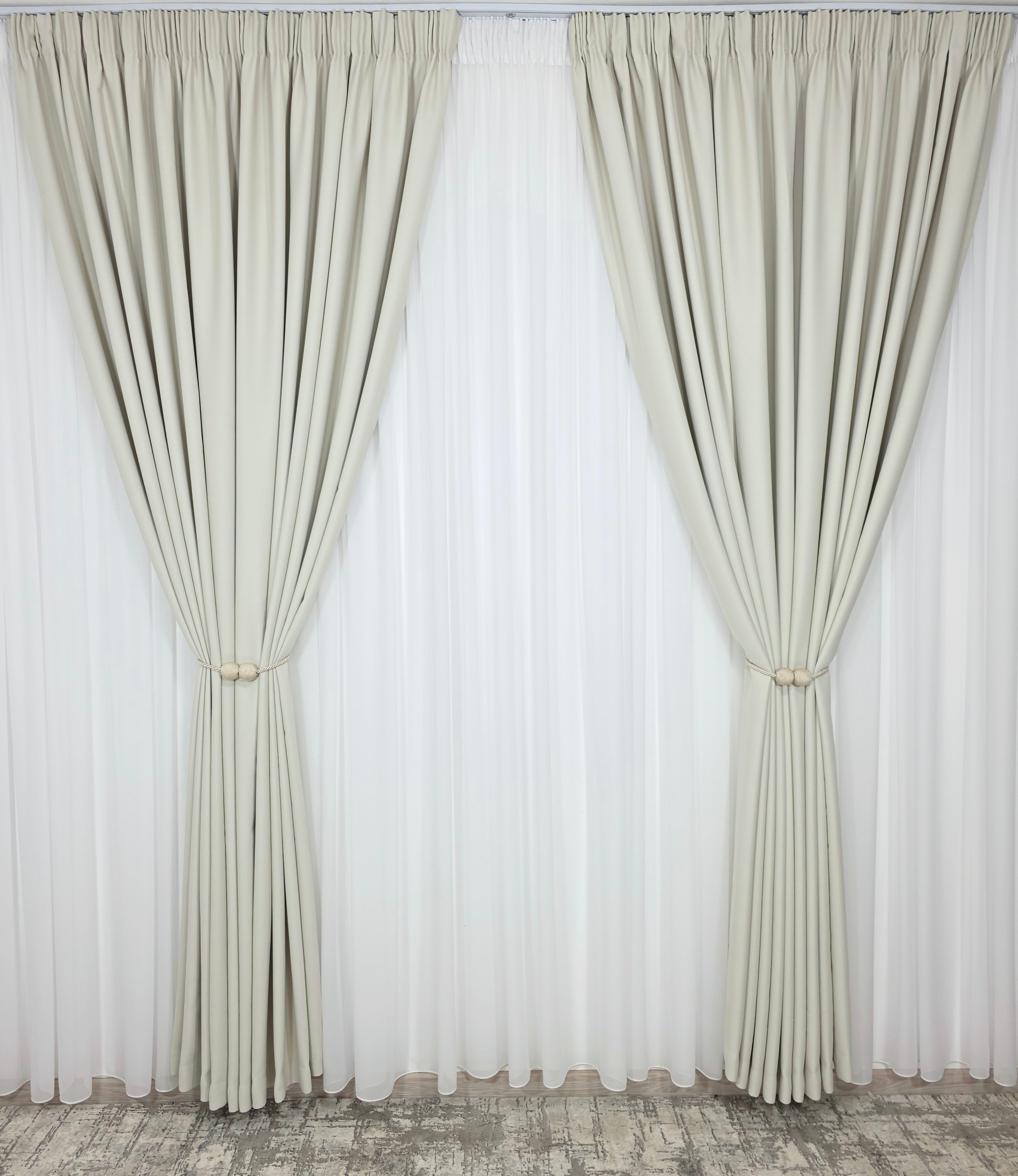 Set Perdea din Mătase Albă & Draperie Ivoire Blackout 80% – Eleganță Luminată și Protecție Delicată