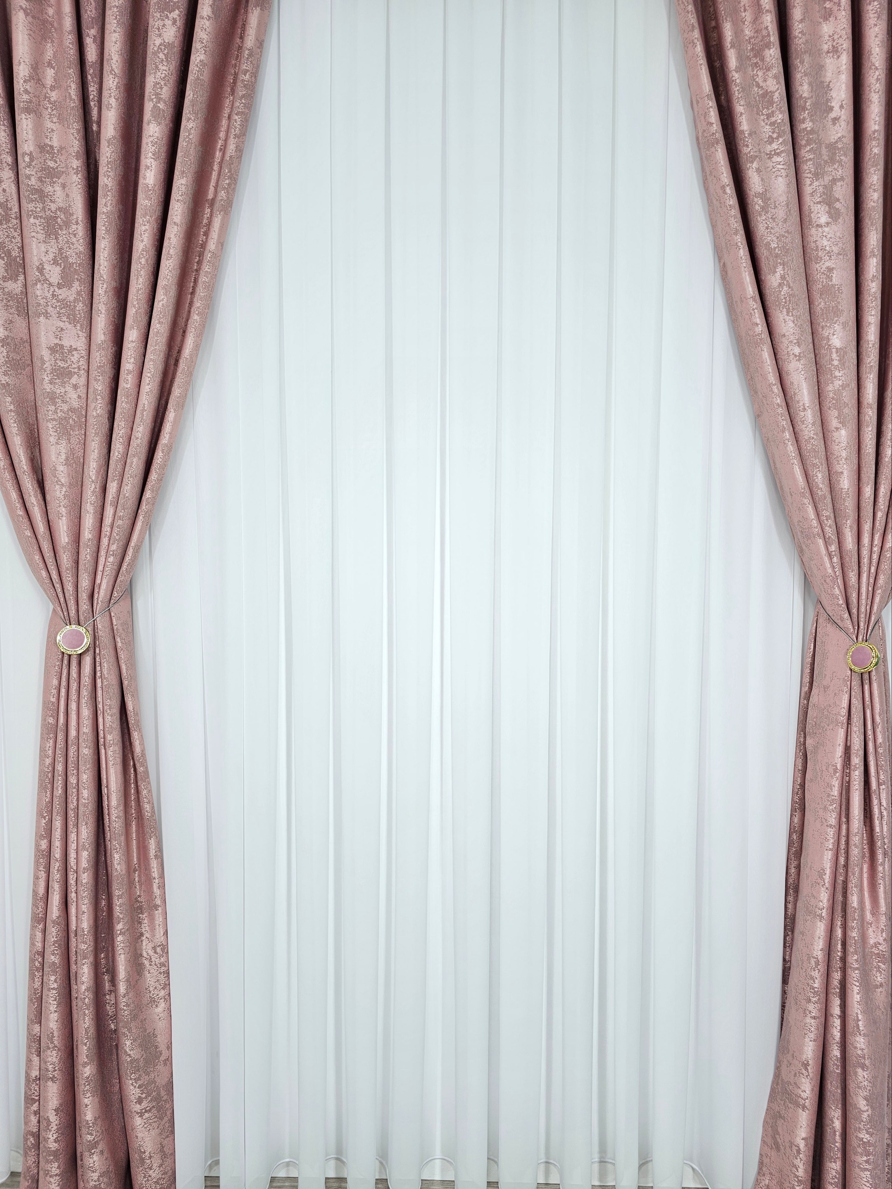 Acest set îmbină eleganța simplă a perdelei albe din voal cu rafinamentul draperiei în nuanță rose tip vopsea decorativă. Perdeaua aduce luminozitate și lejeritate spațiului, iar draperia completează decorul cu un efect modern și cald, ideal pentru interioare elegante și primitoare.