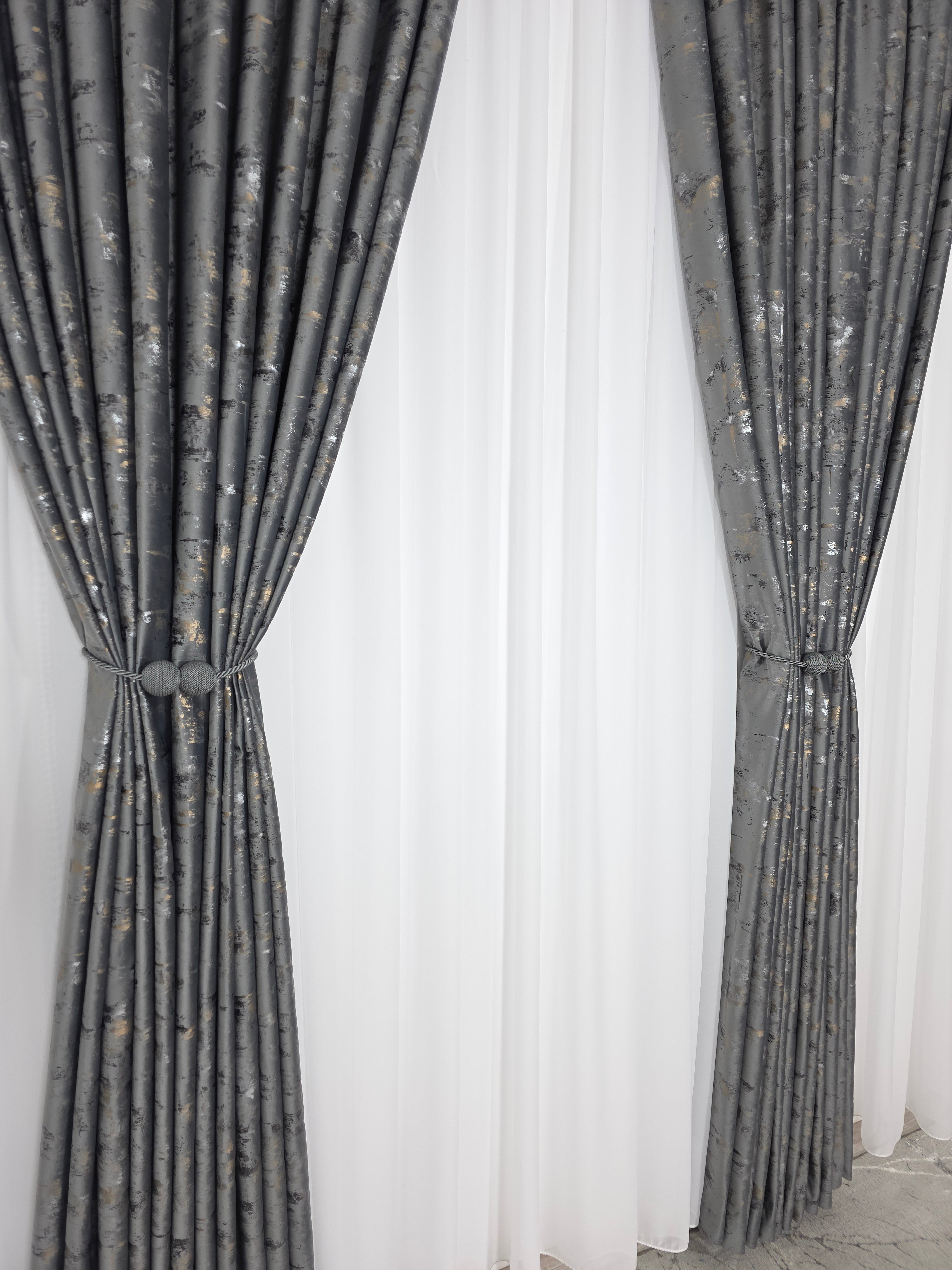 Setul cu perdea voal premium și draperie din catifea gri închis cu inserții aurii Golden transformă ferestrele în accente de lux și rafinament absolut.
