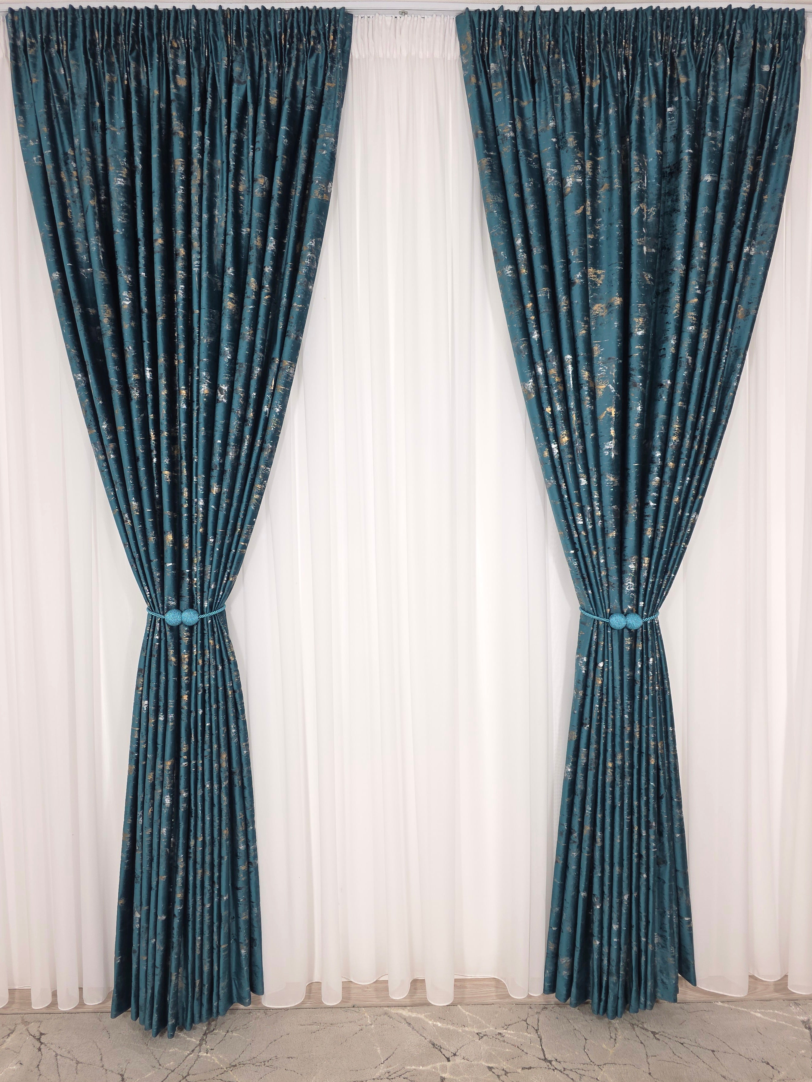 Set Perdea Voal Premium & Draperie din Catifea Turcoaz cu Inserții – Model Golden