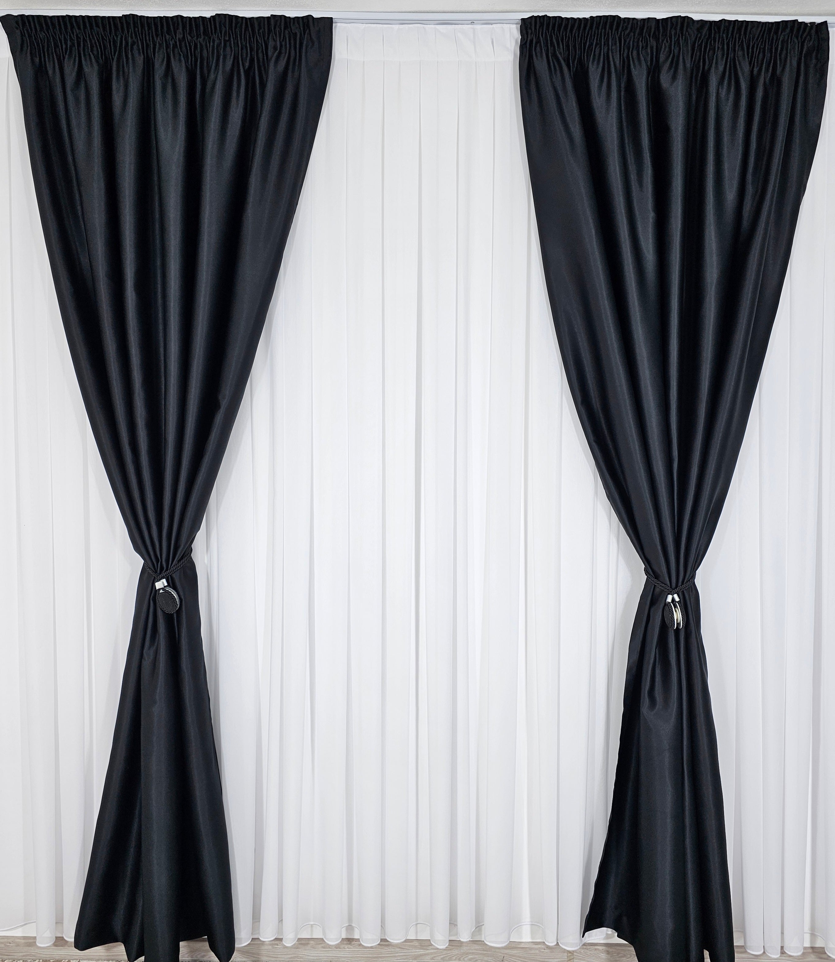 O alegere sofisticată și practică pentru spațiile care cer control total al luminii și un plus de rafinament: draperia neagră din material dens, cu textură plină, este realizată din poliester de calitate superioară și oferă opacitate 100%.