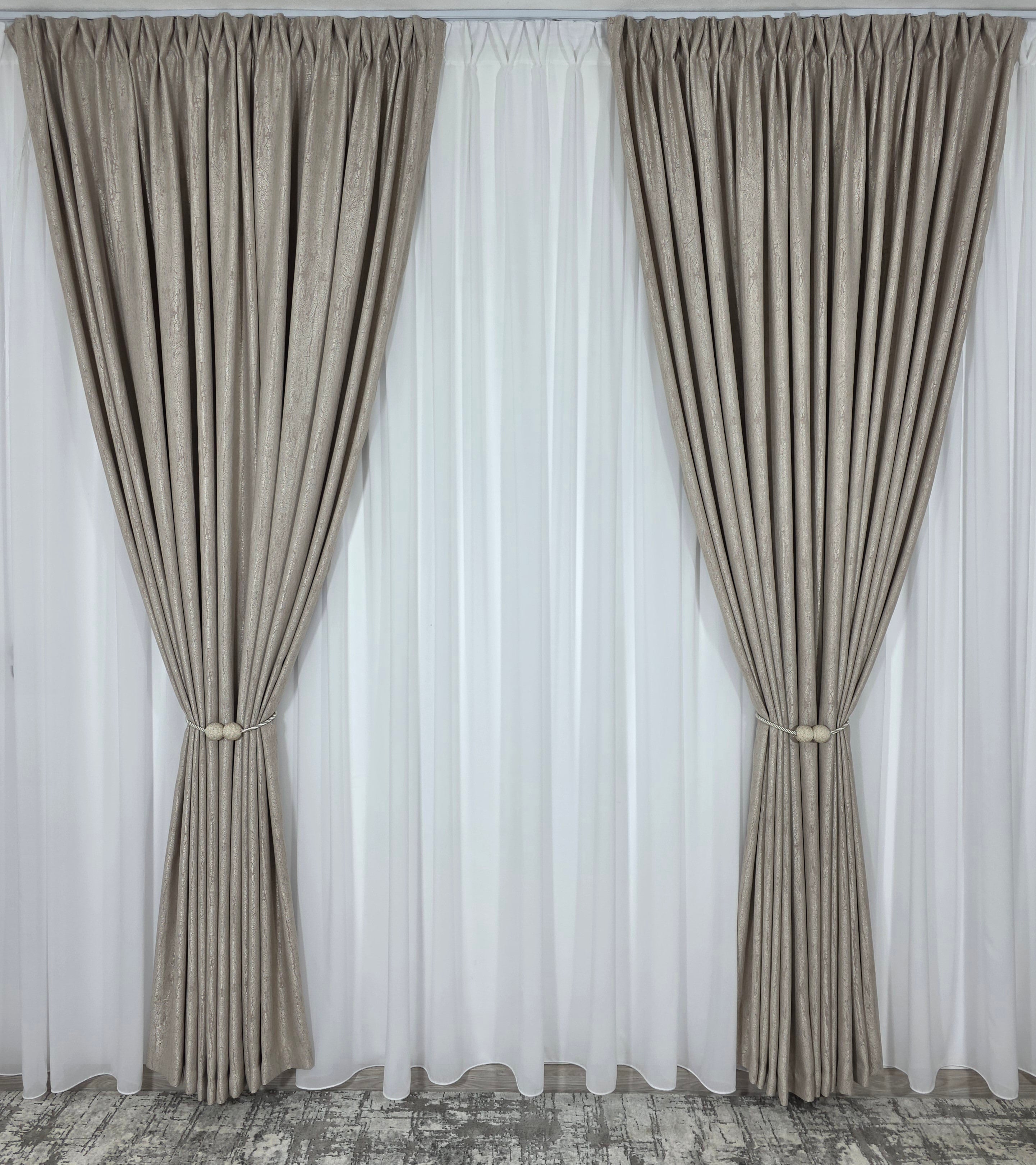 Un set elegant și versatil, alcătuit dintr-o perdea albă simplă din voal, ce aduce luminozitate și delicatețe, și o draperie bej cu model de vopsea decorativă, care oferă un efect vizual modern și sofisticat. Împreună, creează un decor echilibrat, potrivit atât pentru interioare clasice, cât și pentru spații contemporane.