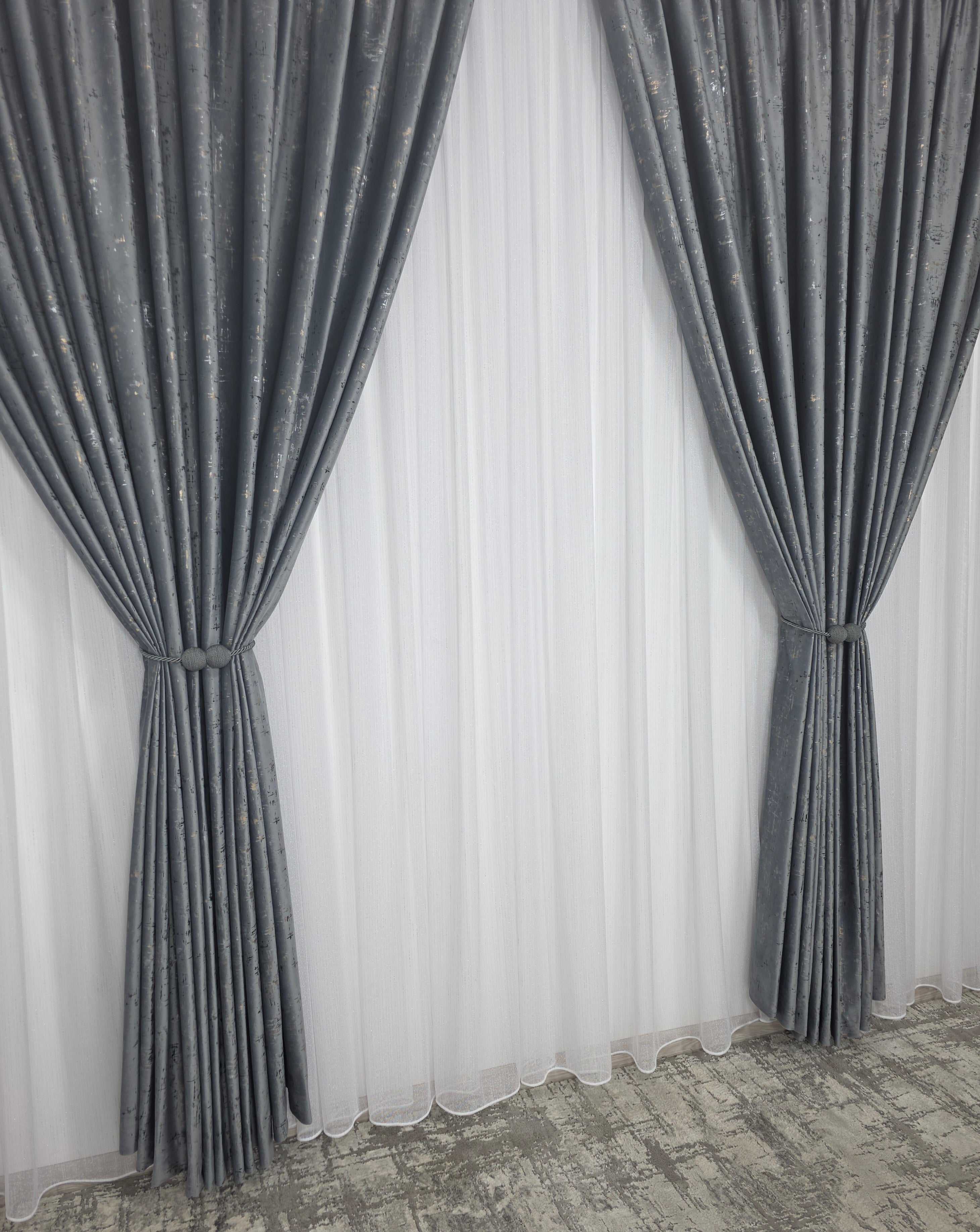 Setul cu perdea din borangic alb cu sidef argintiu și draperie din catifea gri închis transformă ferestrele în accente de rafinament și lux discret.