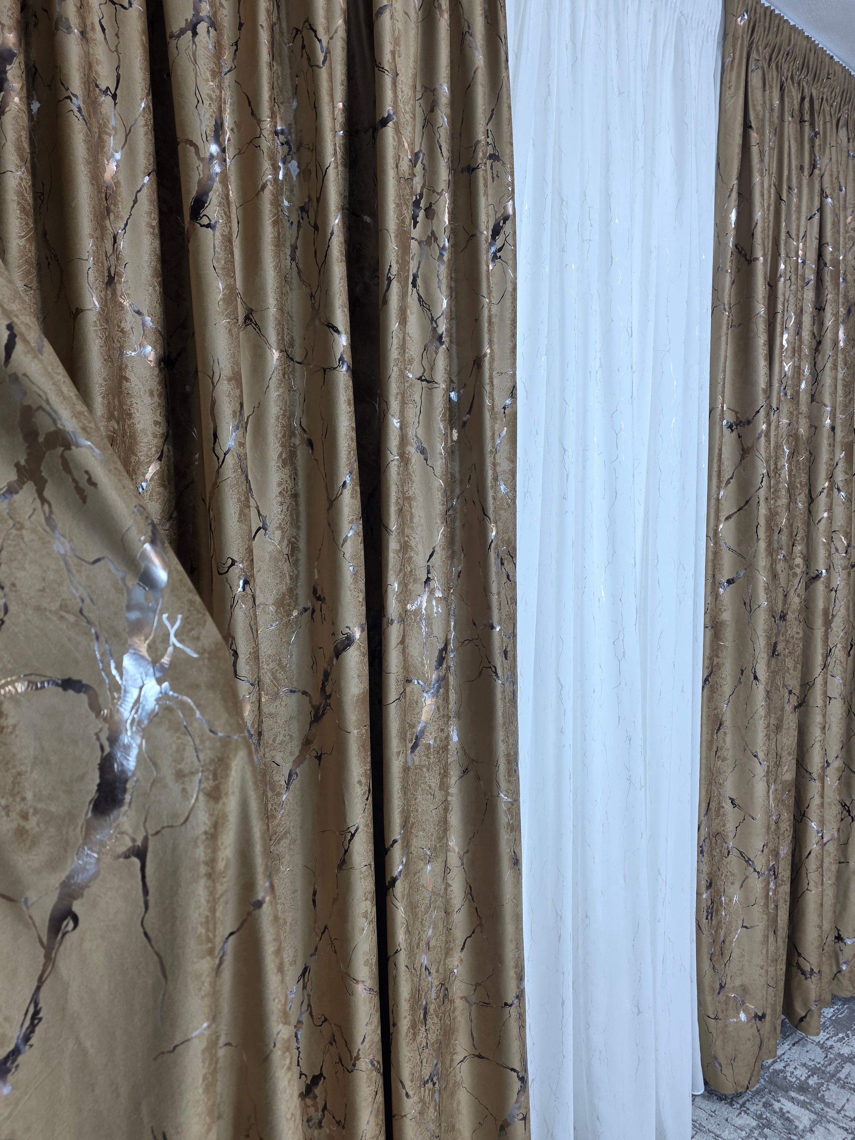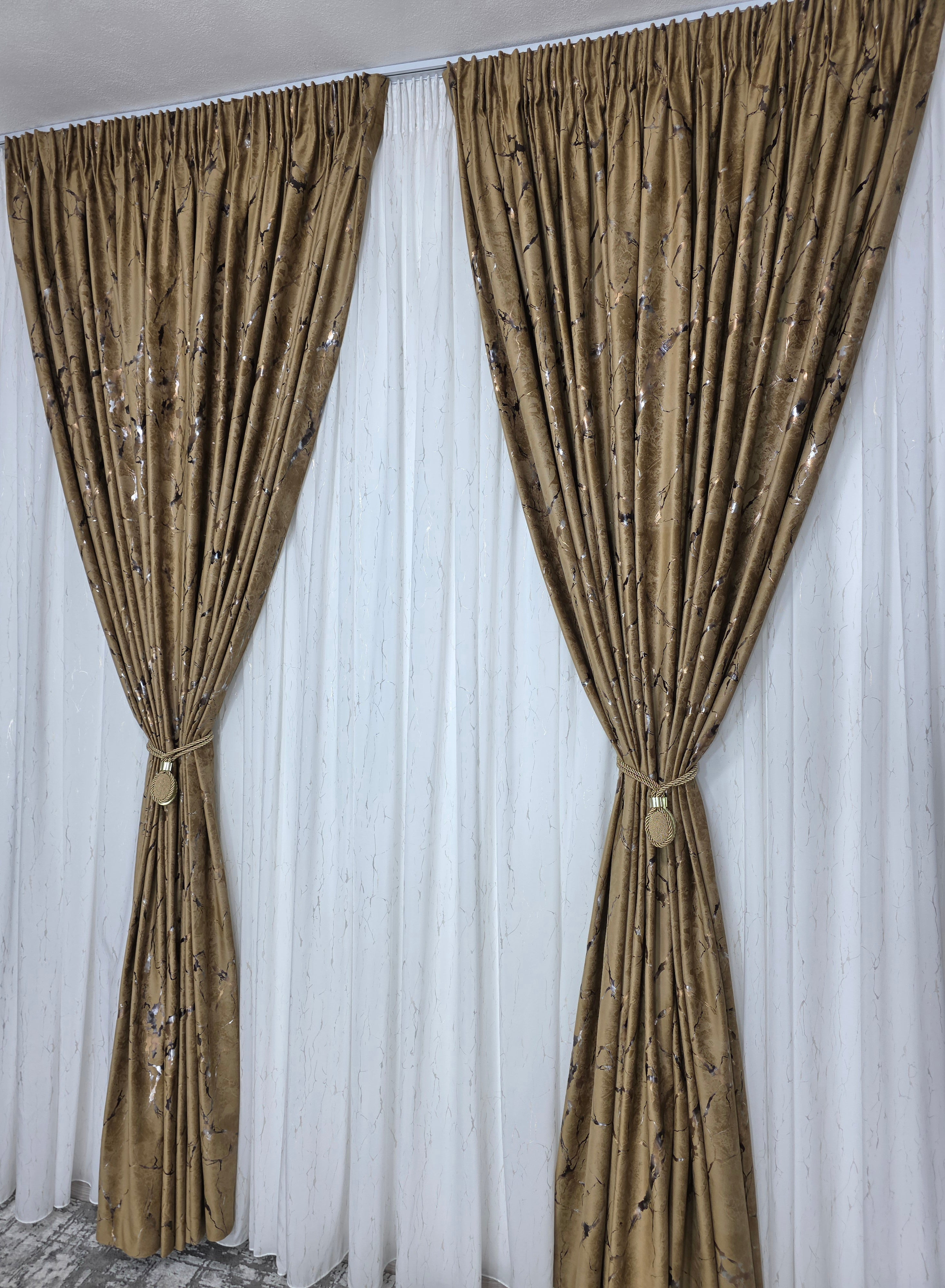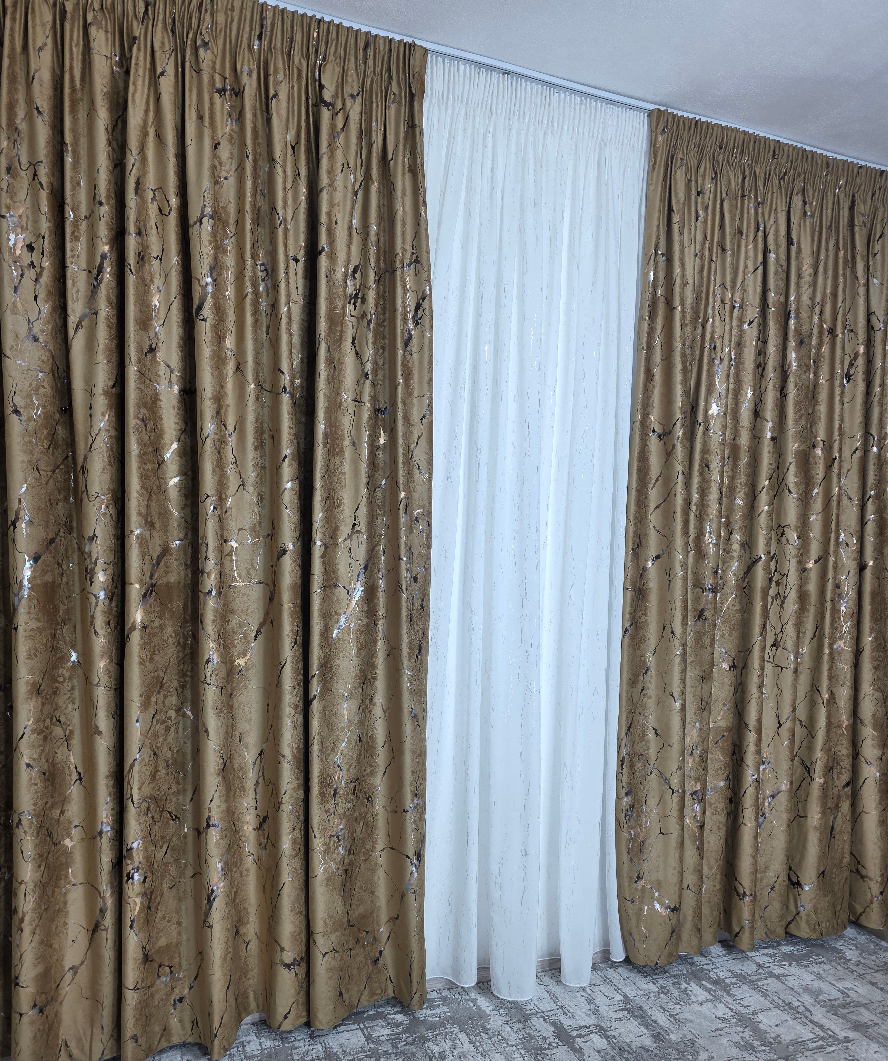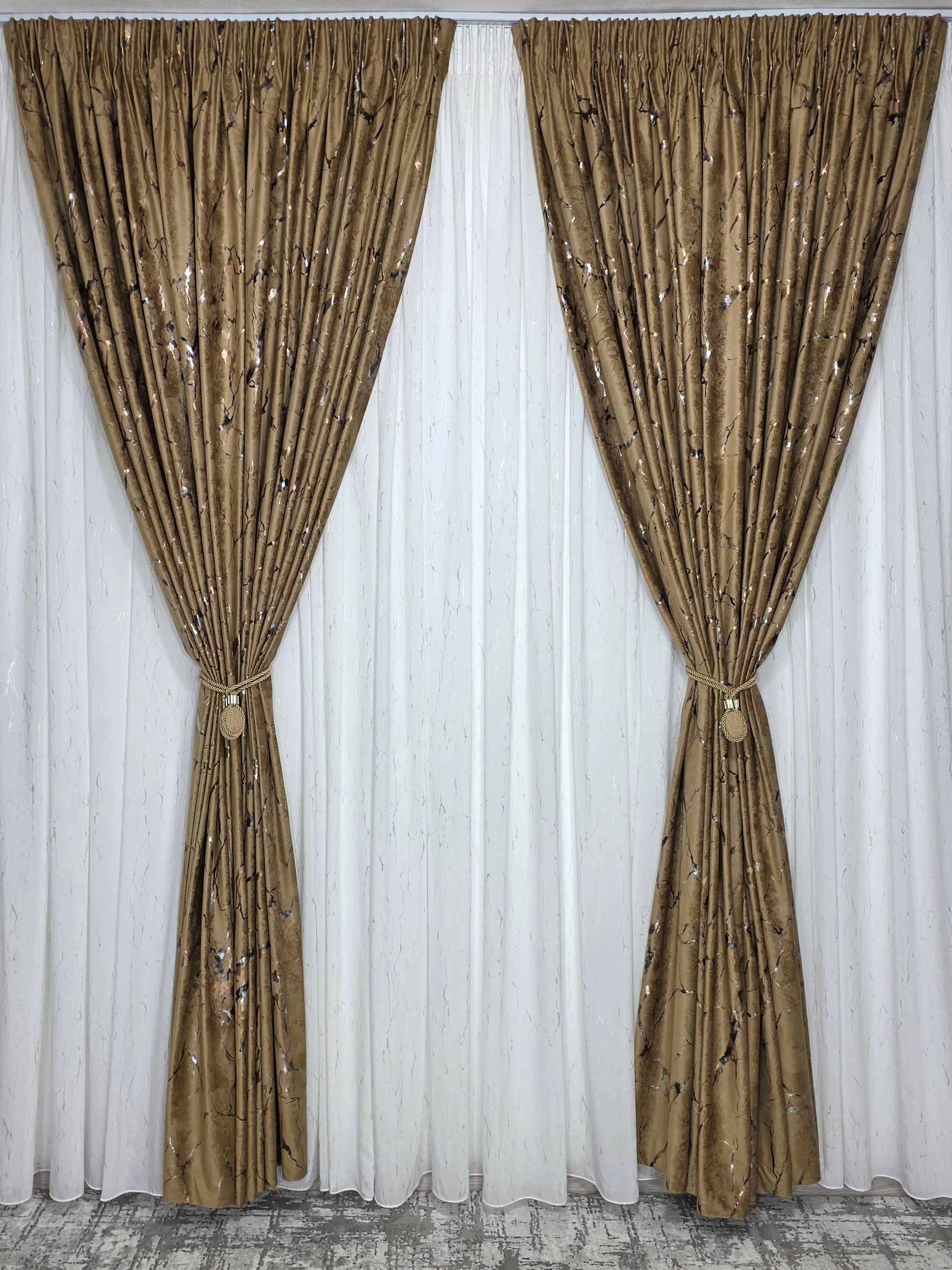 Setul cu perdea mătase moale și draperie catifea auriu bronz cu inserții transformă ferestrele în punctul central de eleganță și rafinament al camerei.