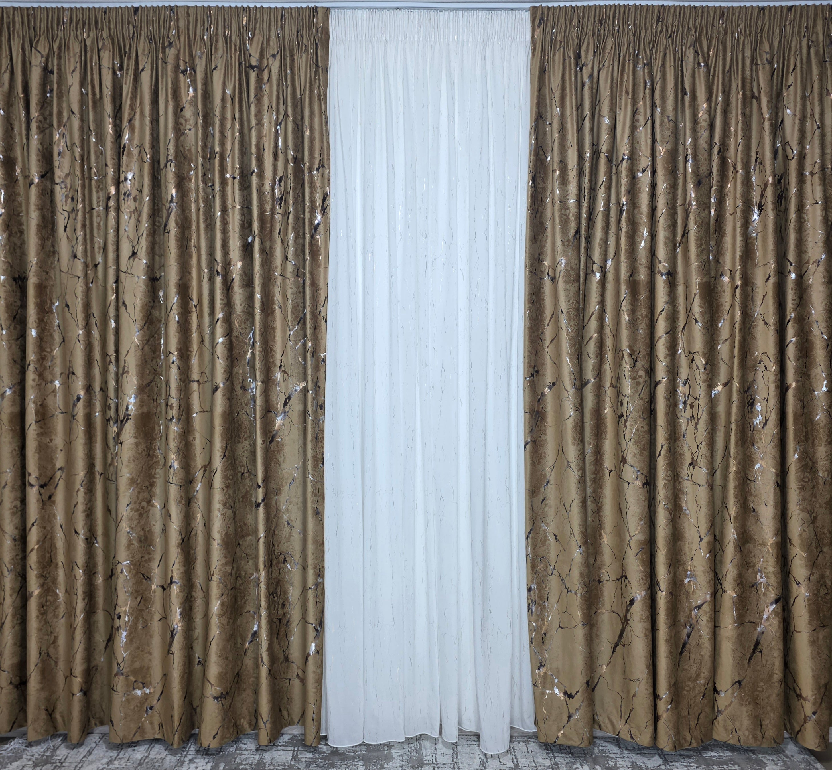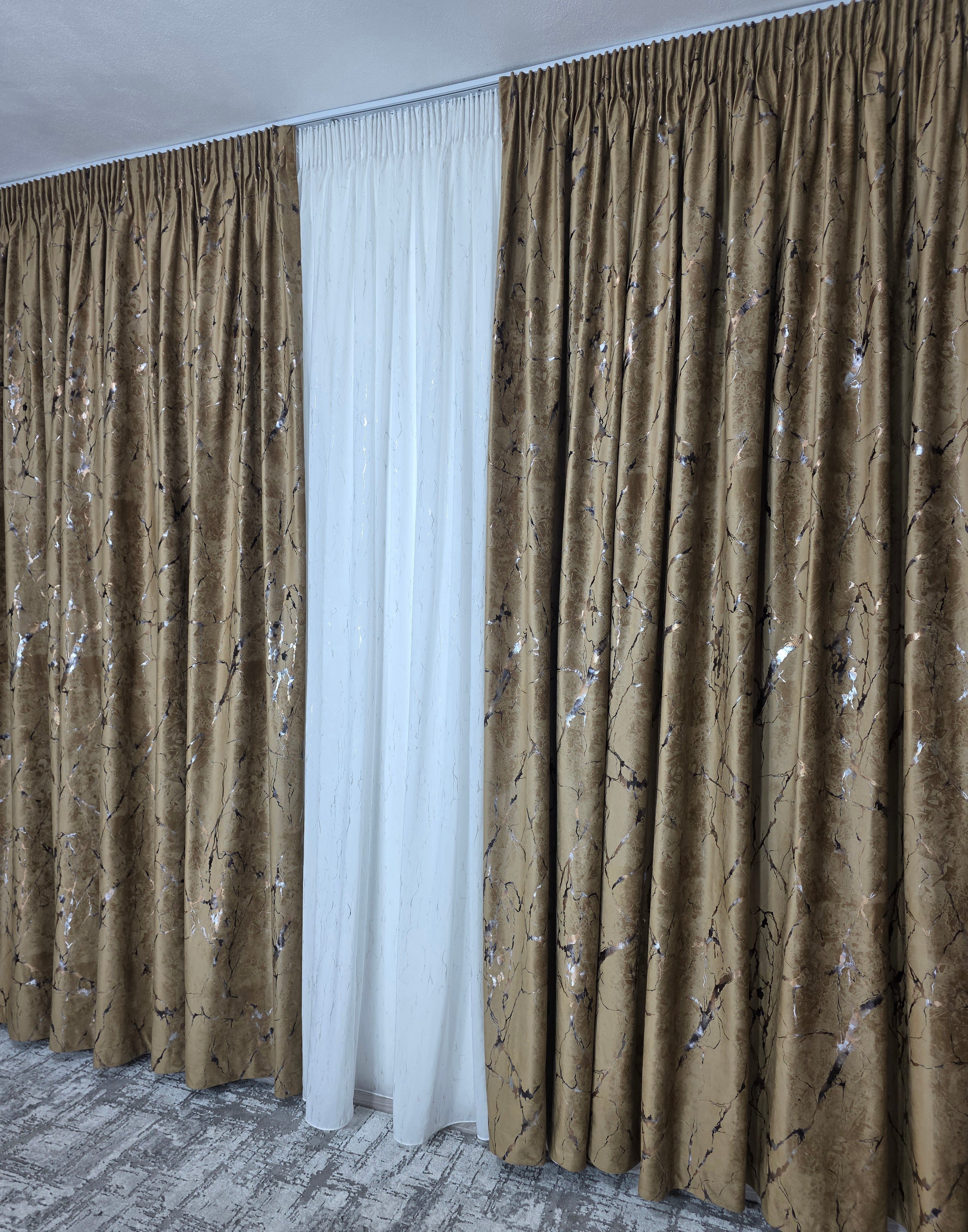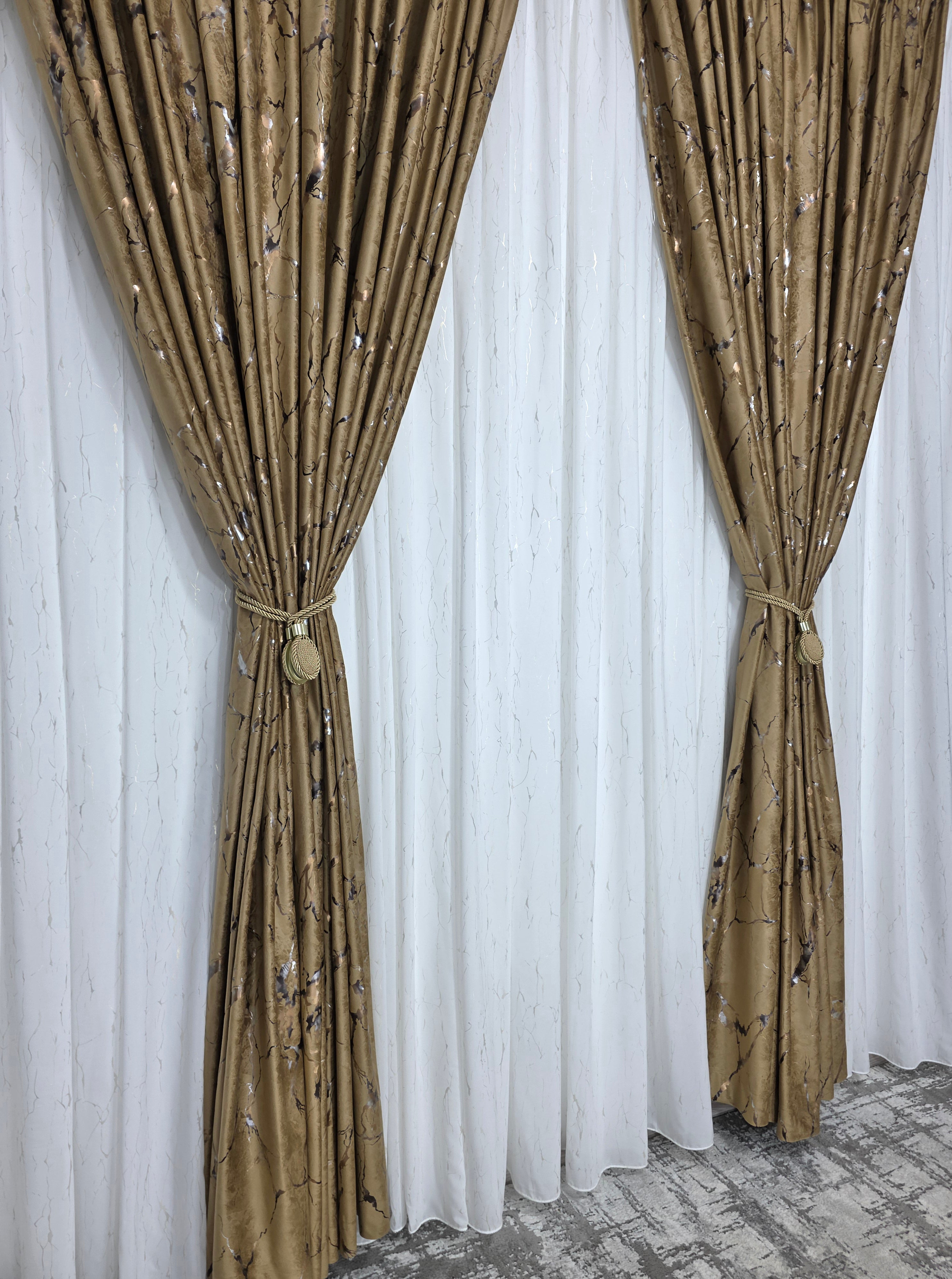 Setul cu perdea mătase moale și draperie catifea auriu bronz cu inserții transformă ferestrele în punctul central de eleganță și rafinament al camerei.