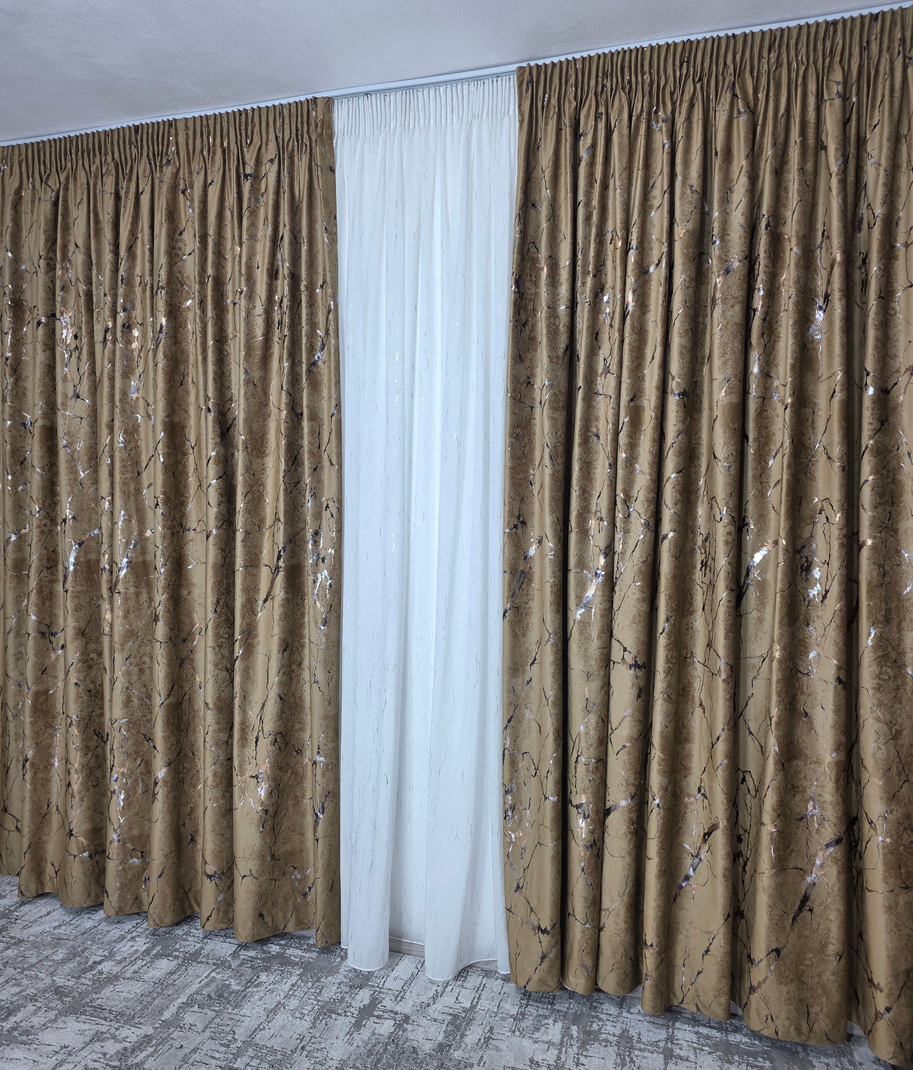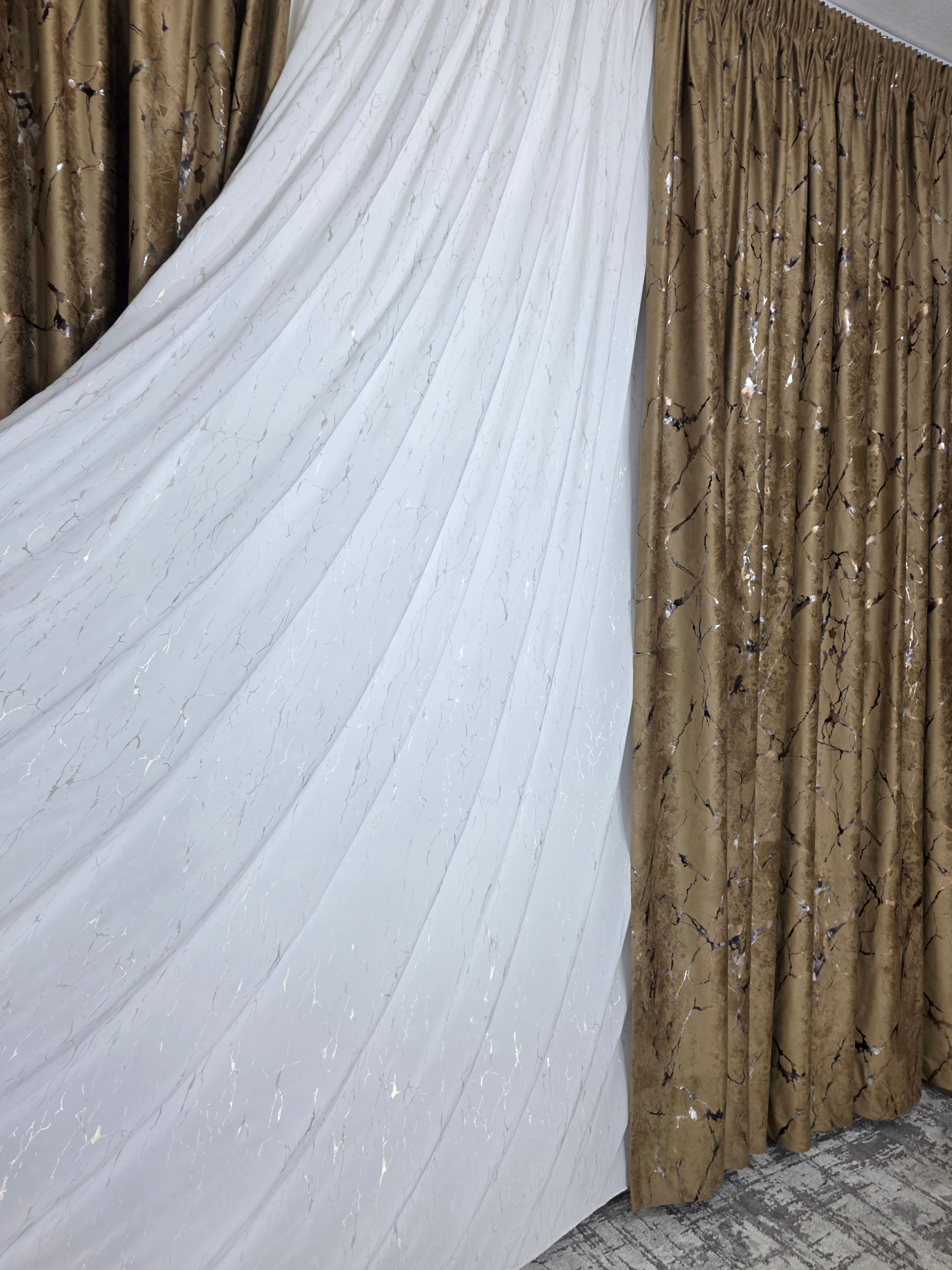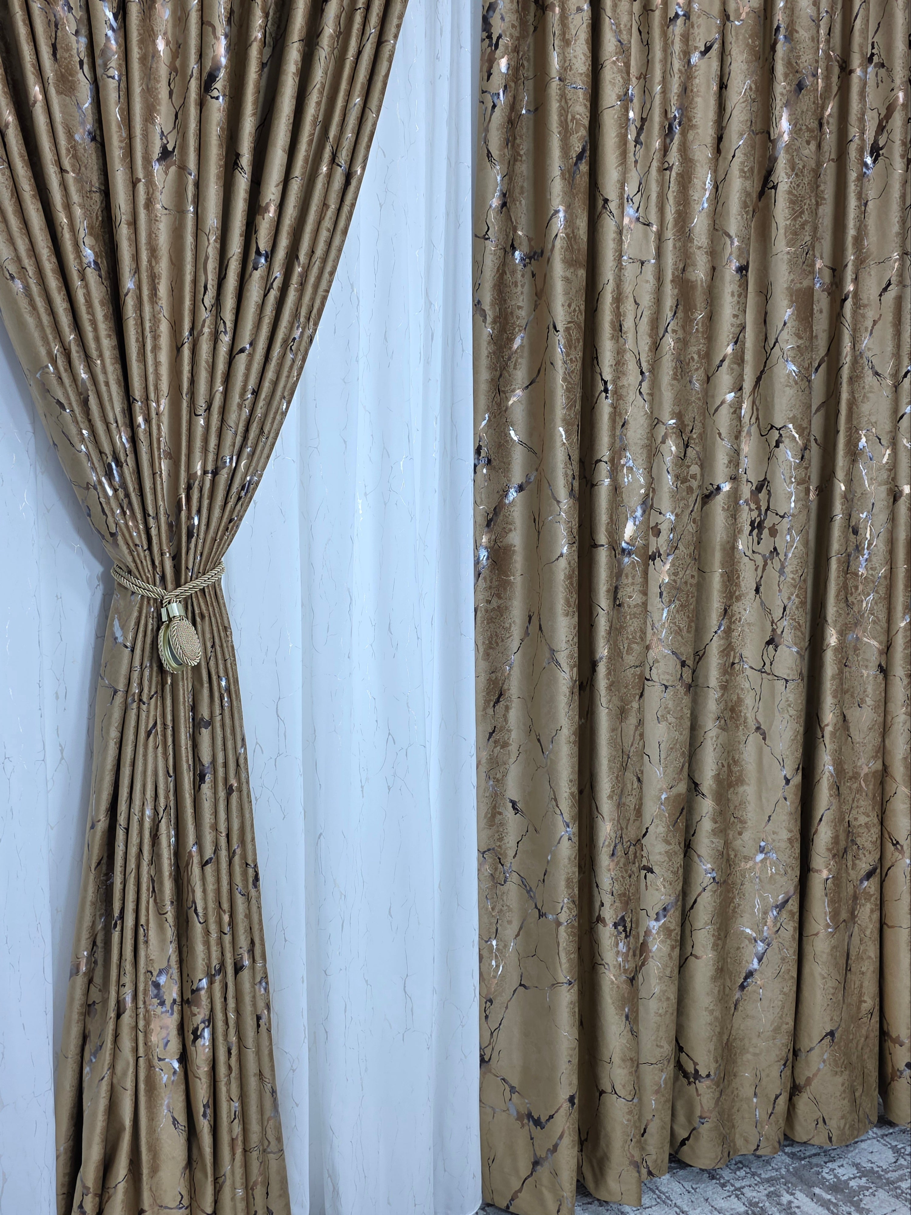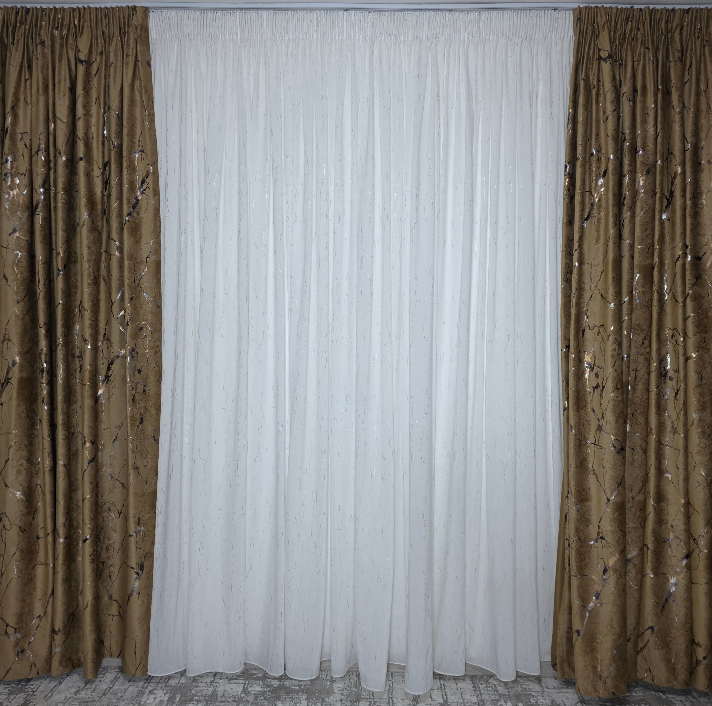 Setul cu perdea mătase moale și draperie catifea auriu bronz cu inserții transformă ferestrele în punctul central de eleganță și rafinament al camerei.