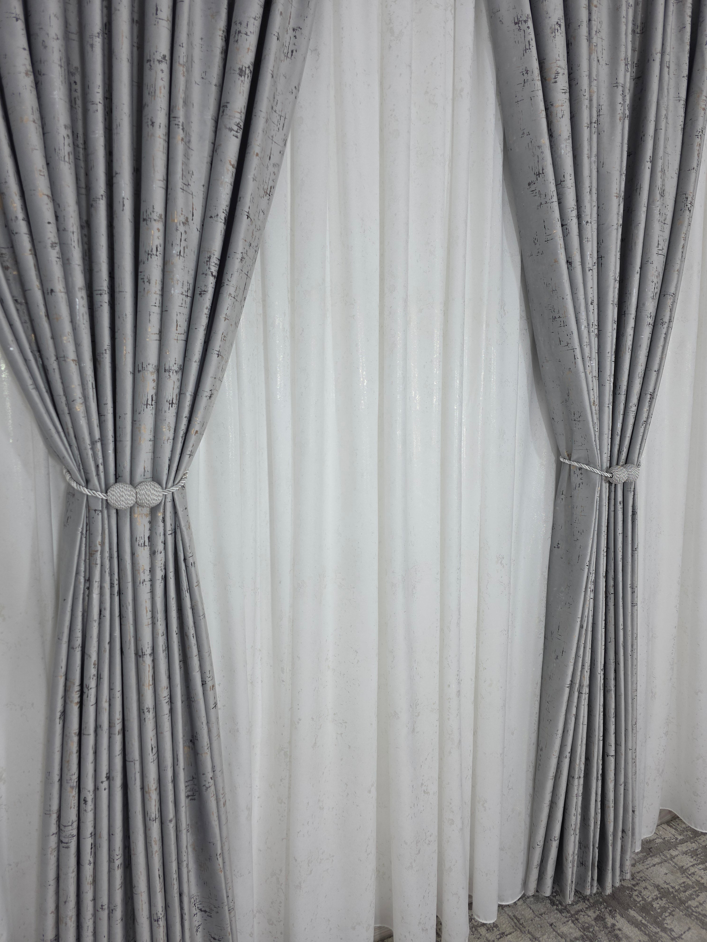 Setul cu perdea din mătase cu inserții aurii și draperie din catifea gri deschis transformă ferestrele în accente de eleganță și rafinament modern.