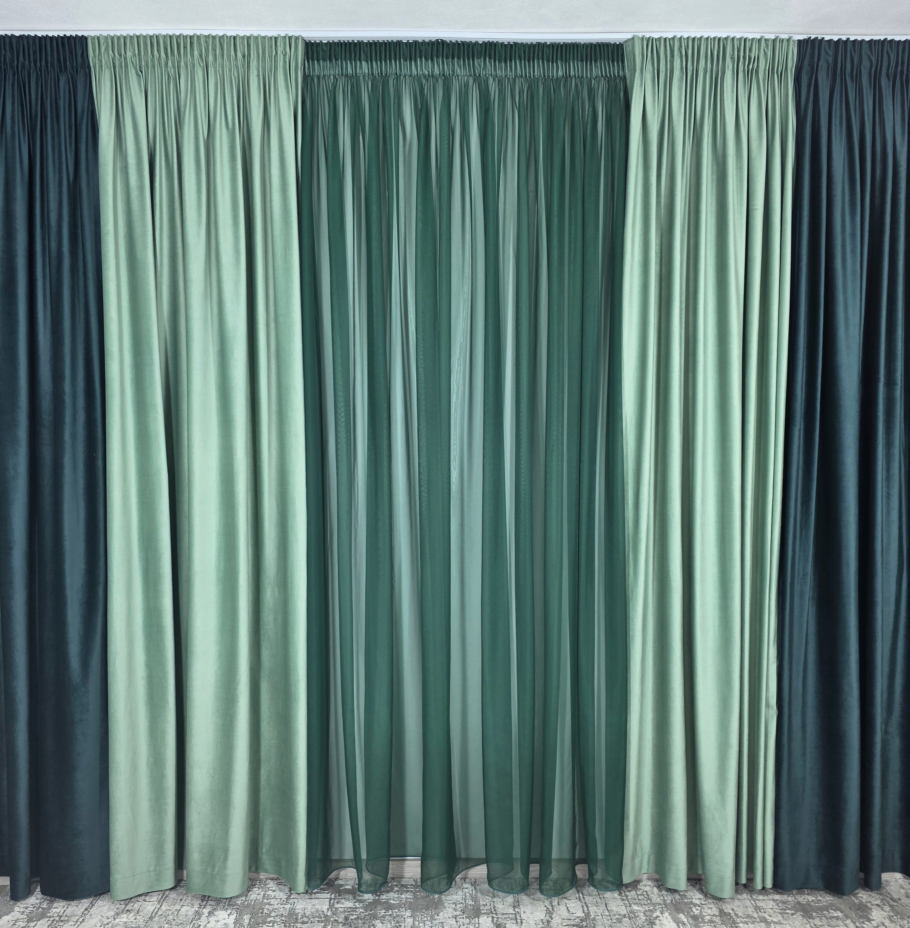 Un set modern și sofisticat, compus din perdea din voal verde smarald, fină și elegantă, și draperie din catifea în două culori – verde mentă și verde onix închis, ce aduce un contrast rafinat și plin de personalitate.