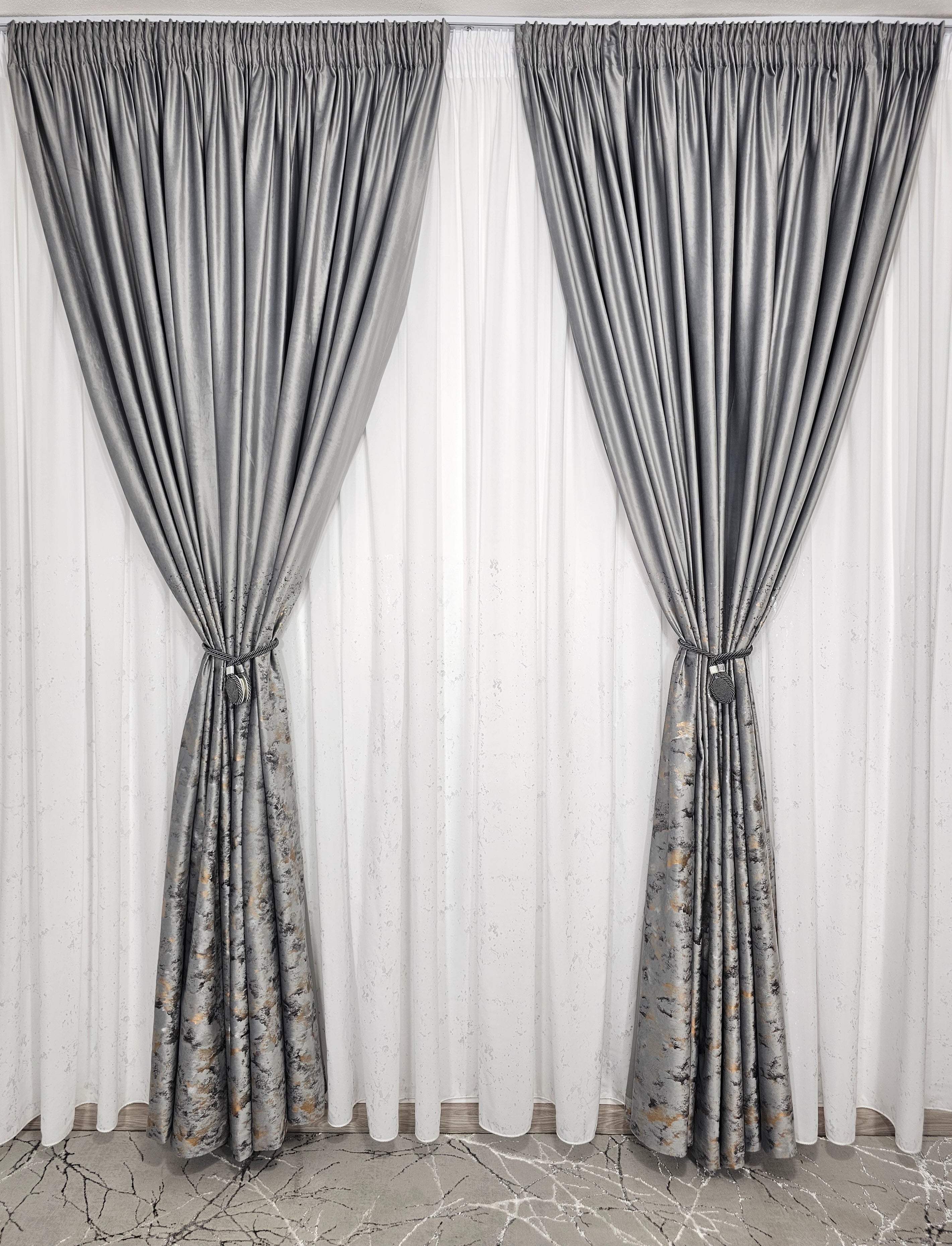 Perdea din Mătase cu Inserții Argintii și Draperie din Catifea cu Inserții – Gri ðŸ¤ðŸŒ«ï¸âœ¨