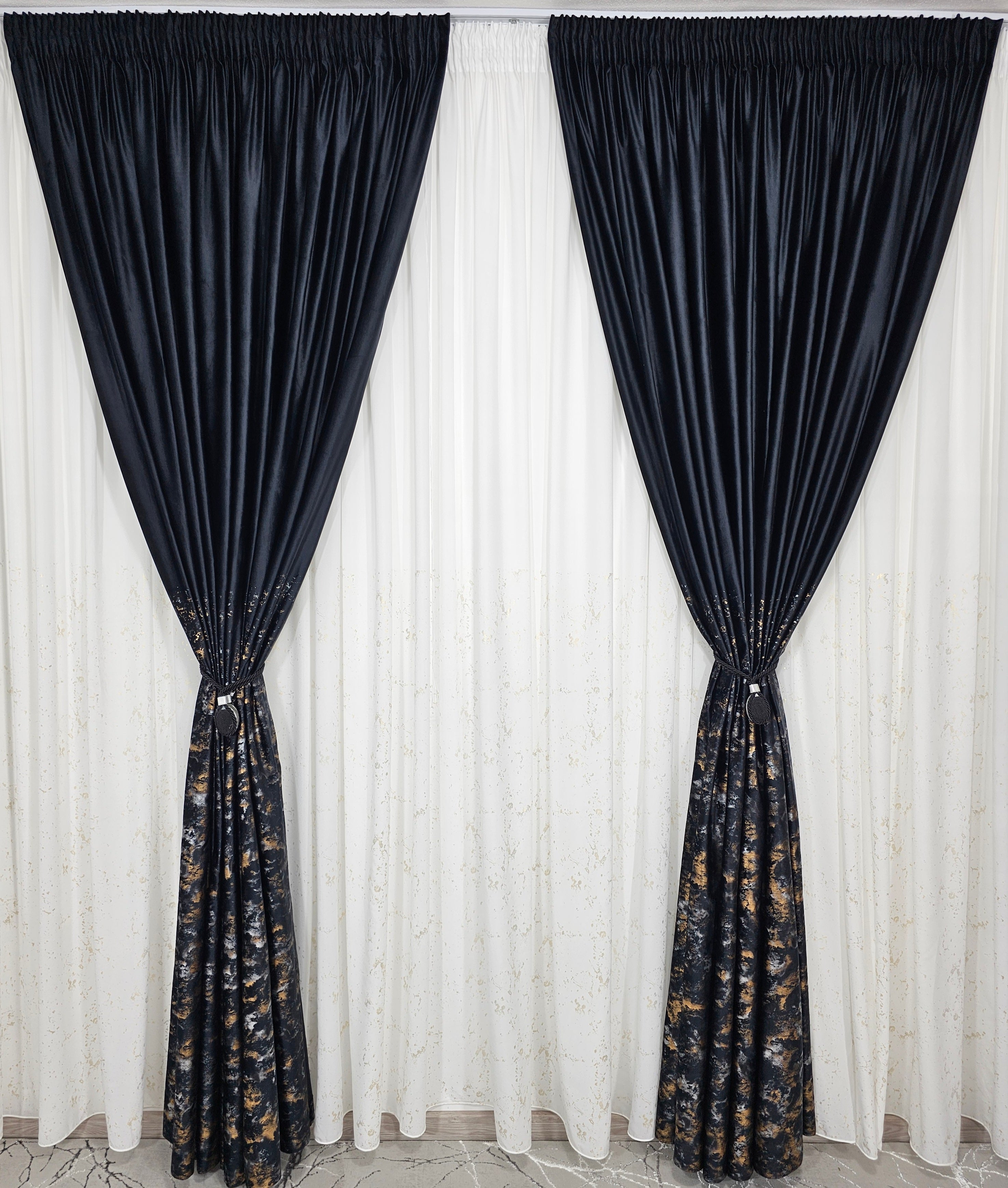 Un set elegant și sofisticat, alcătuit din perdea albă din material tip mătase cu inserții aurii discrete și draperie din catifea decorată cu inserții fine, ce adaugă strălucire și rafinament oricărui spațiu.
