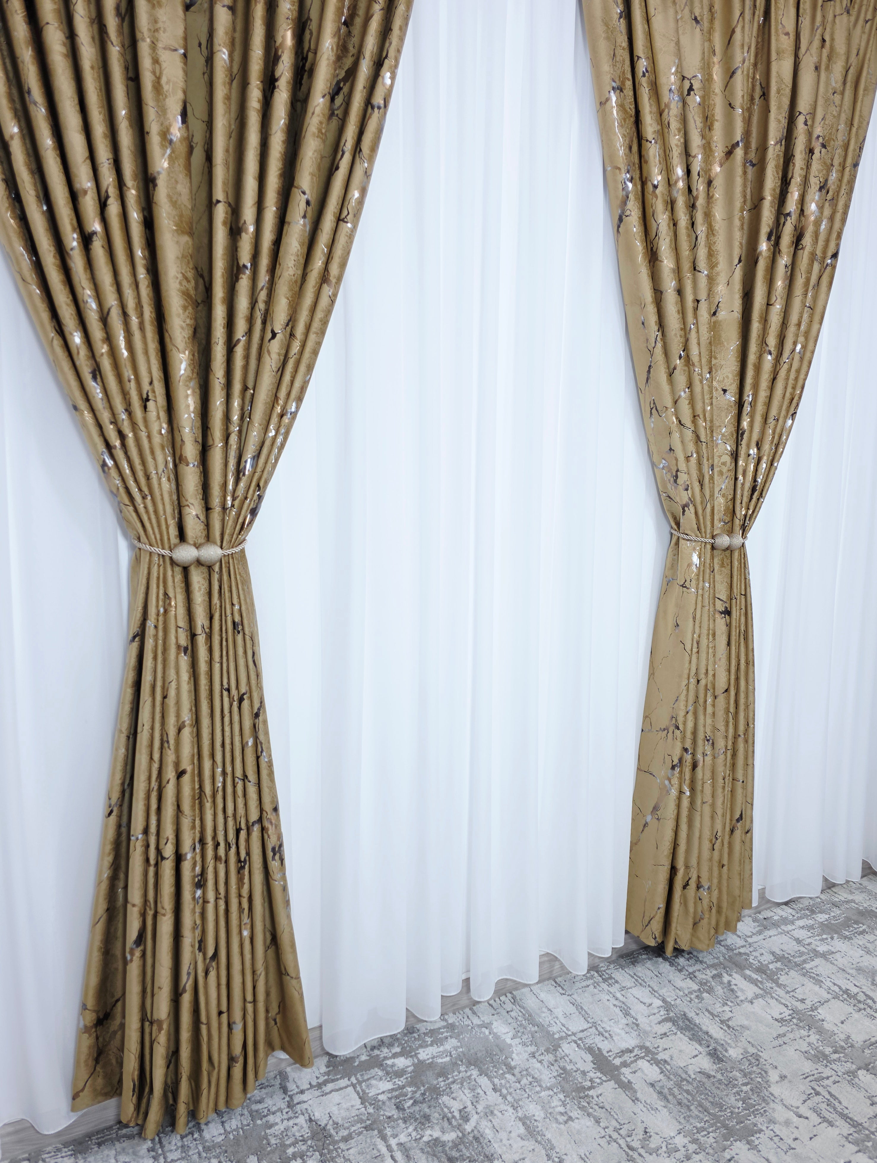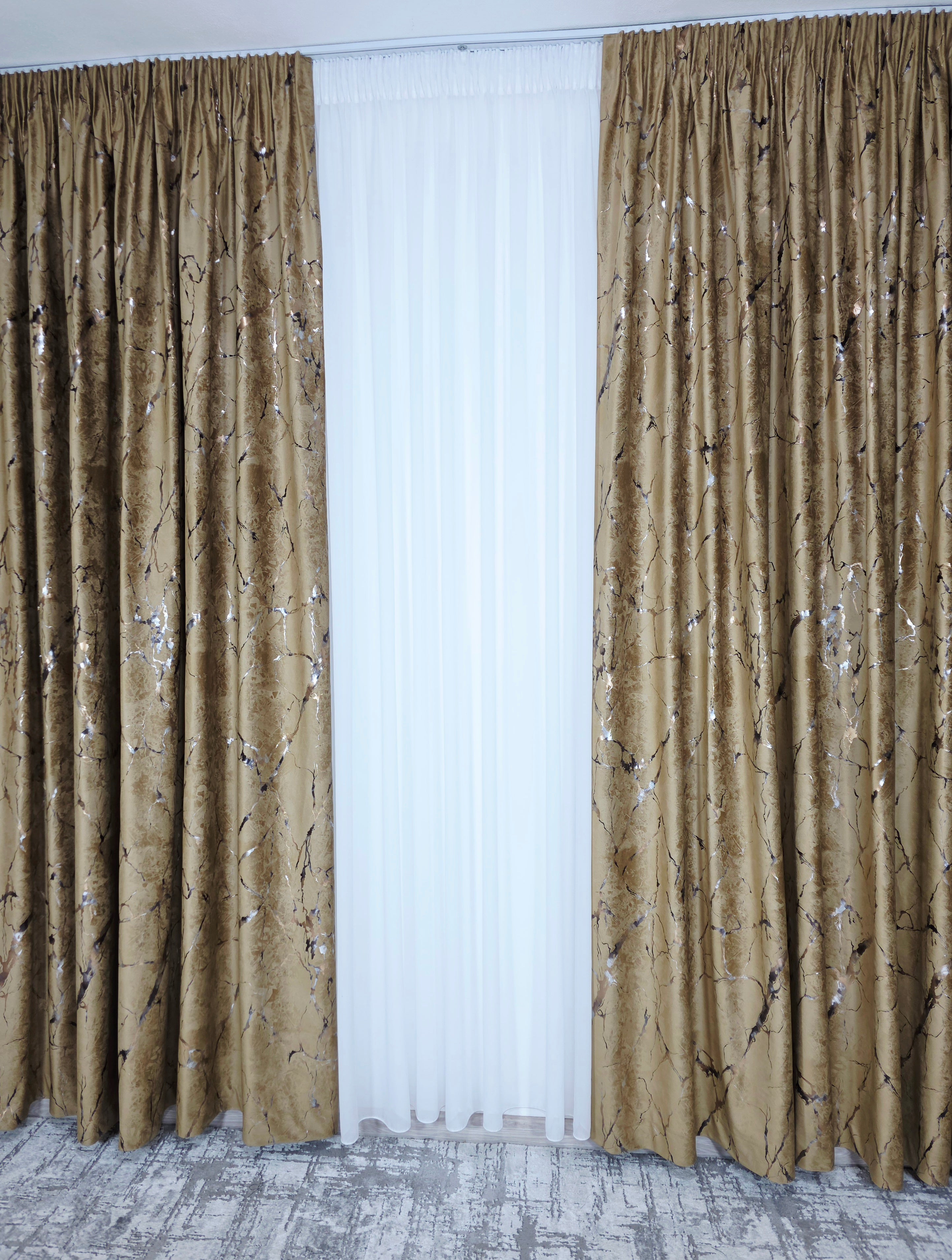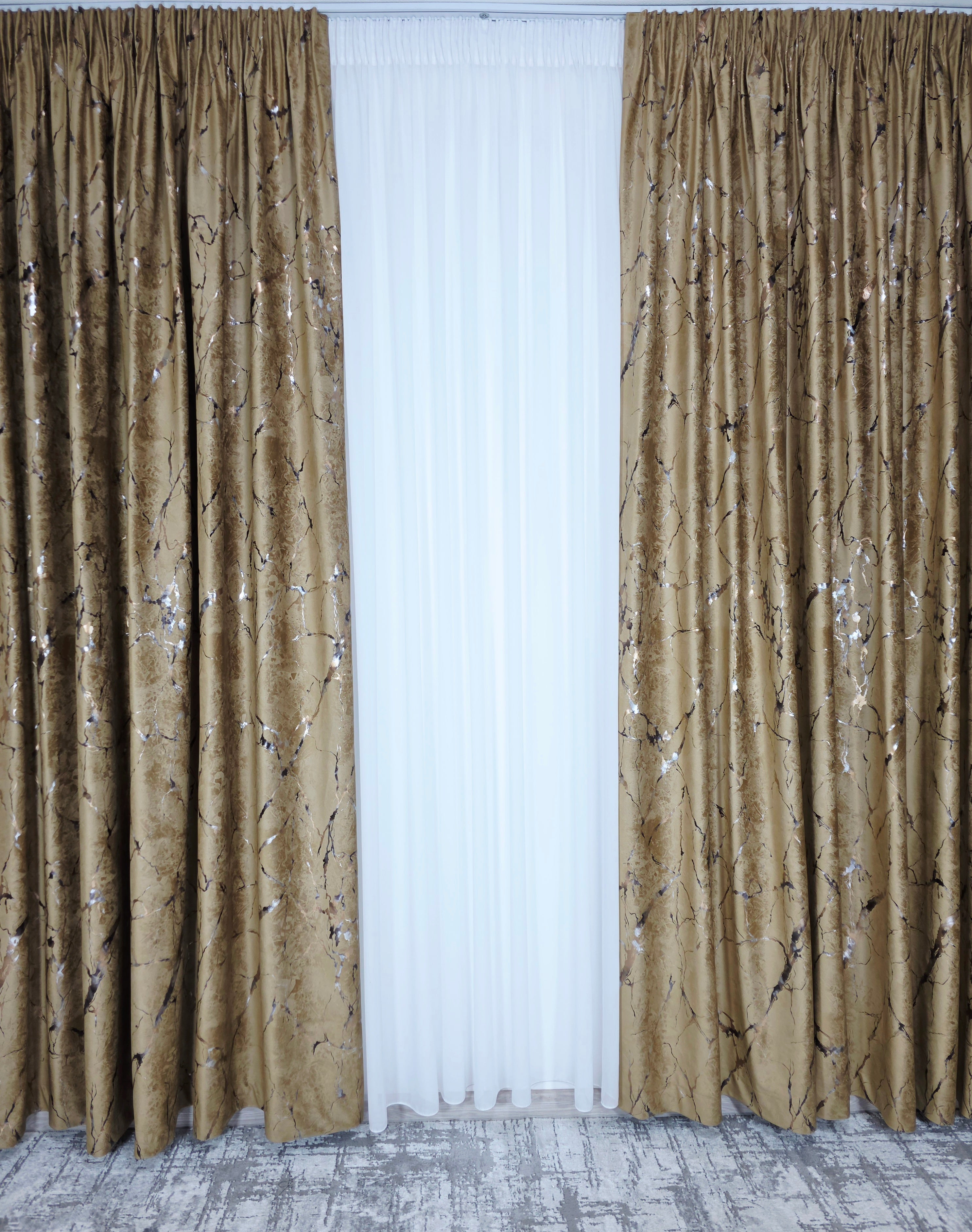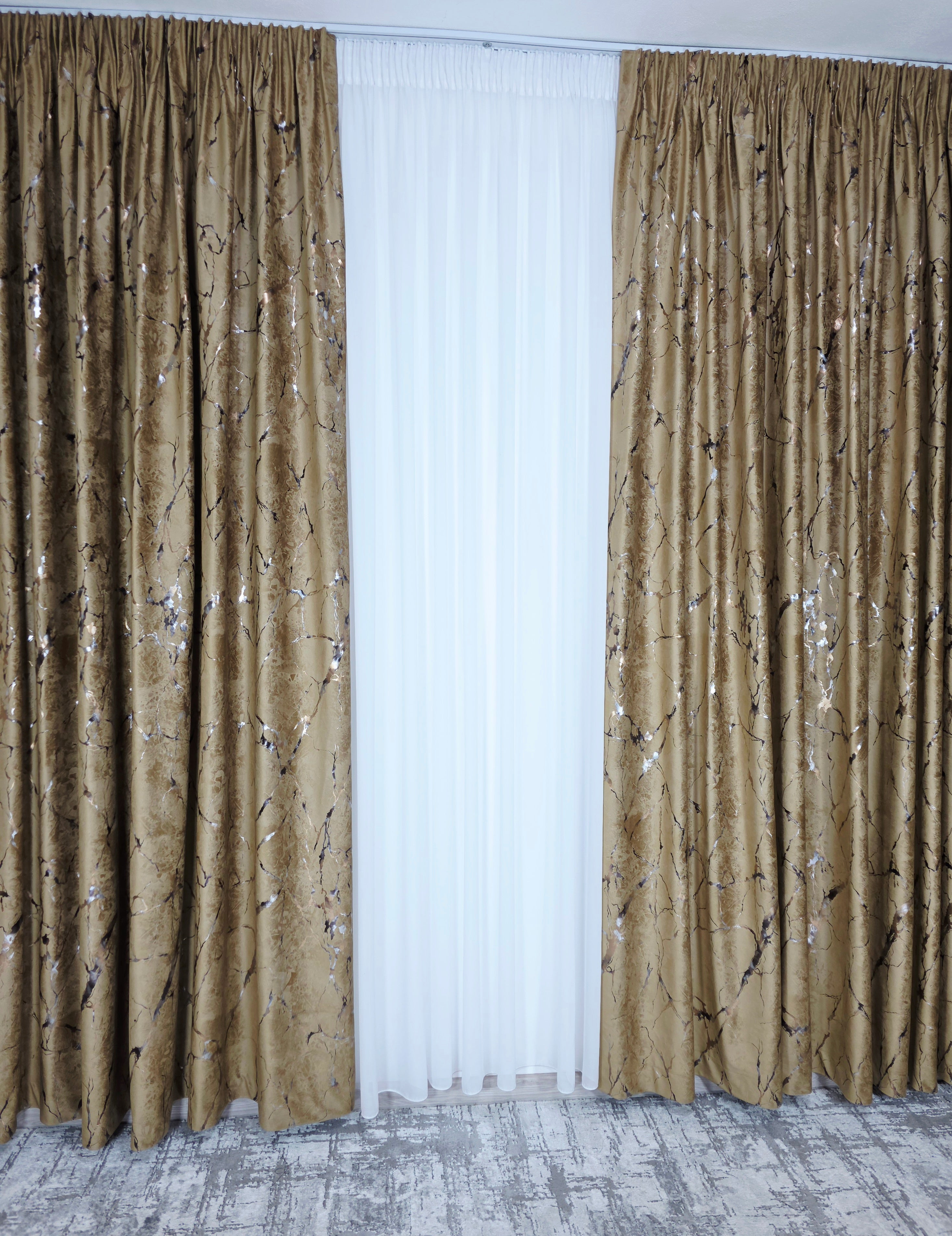 Colectia Amazon Varianta Auriu Bronz: Perdea Nesifonabila Matase Alb Imaculat și Draperie Catifea Cu Insertii Aurii