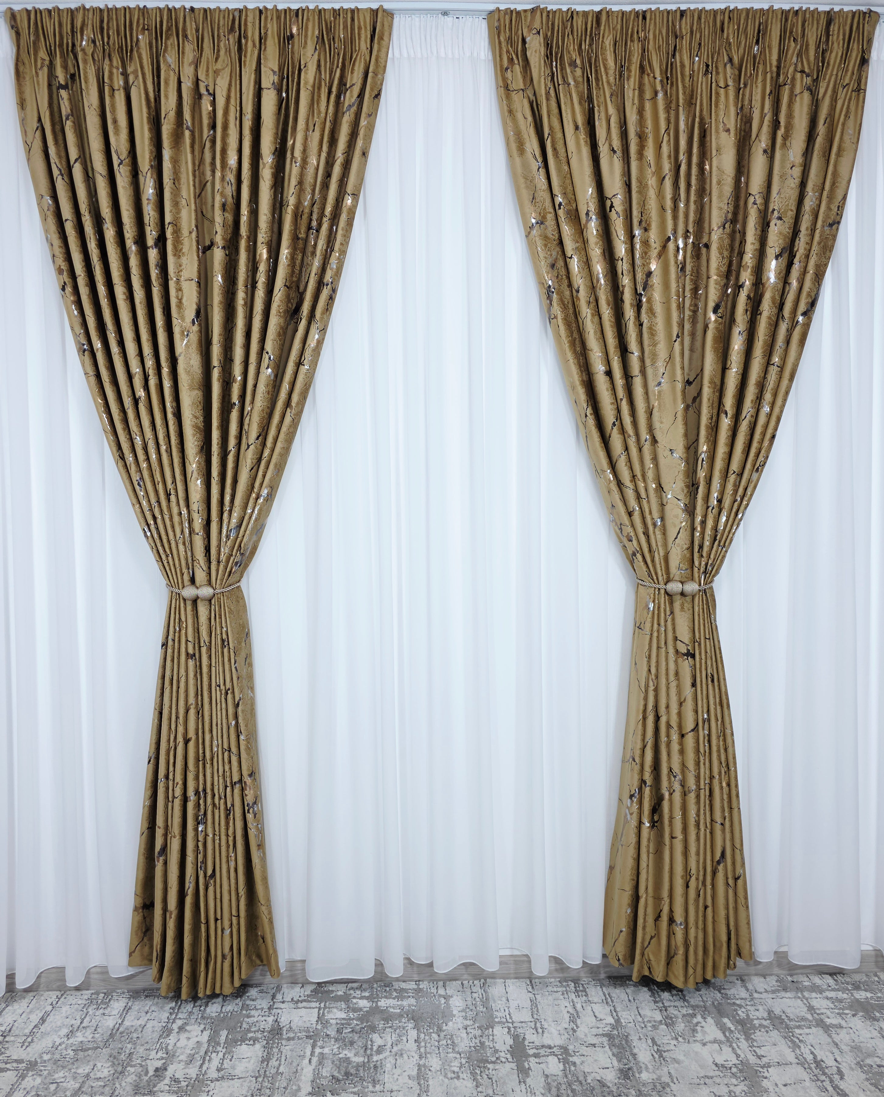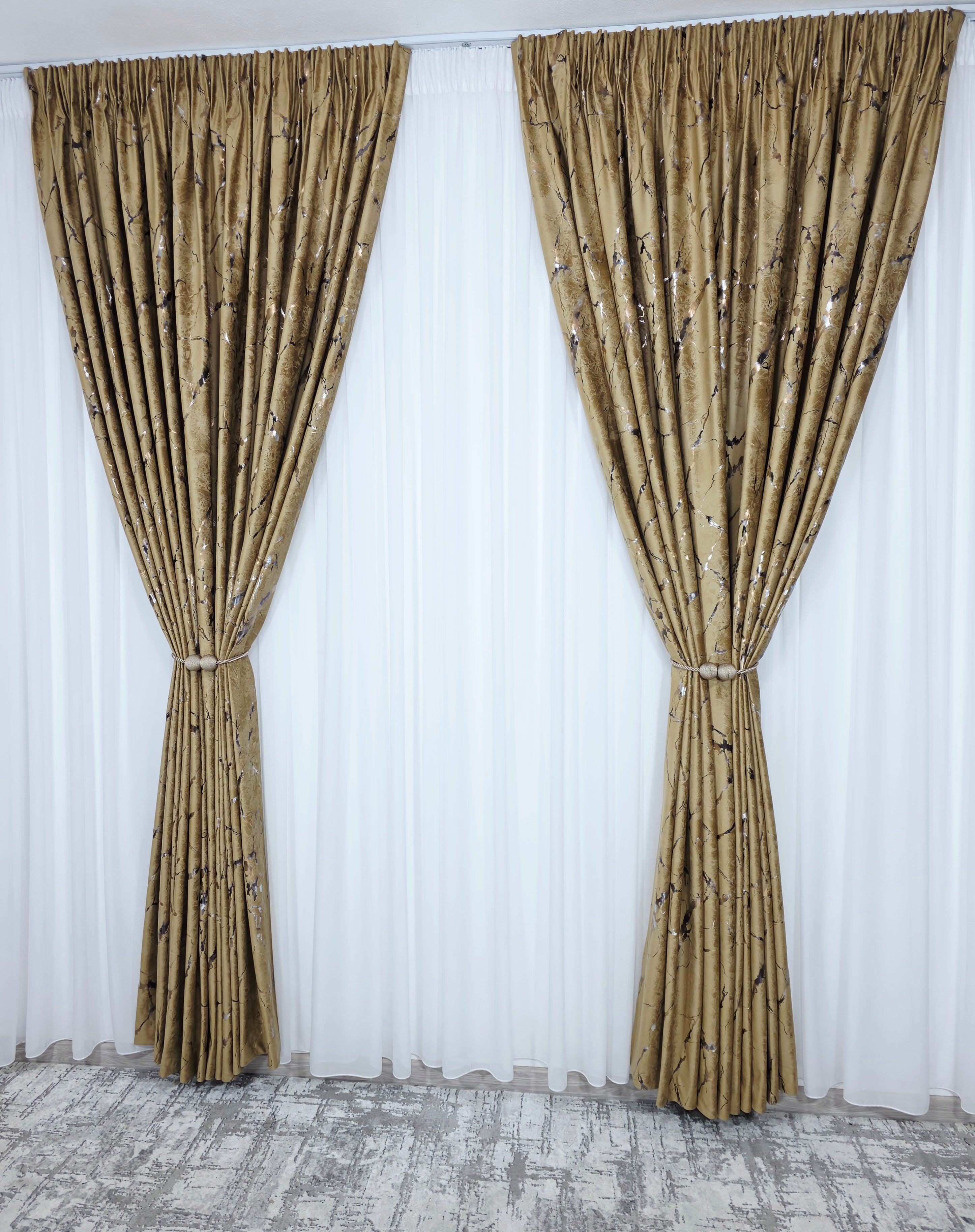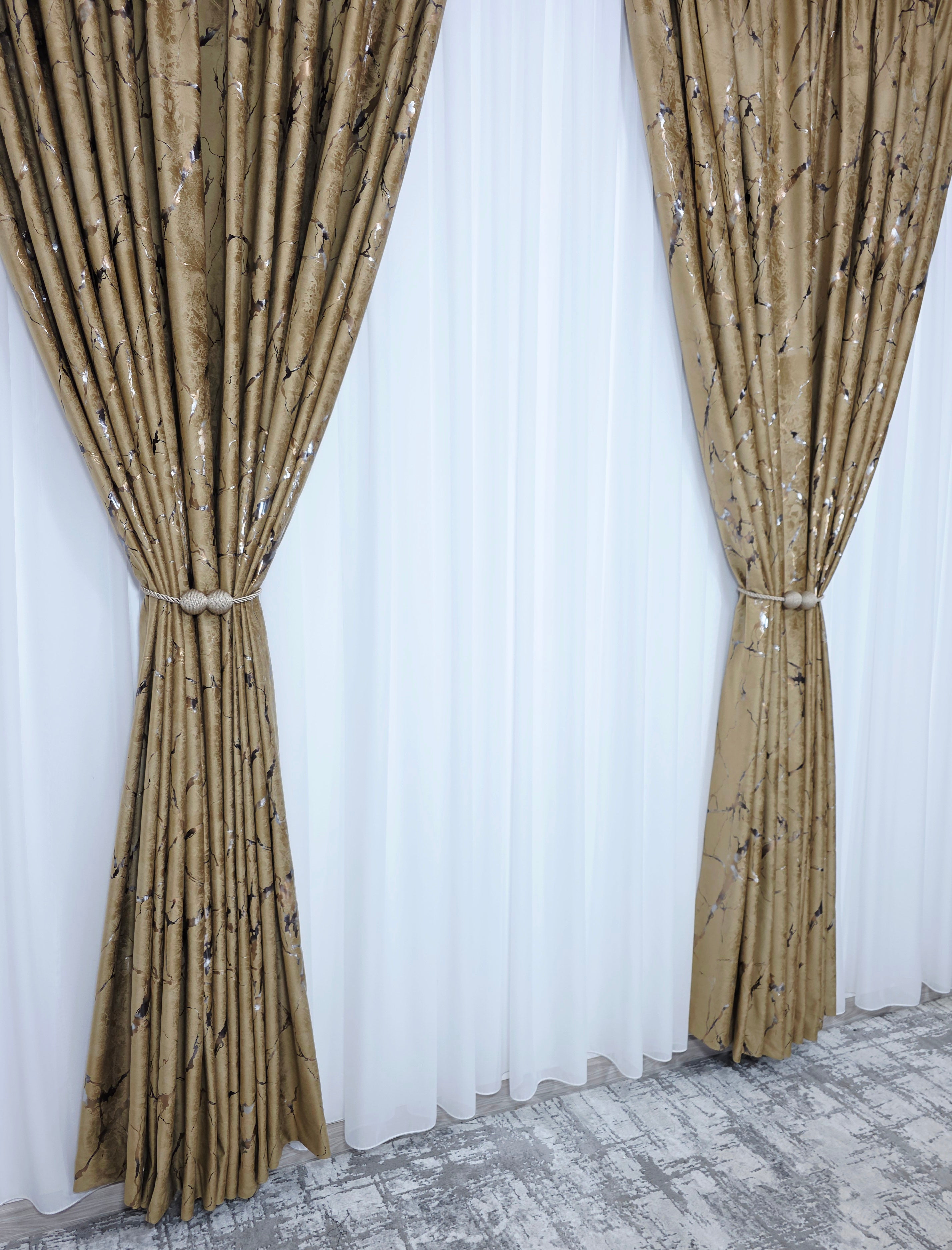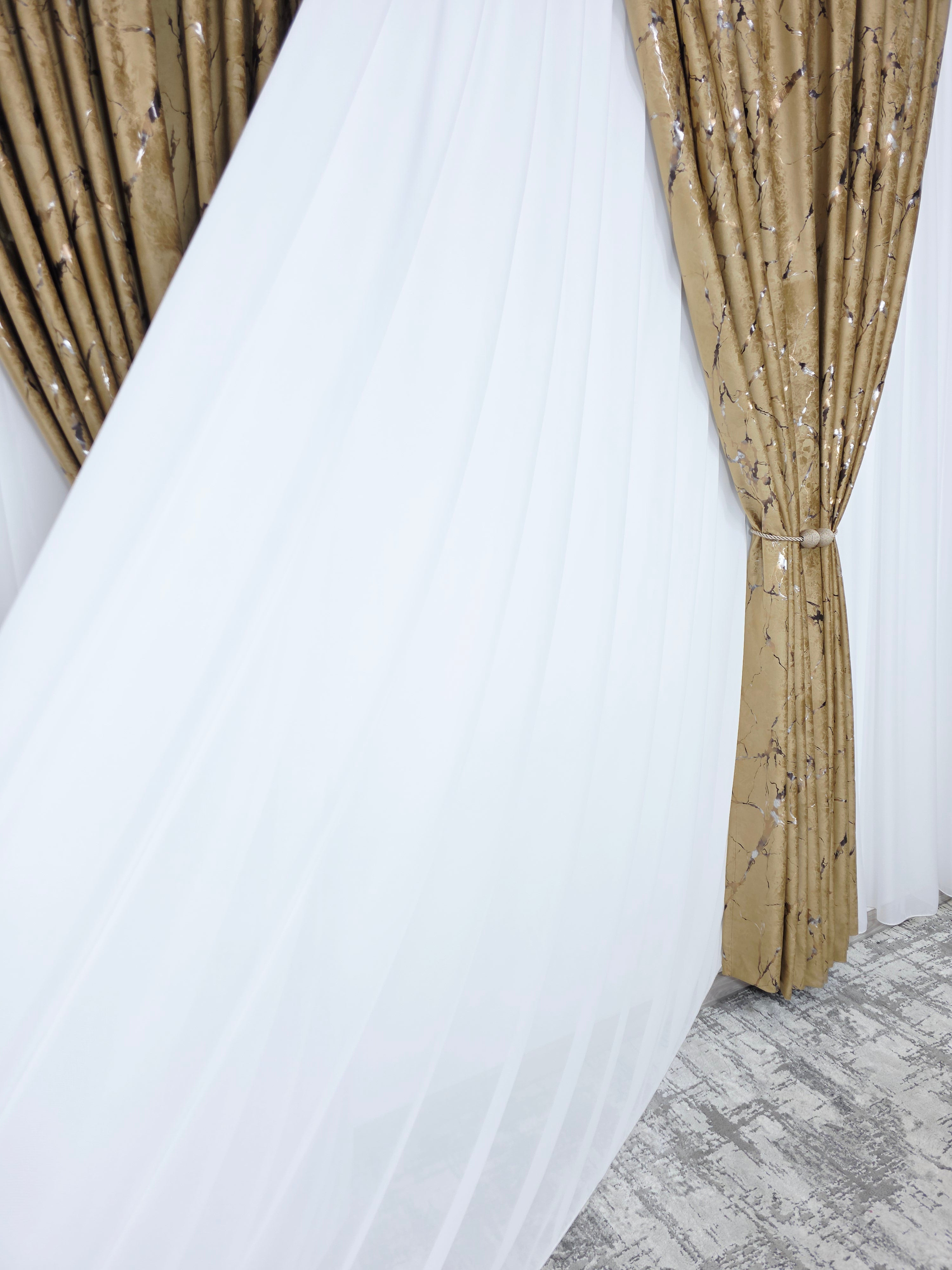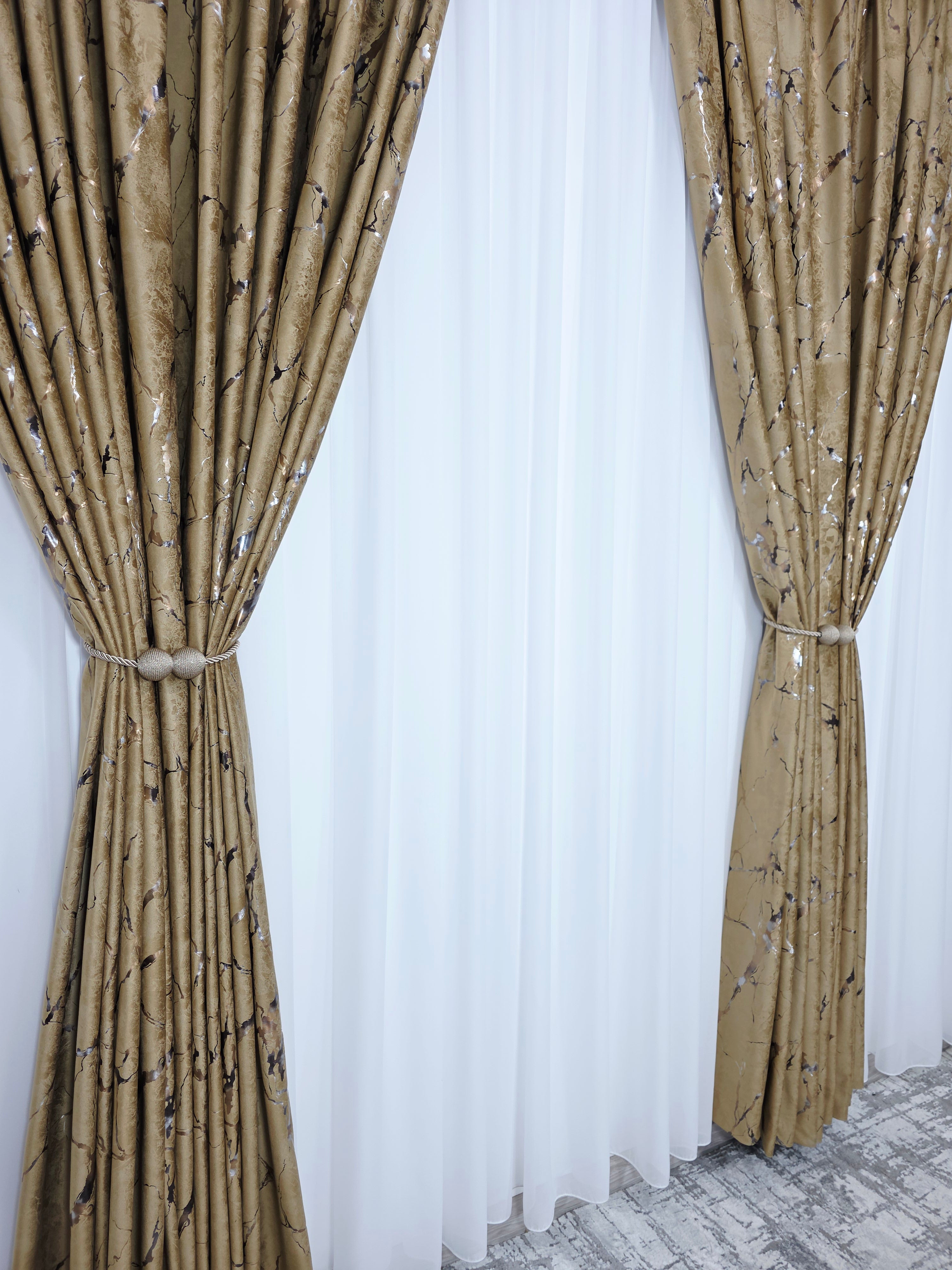Colectia Amazon Varianta Auriu Bronz: Perdea Nesifonabila Matase Alb Imaculat și Draperie Catifea Cu Insertii Aurii