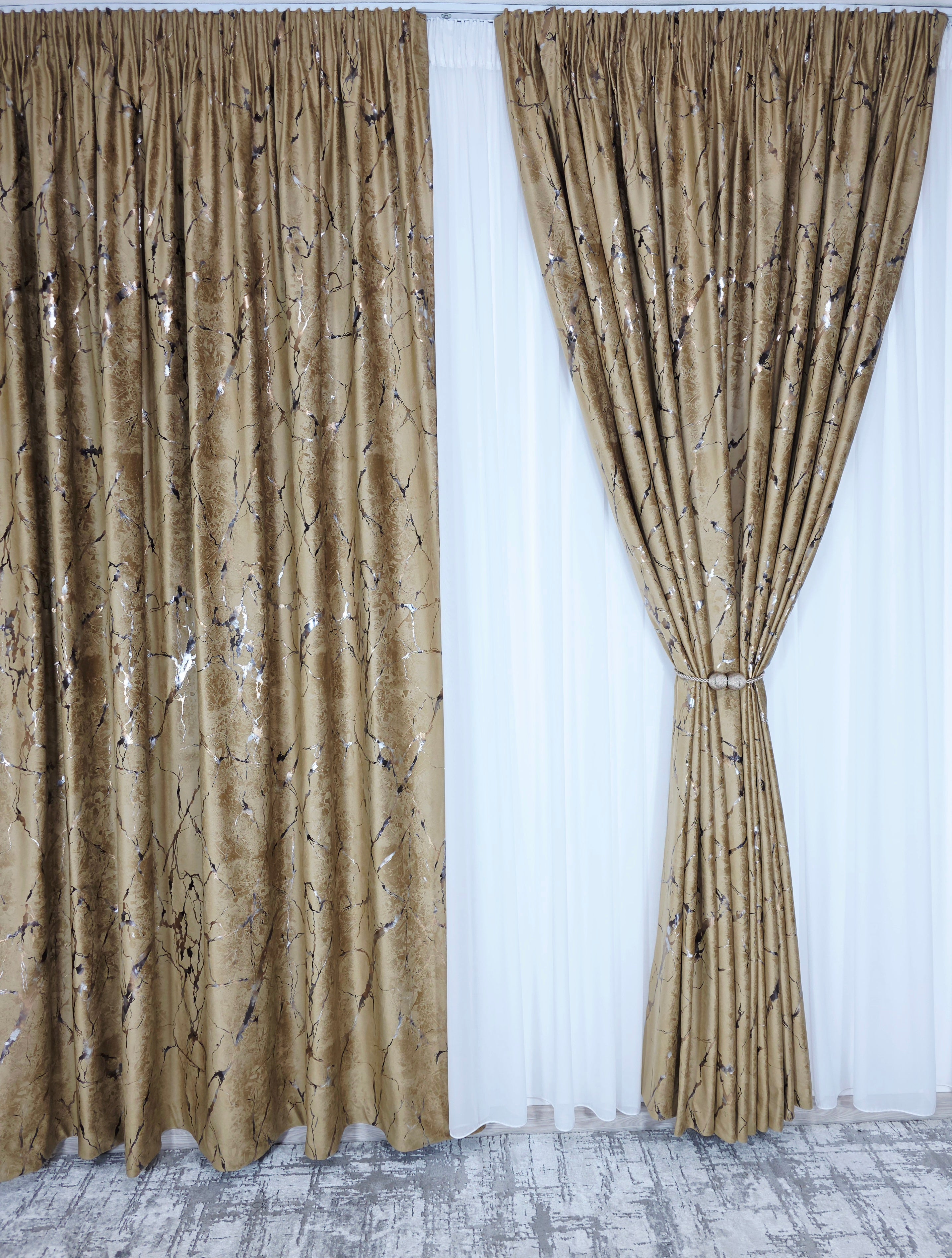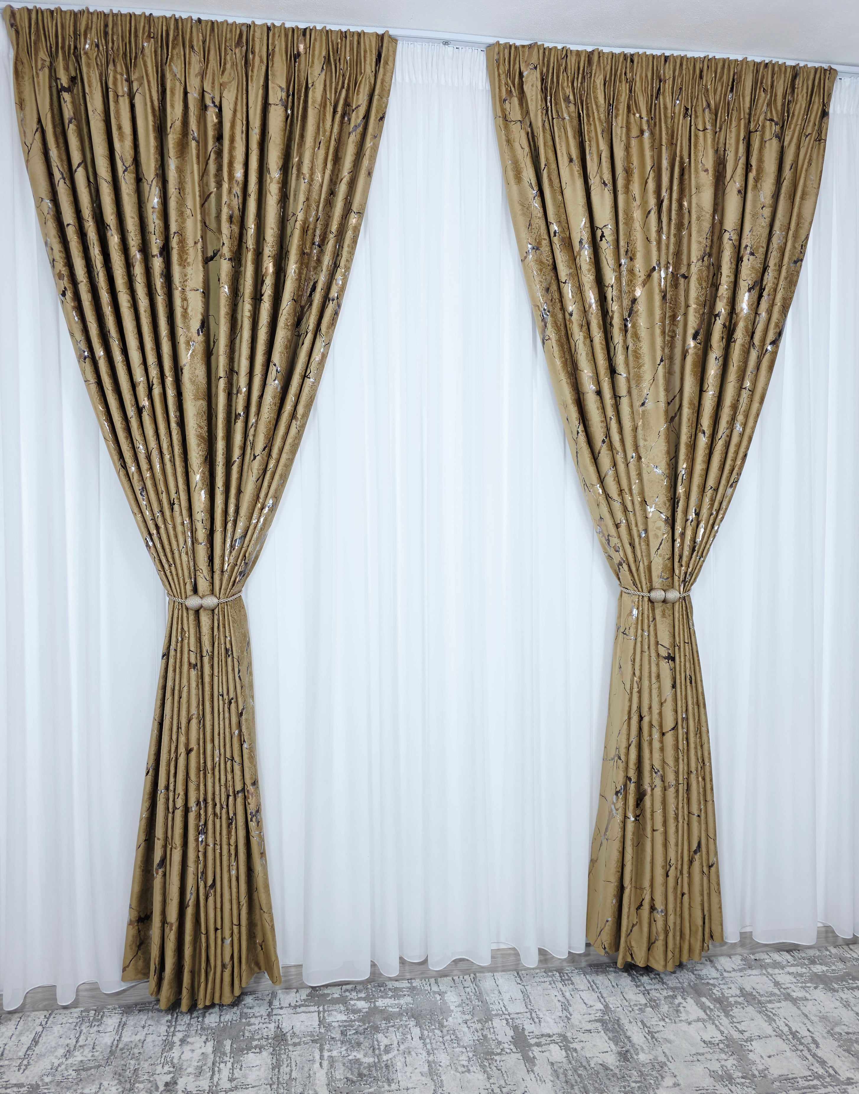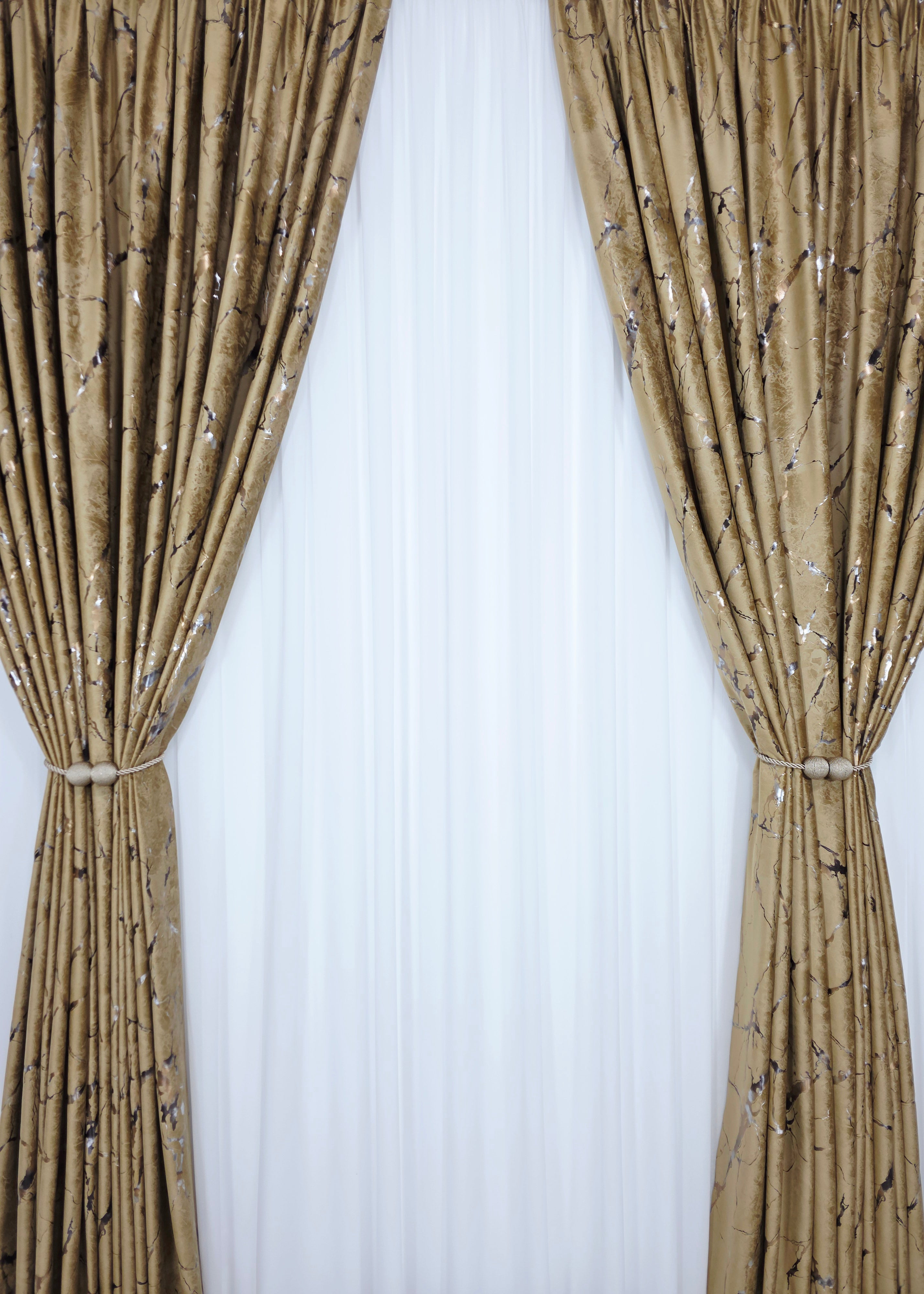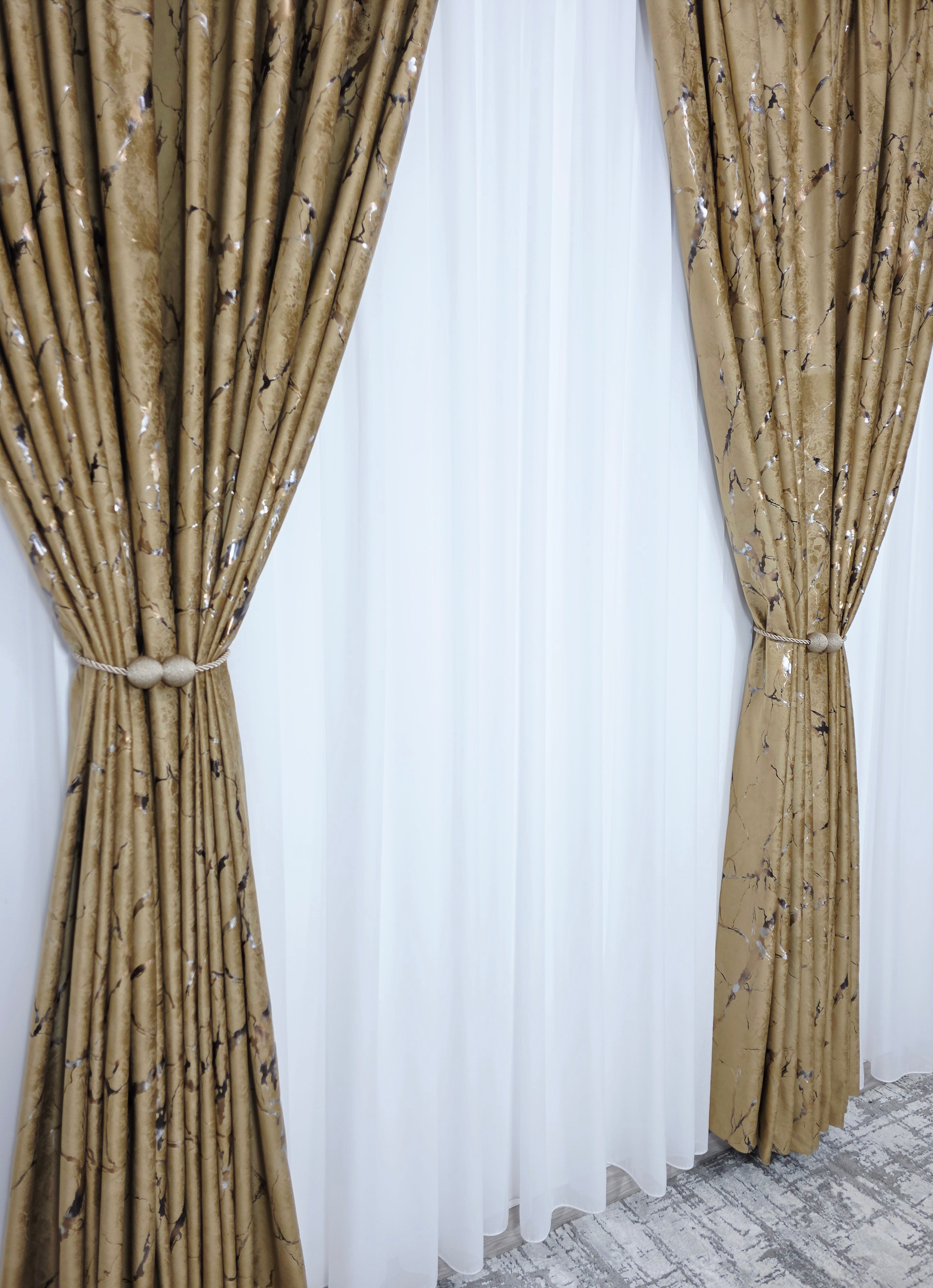 Colectia Amazon Varianta Auriu Bronz: Perdea Nesifonabila Matase Alb Imaculat și Draperie Catifea Cu Insertii Aurii