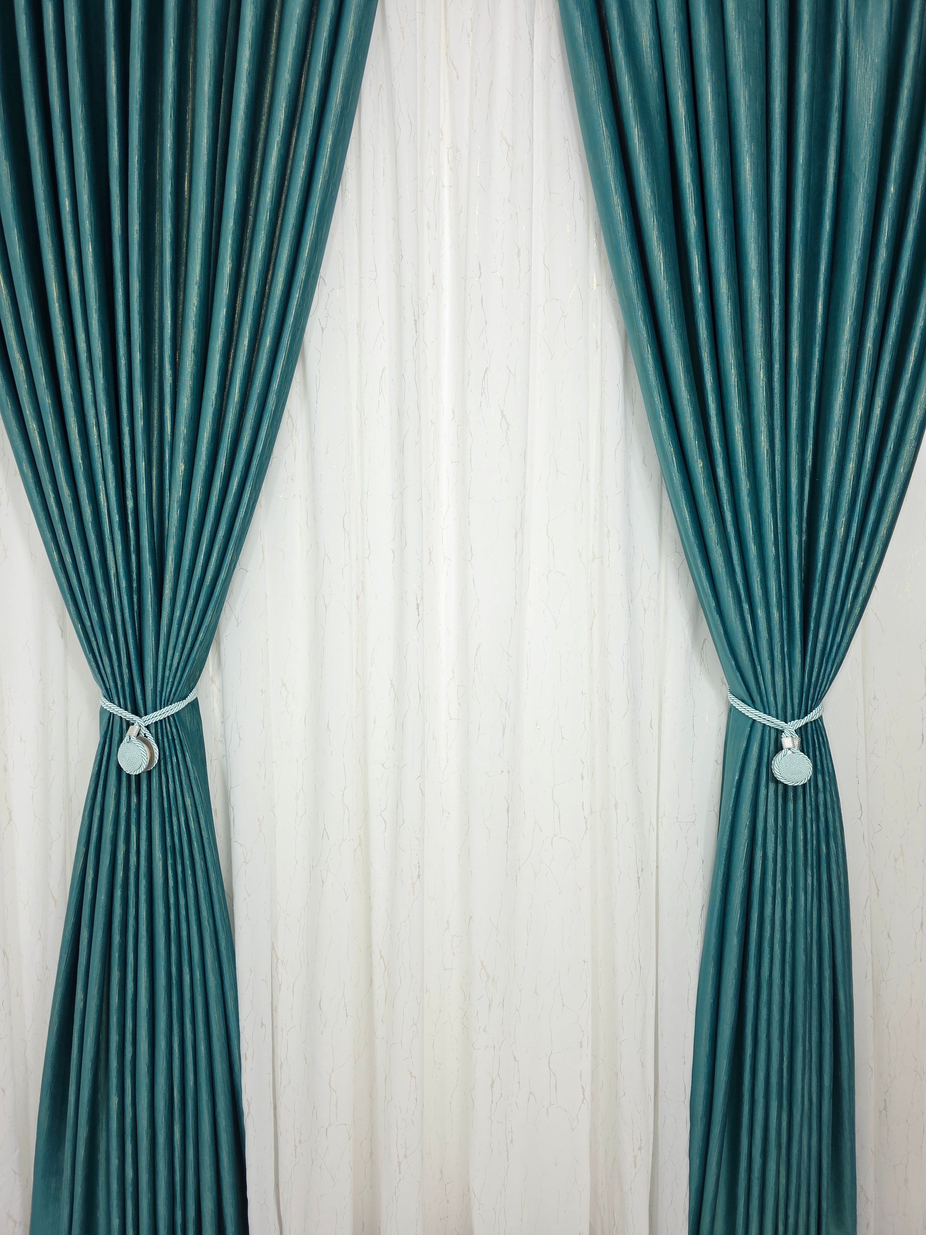Setul cu perdea din mătase cu inserții aurii și draperie din catifea gri deschis transformă ferestrele în accente de eleganță și rafinament modern.