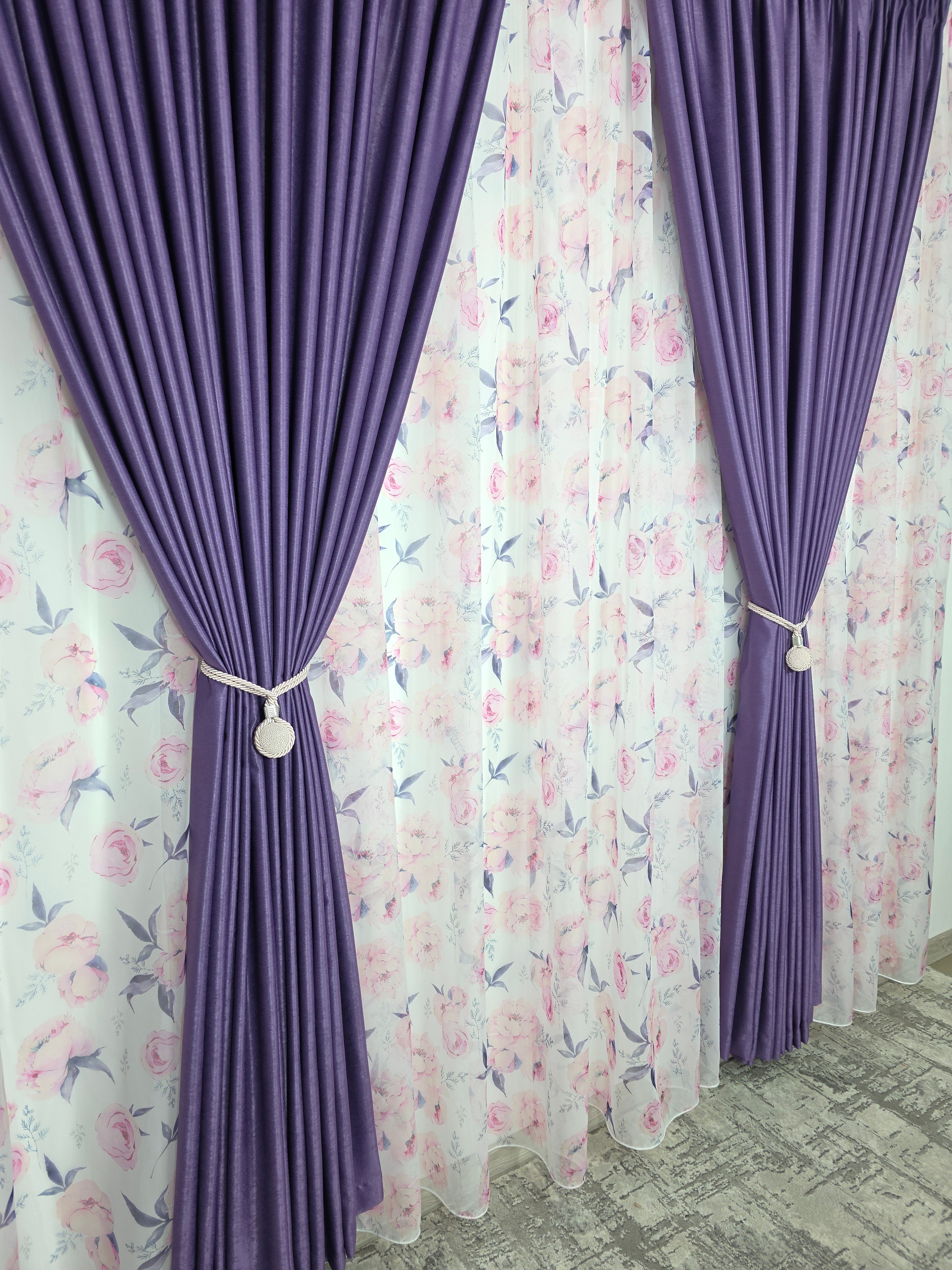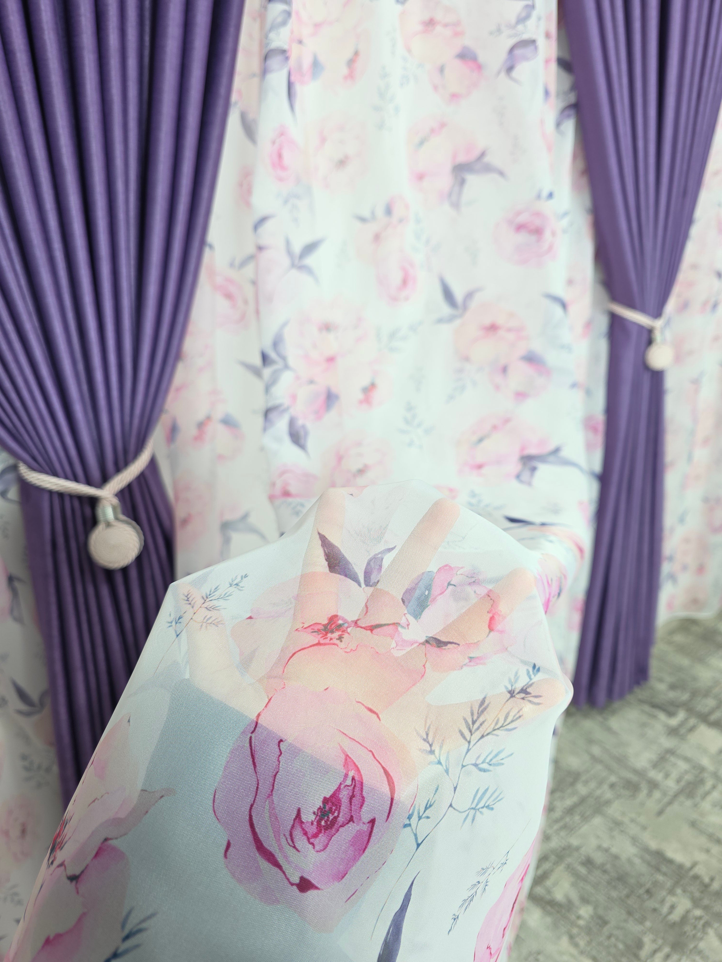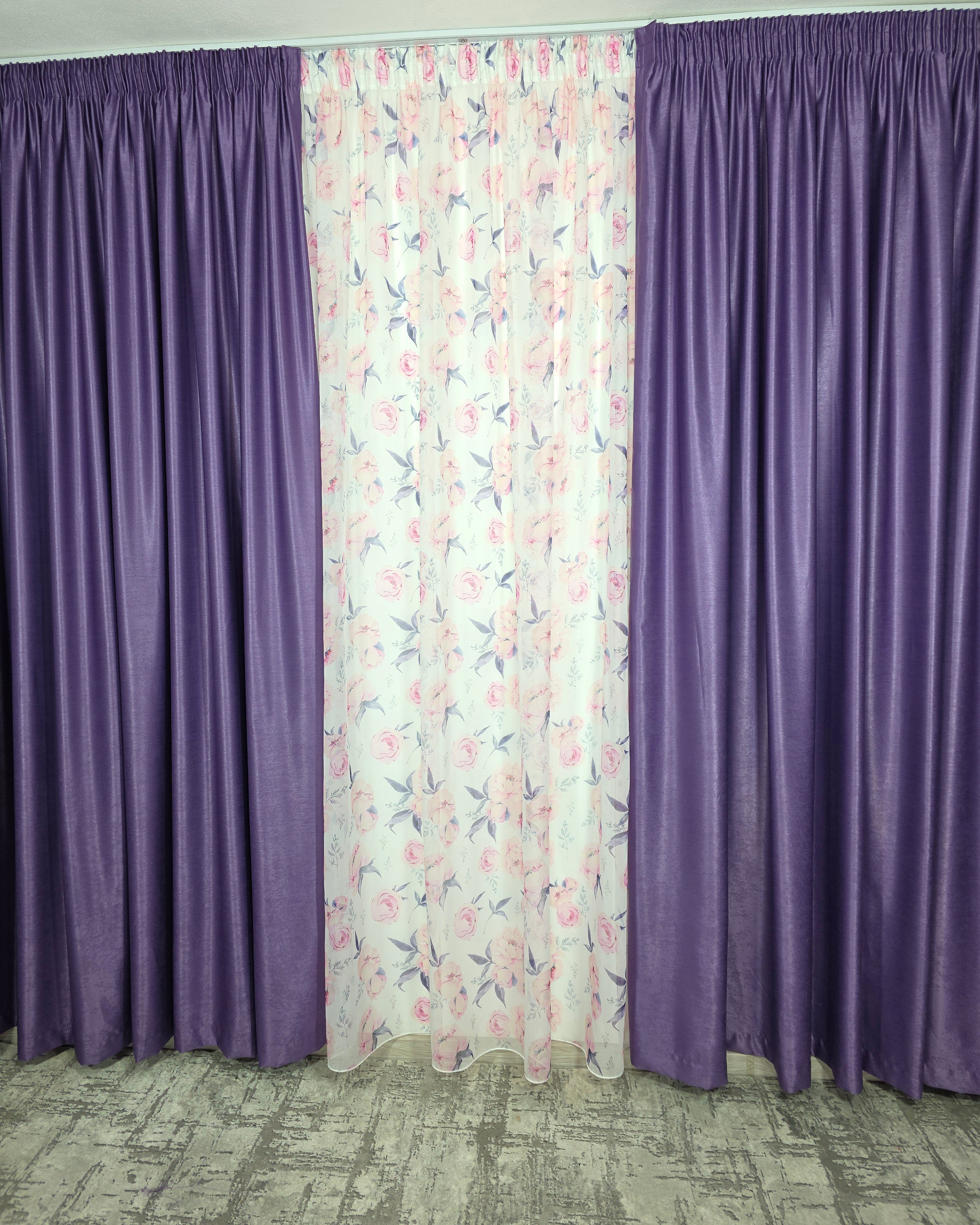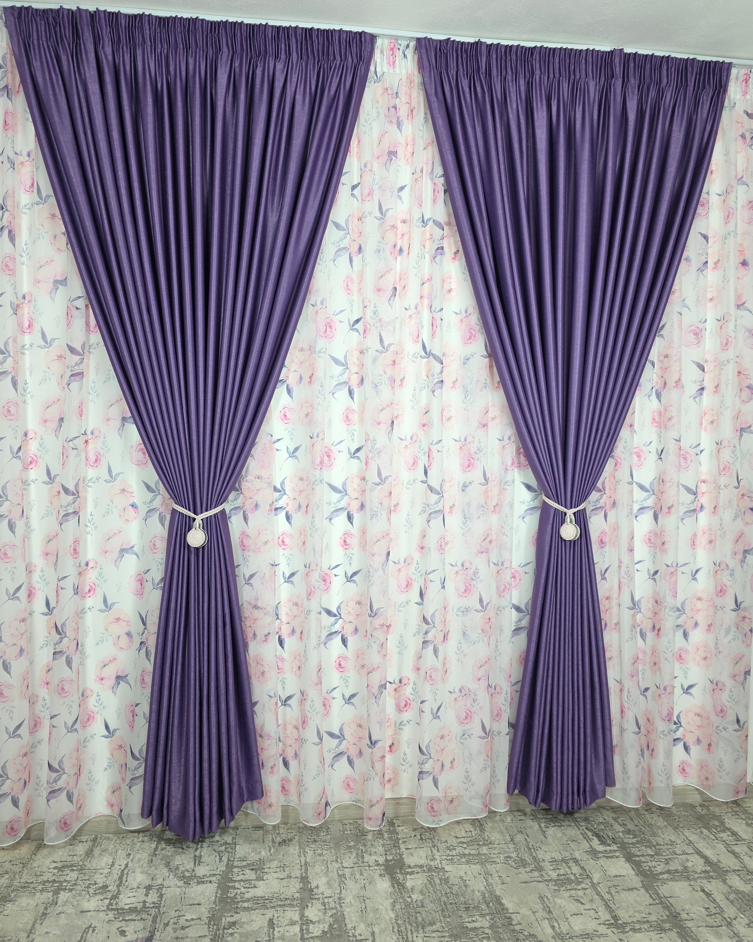 Acest set este gândit pentru interioare care caută lumină, feminitate și echilibru cromatic. Perdeaua din voal fin cu model floral aduce un aer proaspăt și romantic, filtrând lumina într-un mod plăcut, în timp ce draperia soft mov semi-opacă completează spațiul cu o notă calmă, elegantă și relaxantă.