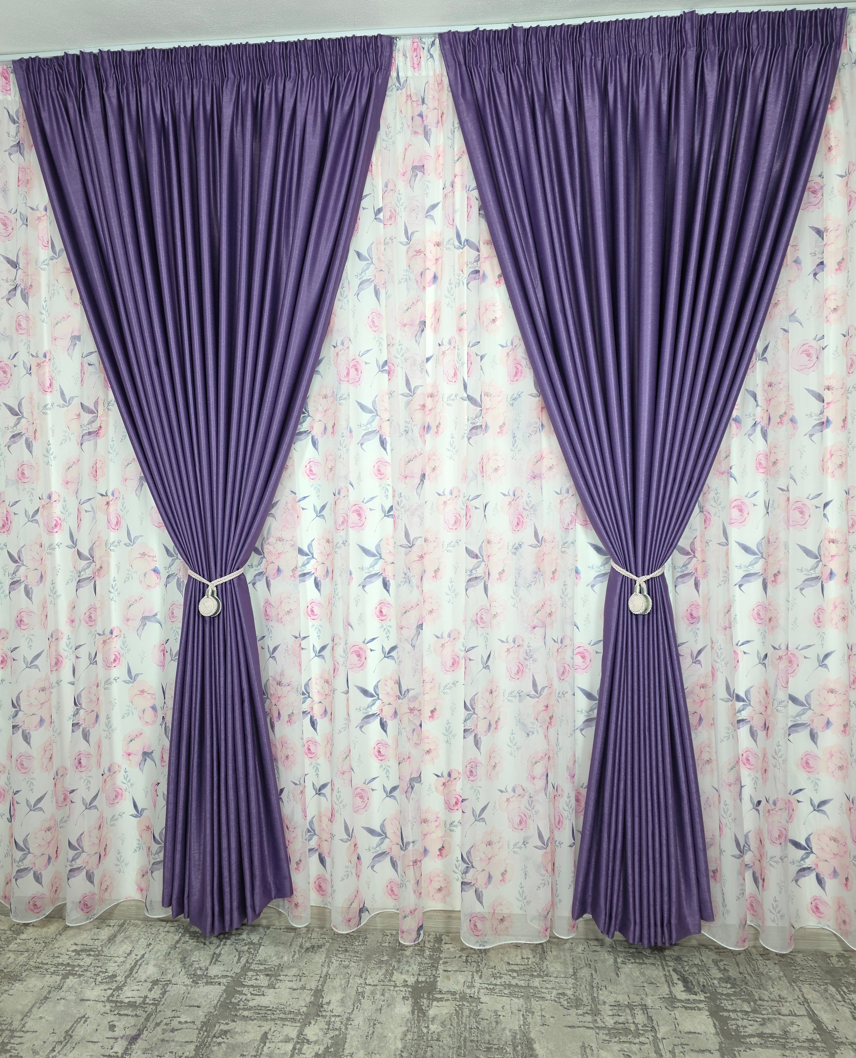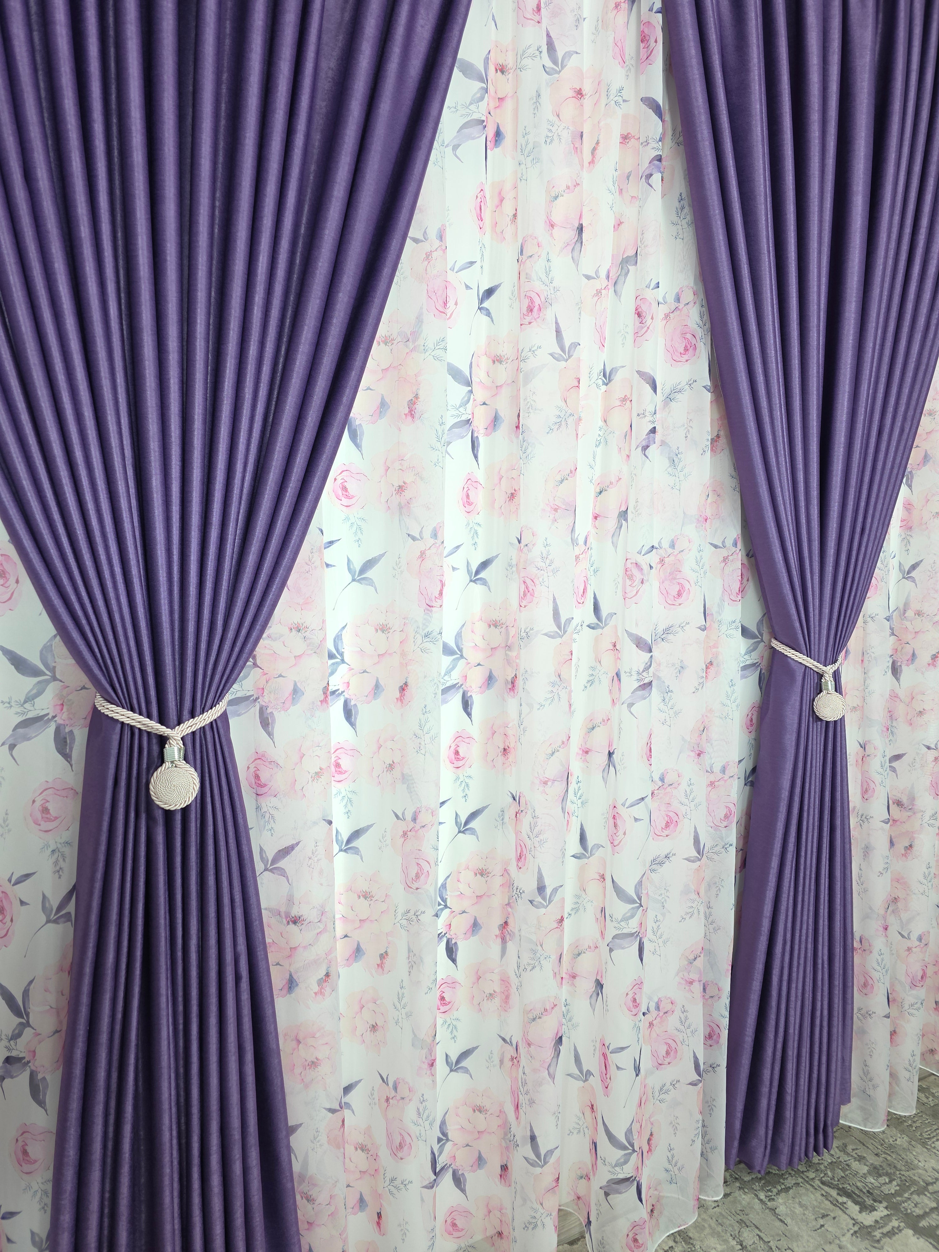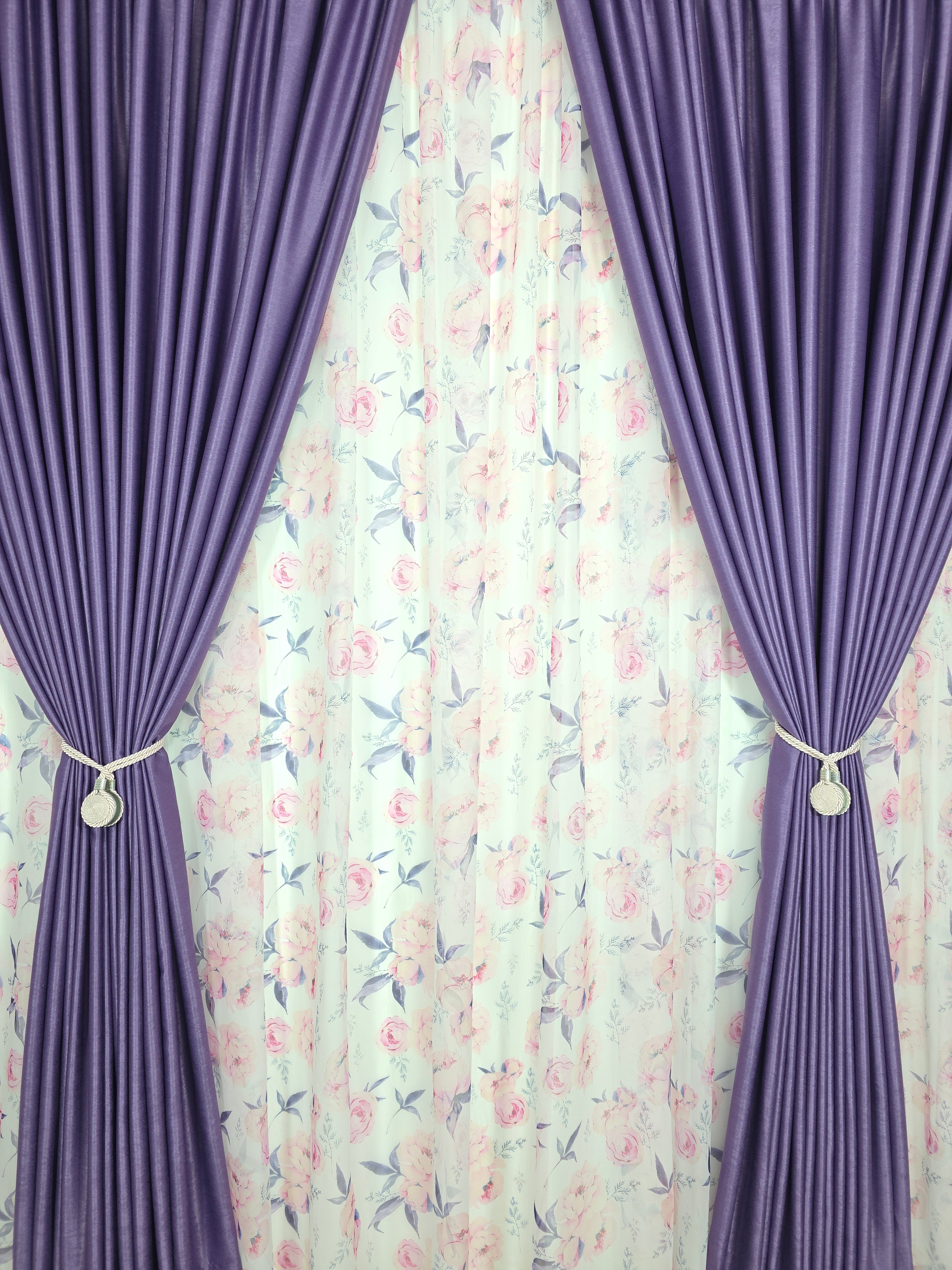 Acest set este gândit pentru interioare care caută lumină, feminitate și echilibru cromatic. Perdeaua din voal fin cu model floral aduce un aer proaspăt și romantic, filtrând lumina într-un mod plăcut, în timp ce draperia soft mov semi-opacă completează spațiul cu o notă calmă, elegantă și relaxantă.