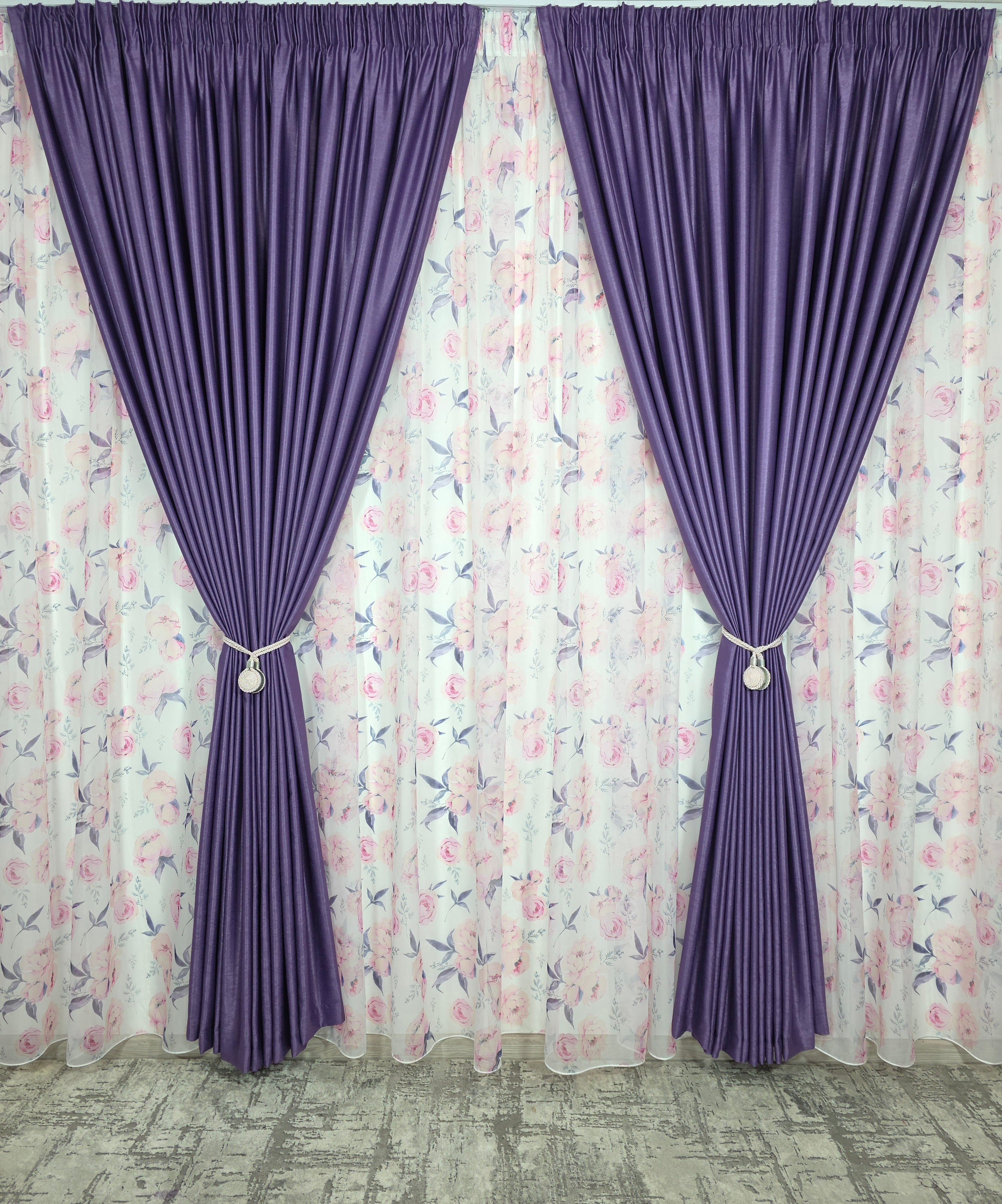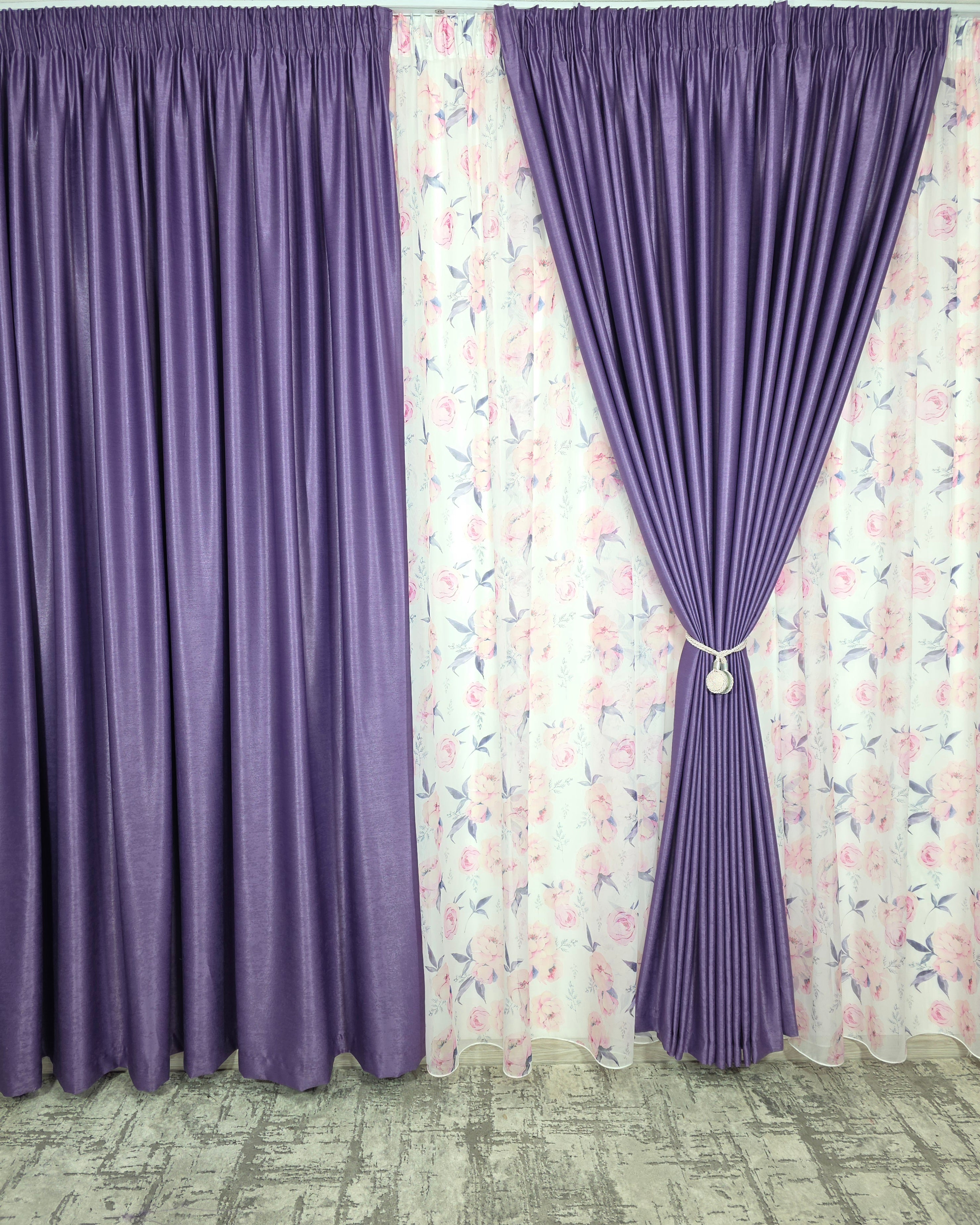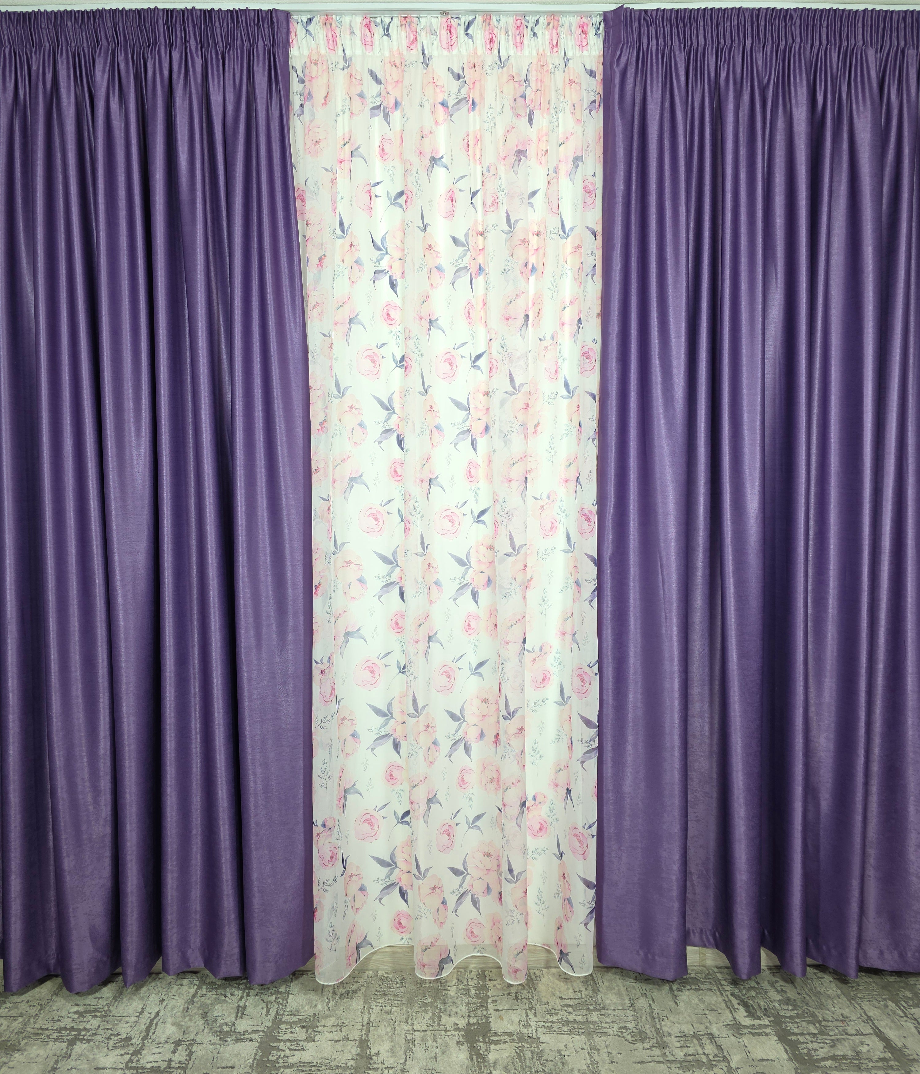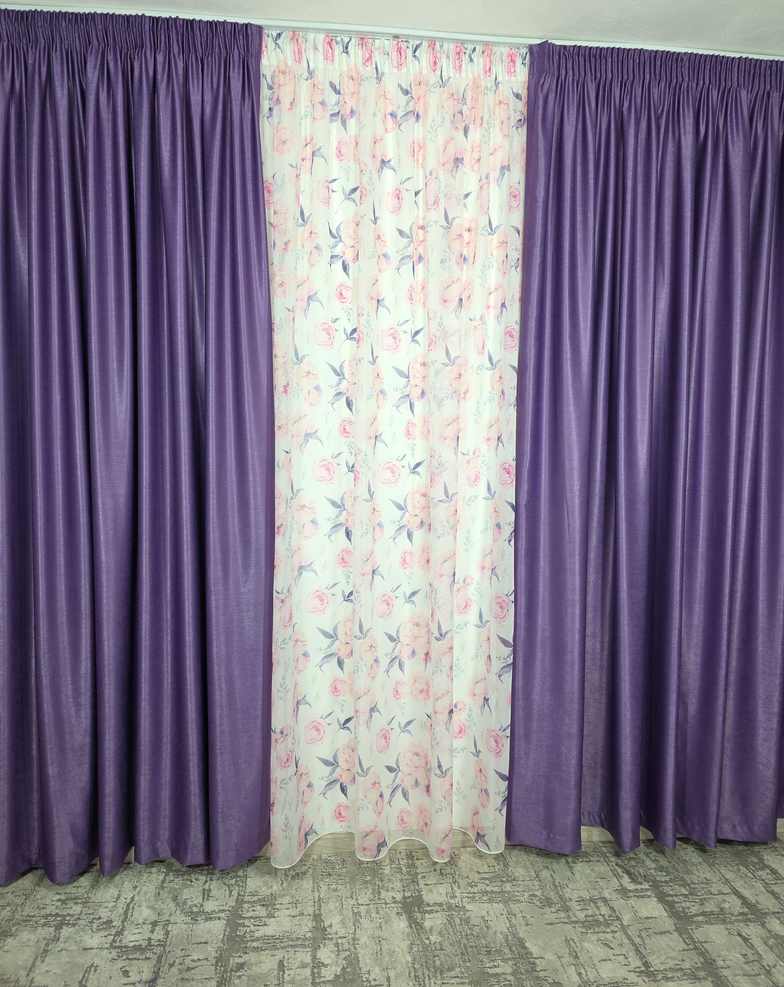 Acest set este gândit pentru interioare care caută lumină, feminitate și echilibru cromatic. Perdeaua din voal fin cu model floral aduce un aer proaspăt și romantic, filtrând lumina într-un mod plăcut, în timp ce draperia soft mov semi-opacă completează spațiul cu o notă calmă, elegantă și relaxantă.