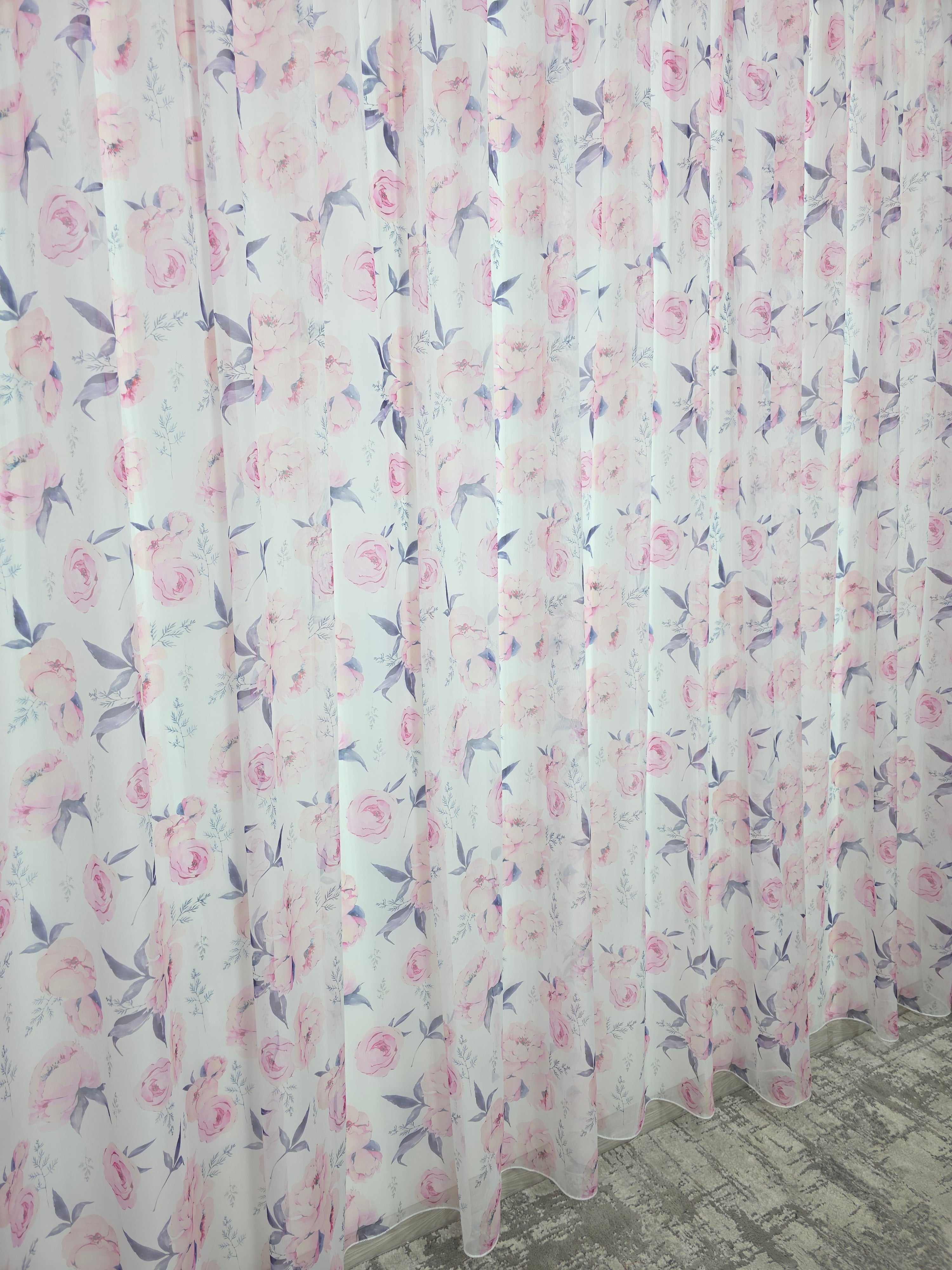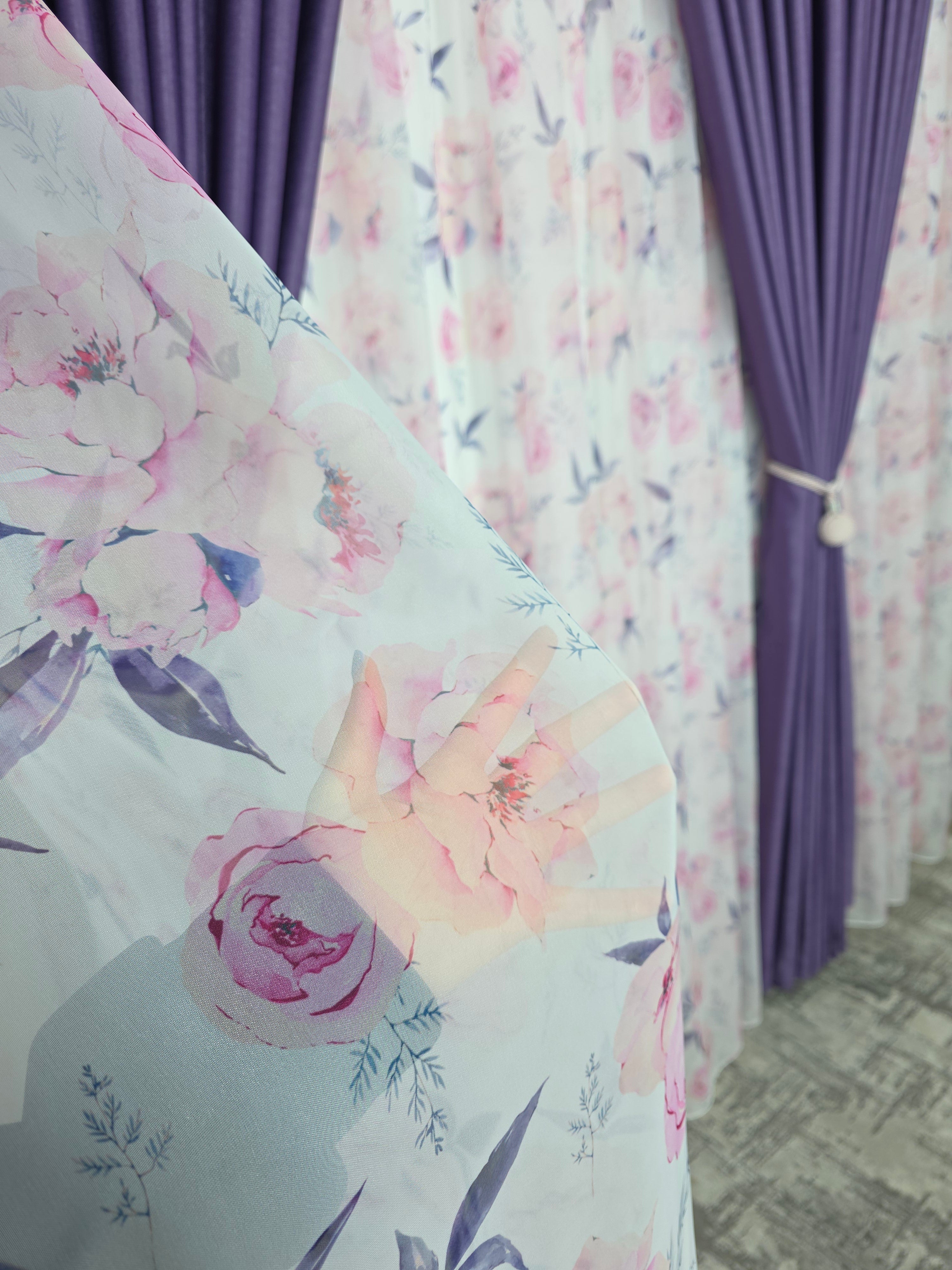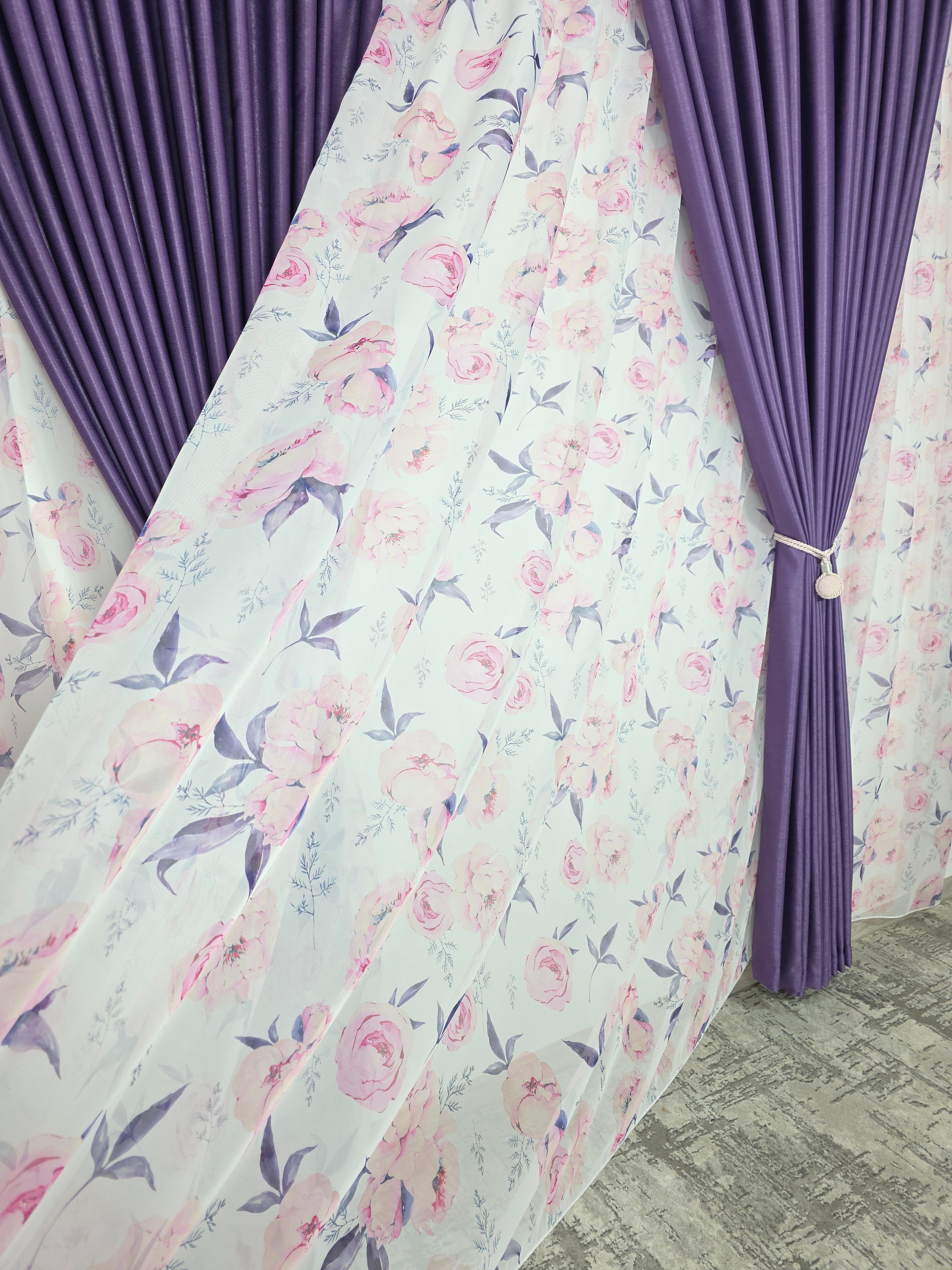 Set Perdea din Voal cu Model Floral & Draperie Soft Mov Semi-Opacă – delicatețe florală și culoare calmă