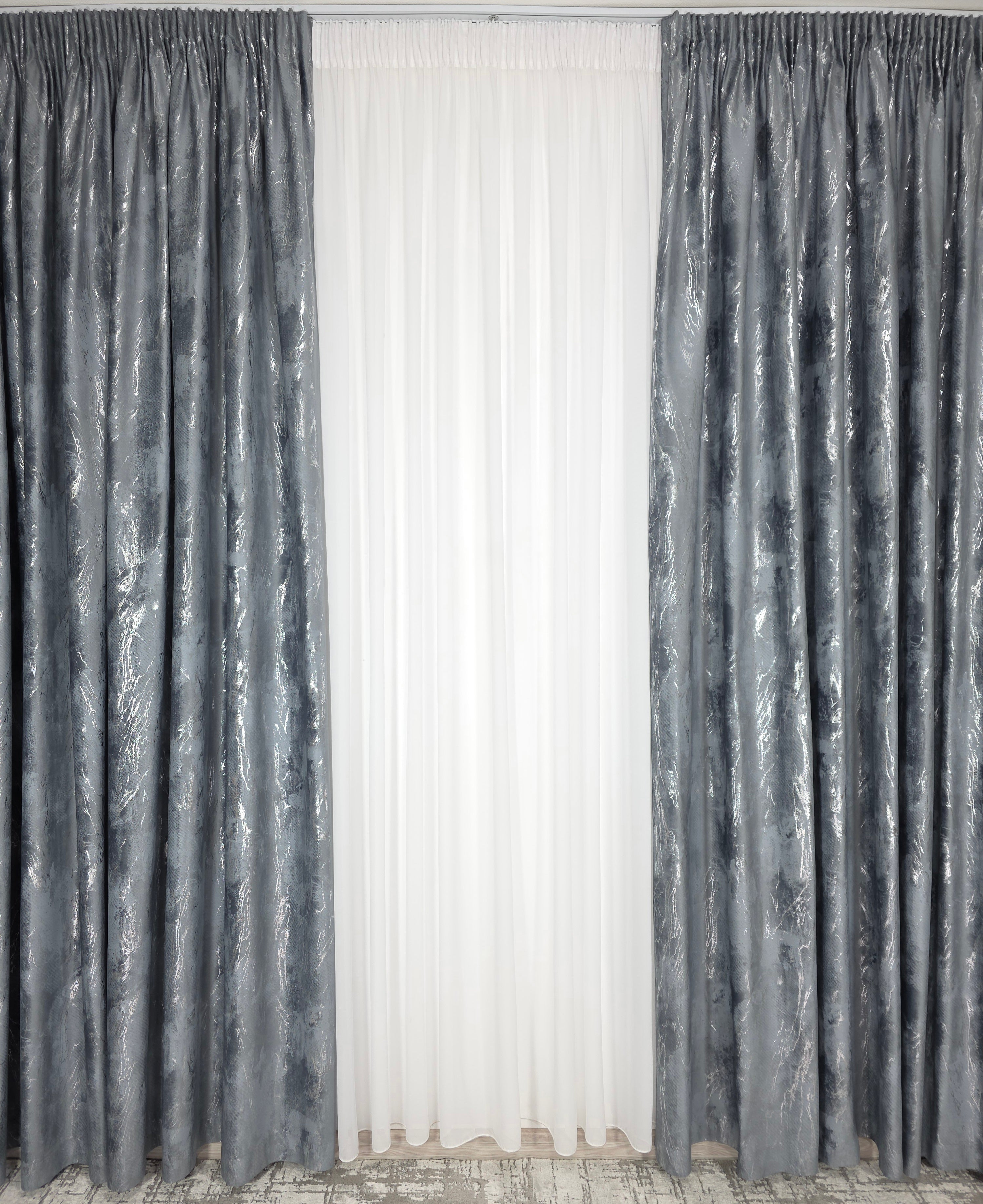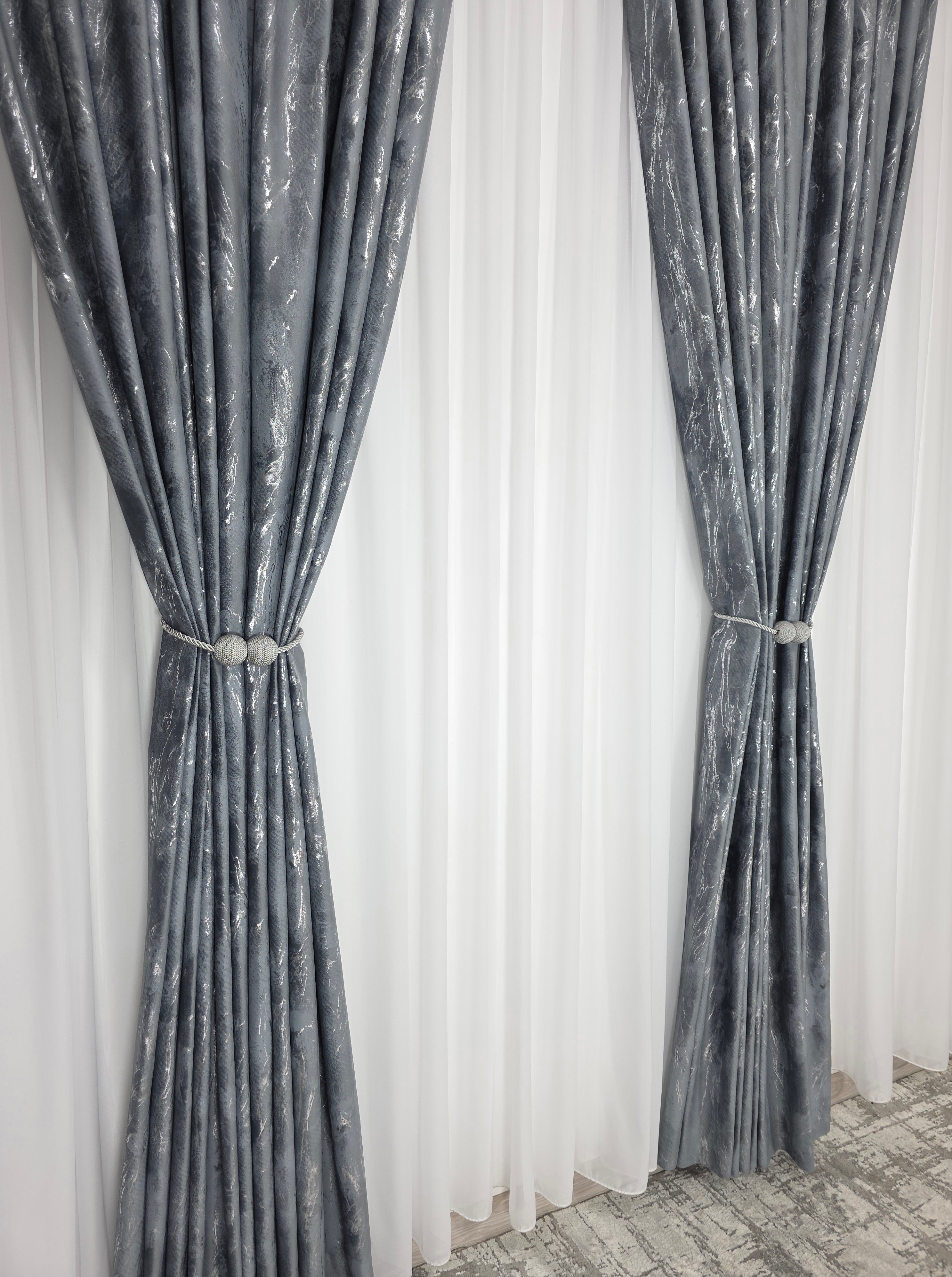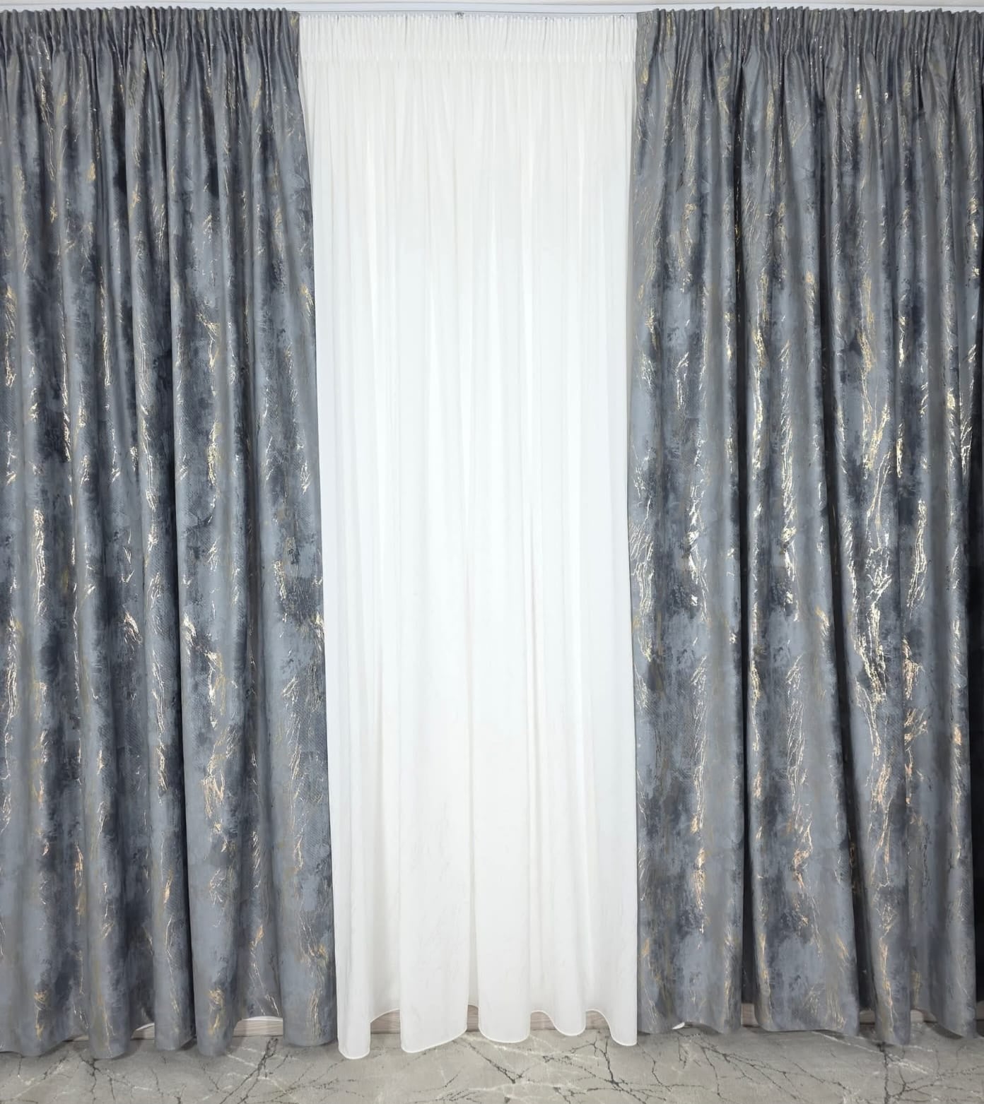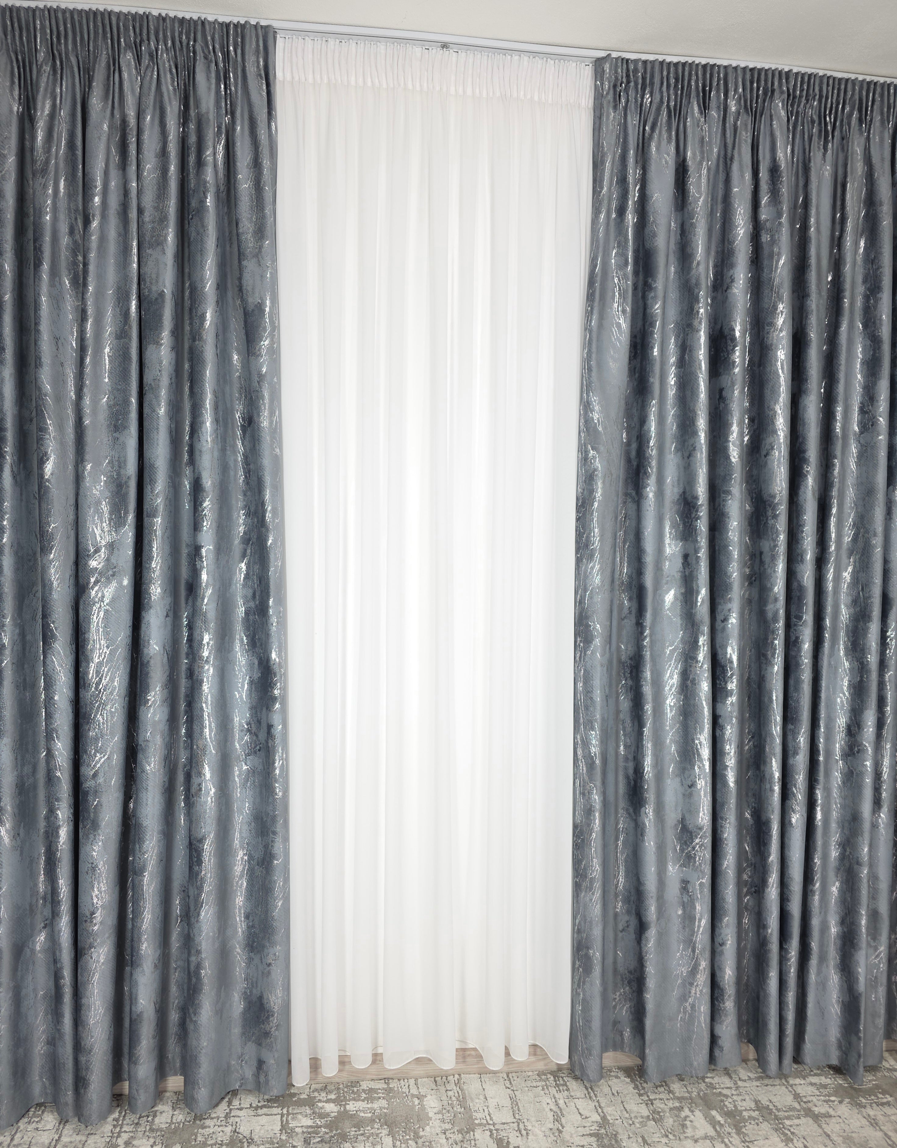 Setul cu perdea voal premium alb nesifonabil și draperie Milano din catifea gri închis cu inserții argintii transformă ferestrele în centrul estetic al fiecărei camere, prin eleganță curată și detalii sofisticate.