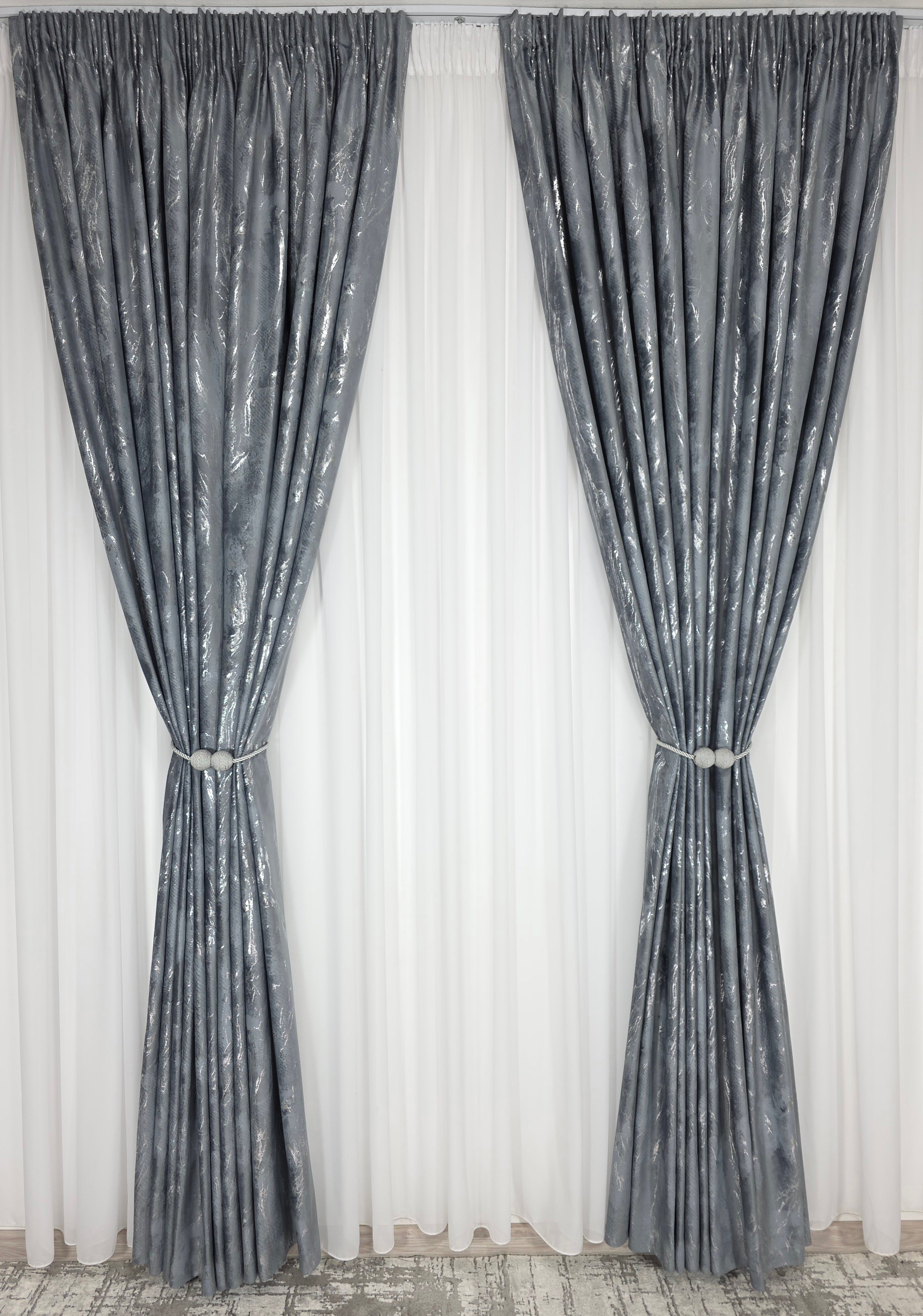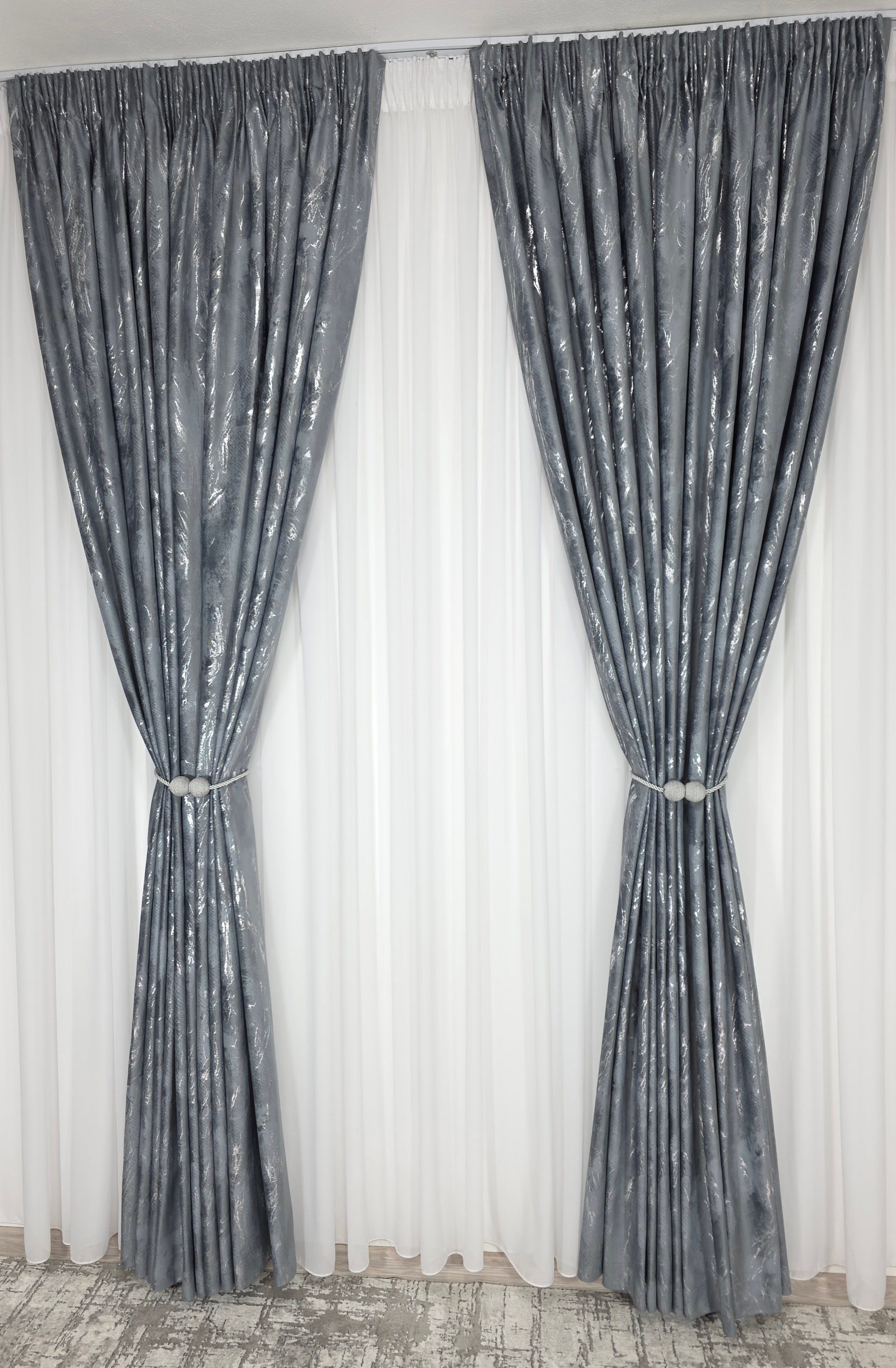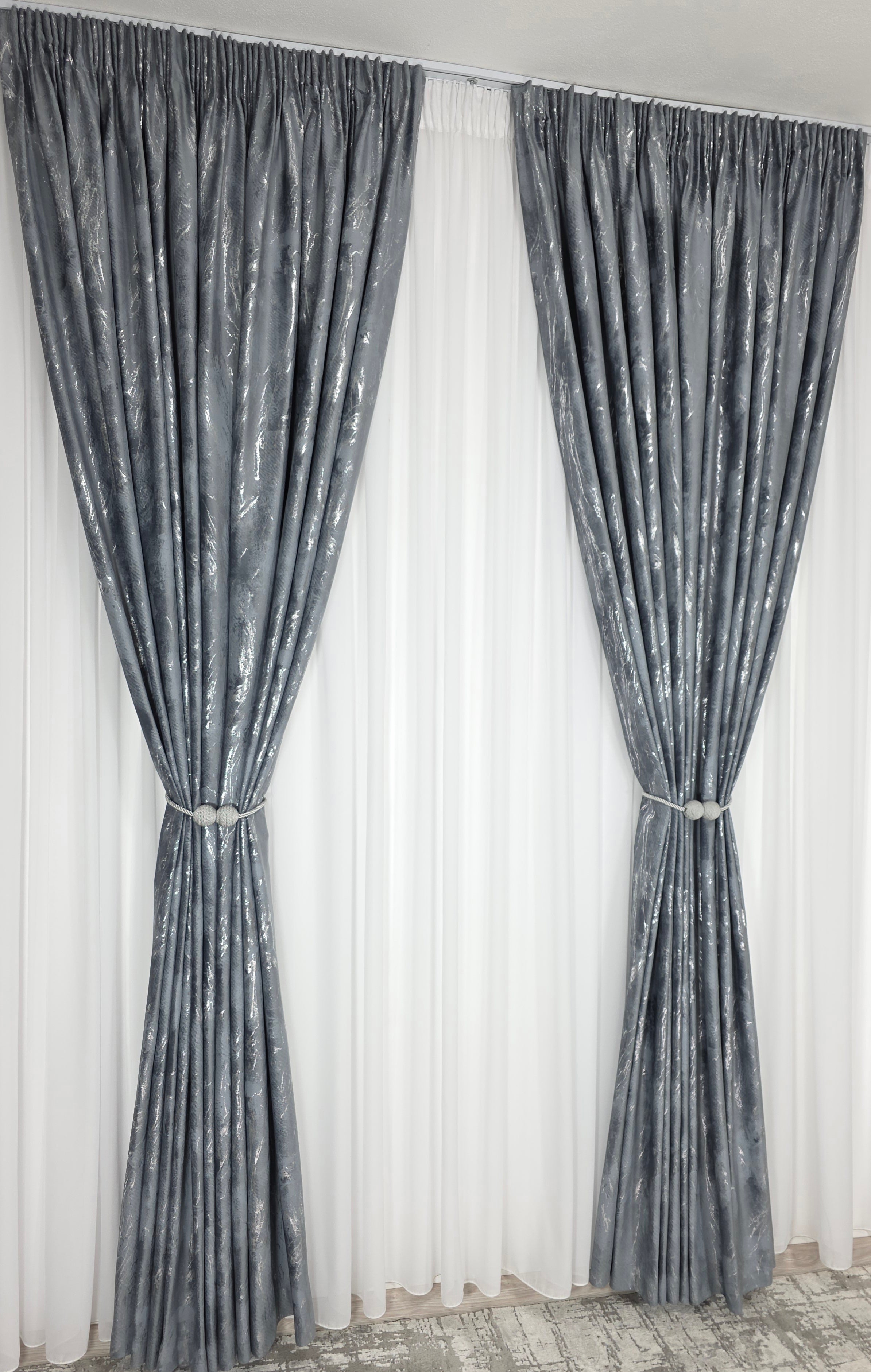 Set Perdea Voal Alb Premium Moale Nesifonabilă & Draperie Milano Catifea Gri Închis cu Inserții Argintii