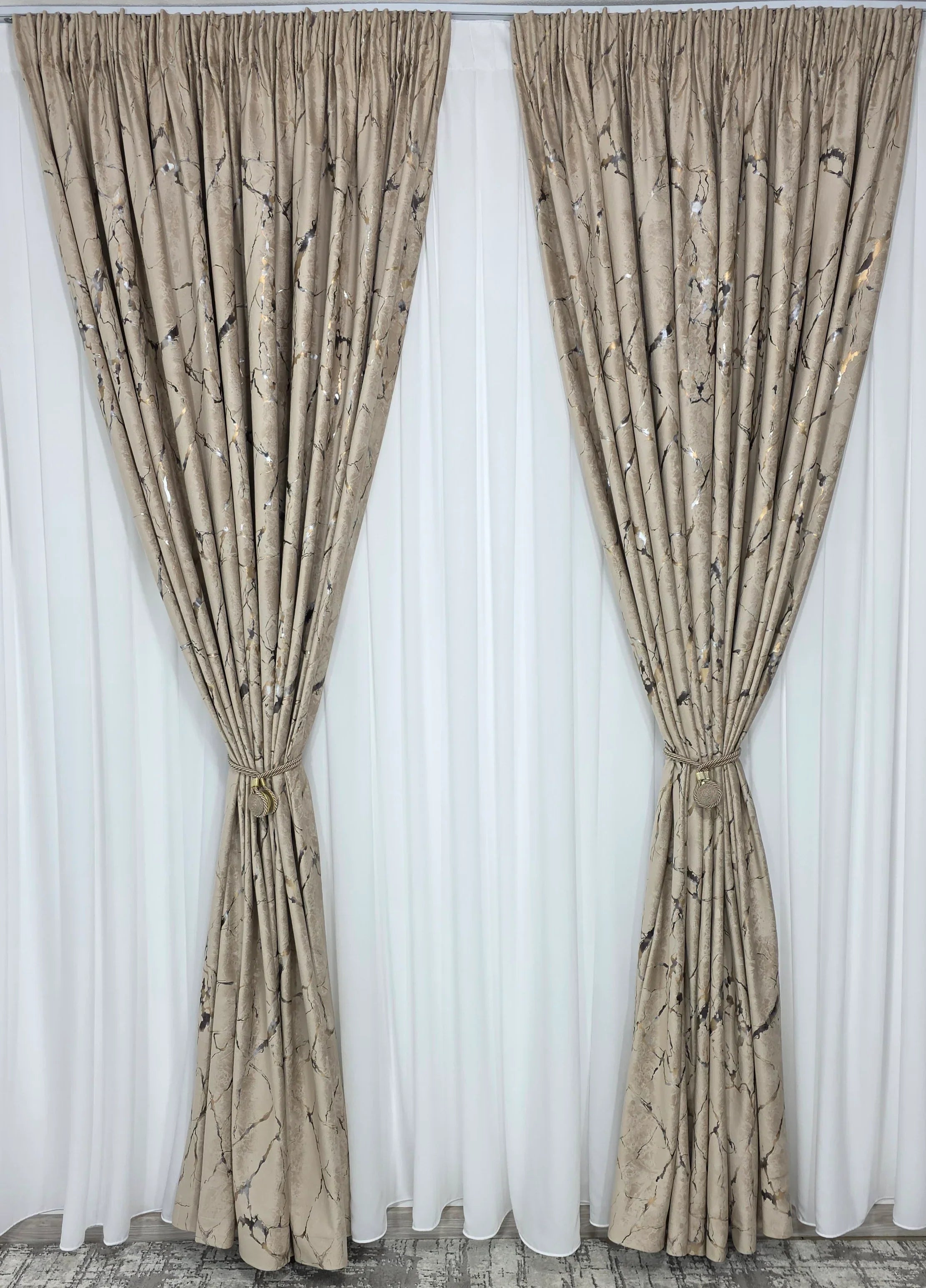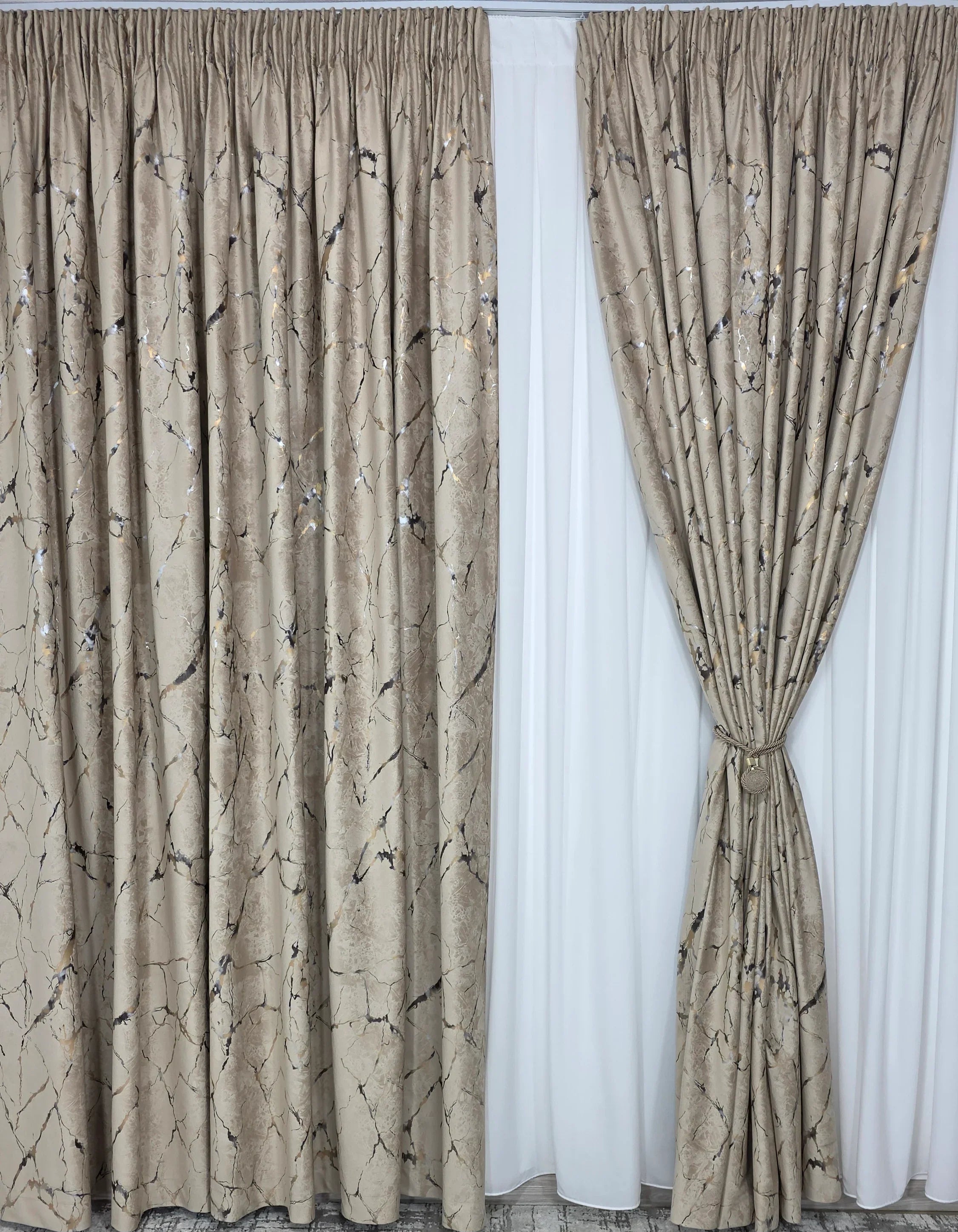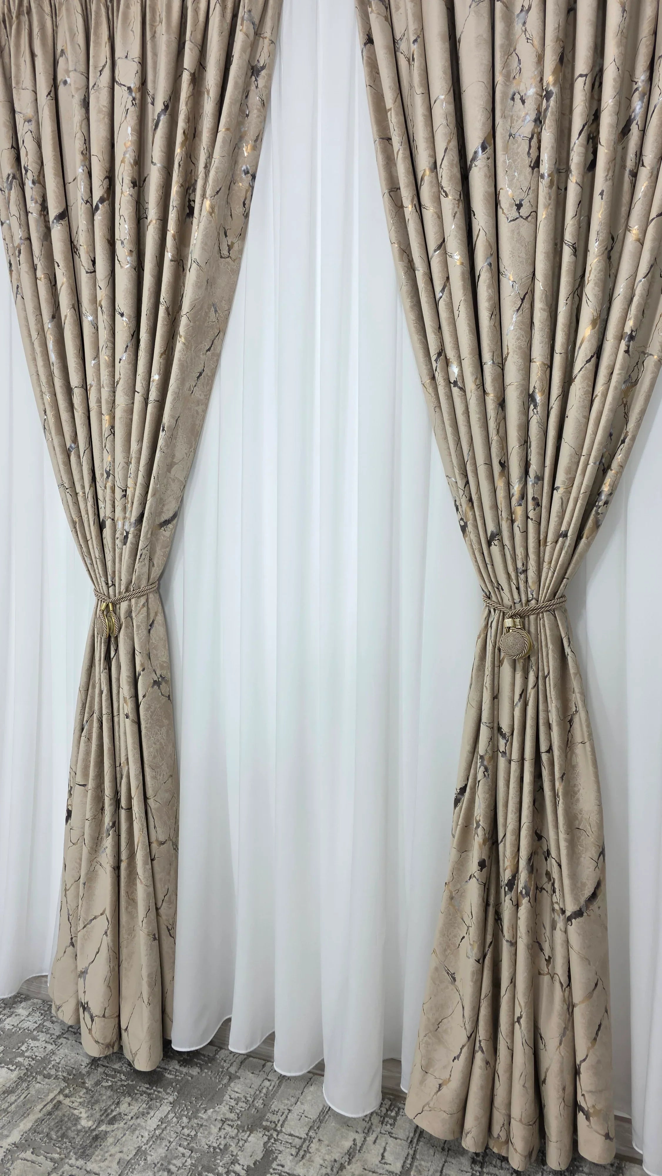 Această draperie din catifea capucino se remarcă prin tonul său cald și sofisticat, îmbogățit de delicatele inserții aurii ce adaugă un efect luxuriant și spectaculos. Catifeaua moale creează o atmosferă de confort și rafinament, fiind alegerea perfectă pentru un decor modern sau clasic, unde eleganța discretă se împletește cu detaliile prețioase.