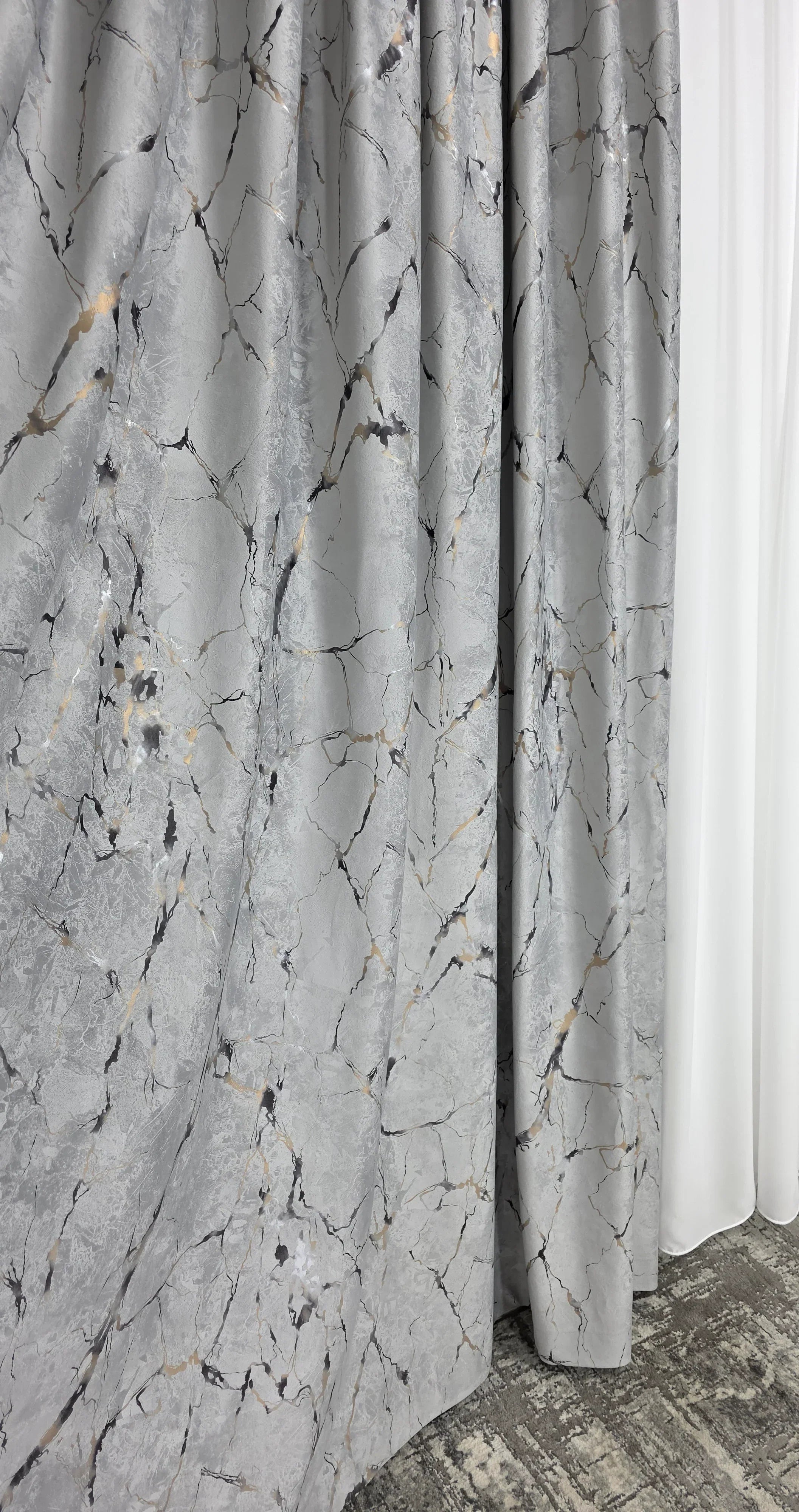 Draperia din catifea gri deschis cu inserții aurii aduce un plus de rafinament și luminozitate în orice încăpere. Catifeaua moale și elegantă, decorată cu reflexii aurii, creează un efect sofisticat și luxos, ideal pentru interioare moderne și clasice.