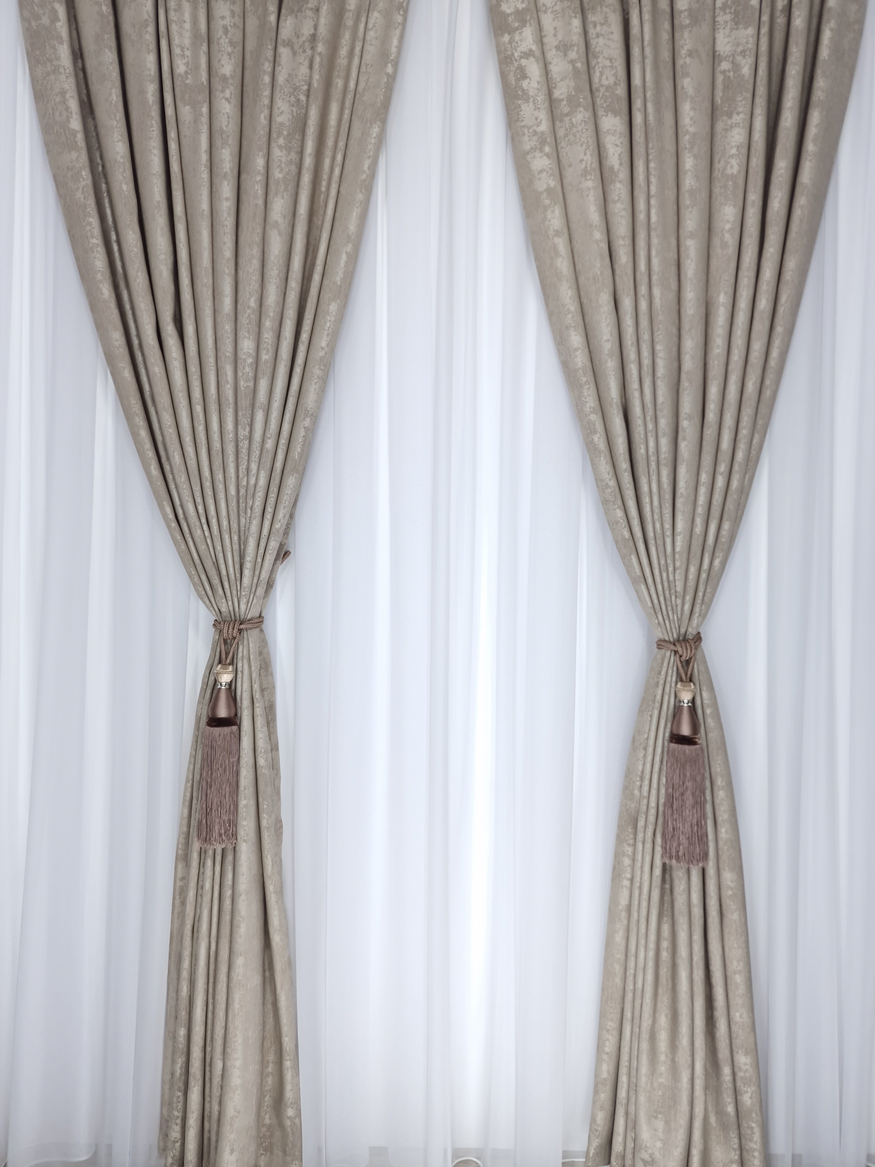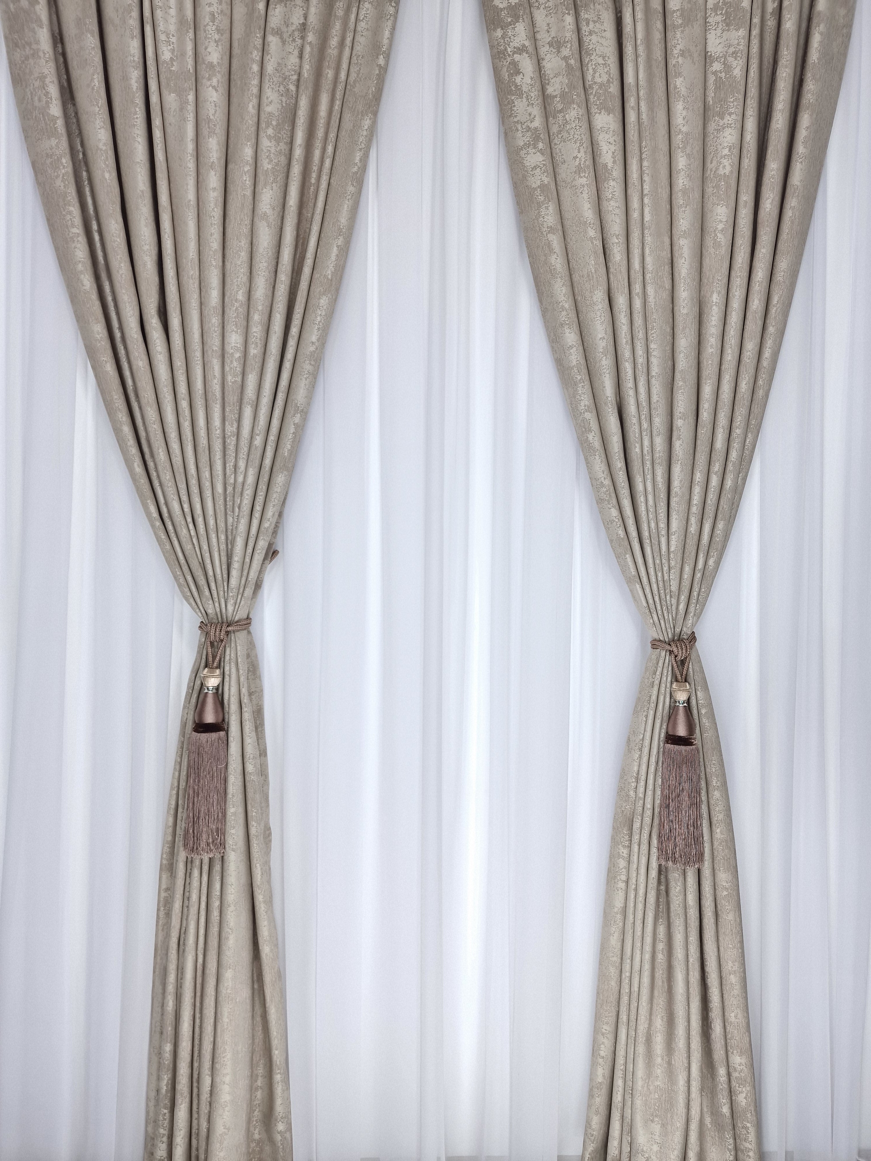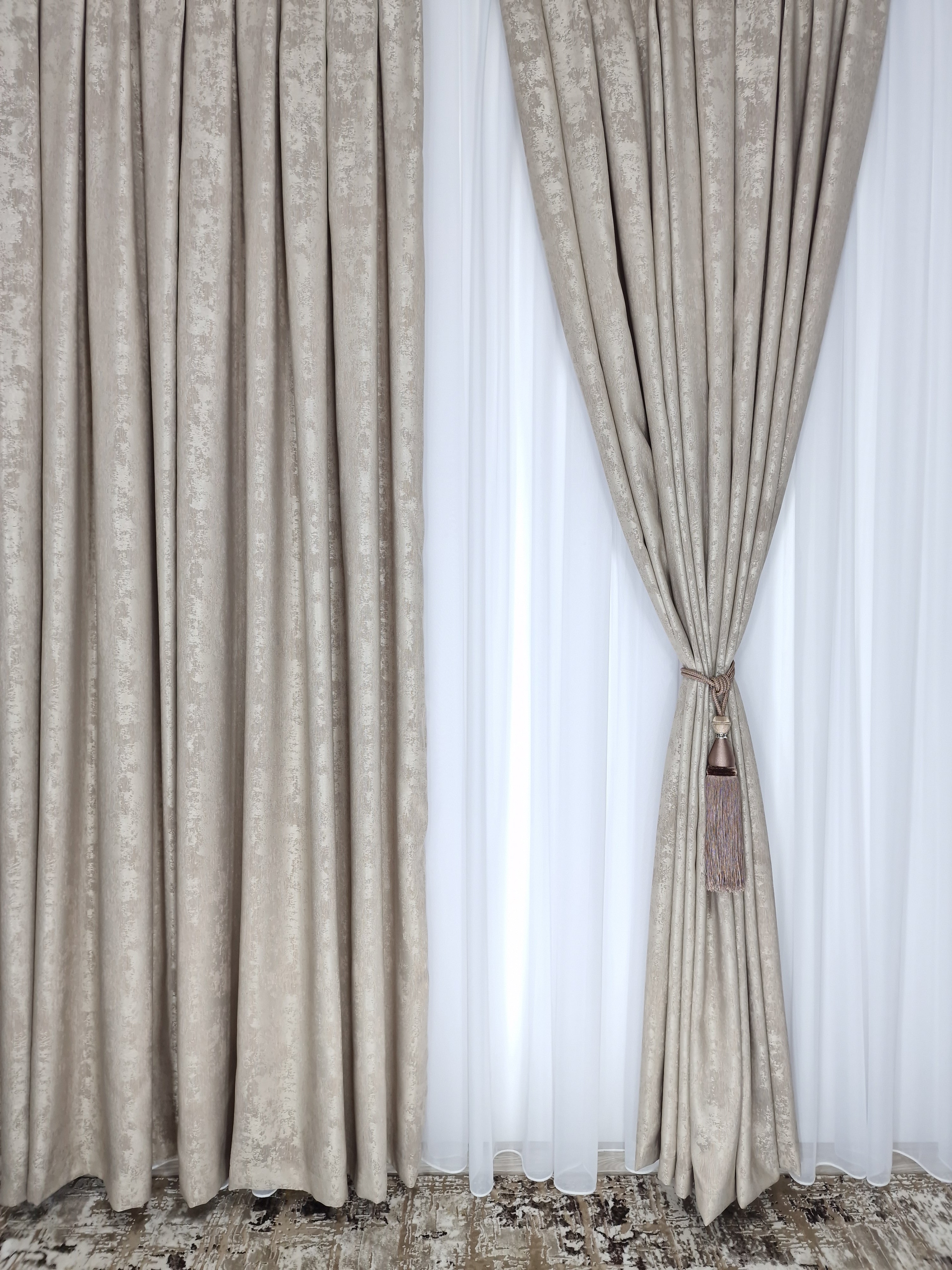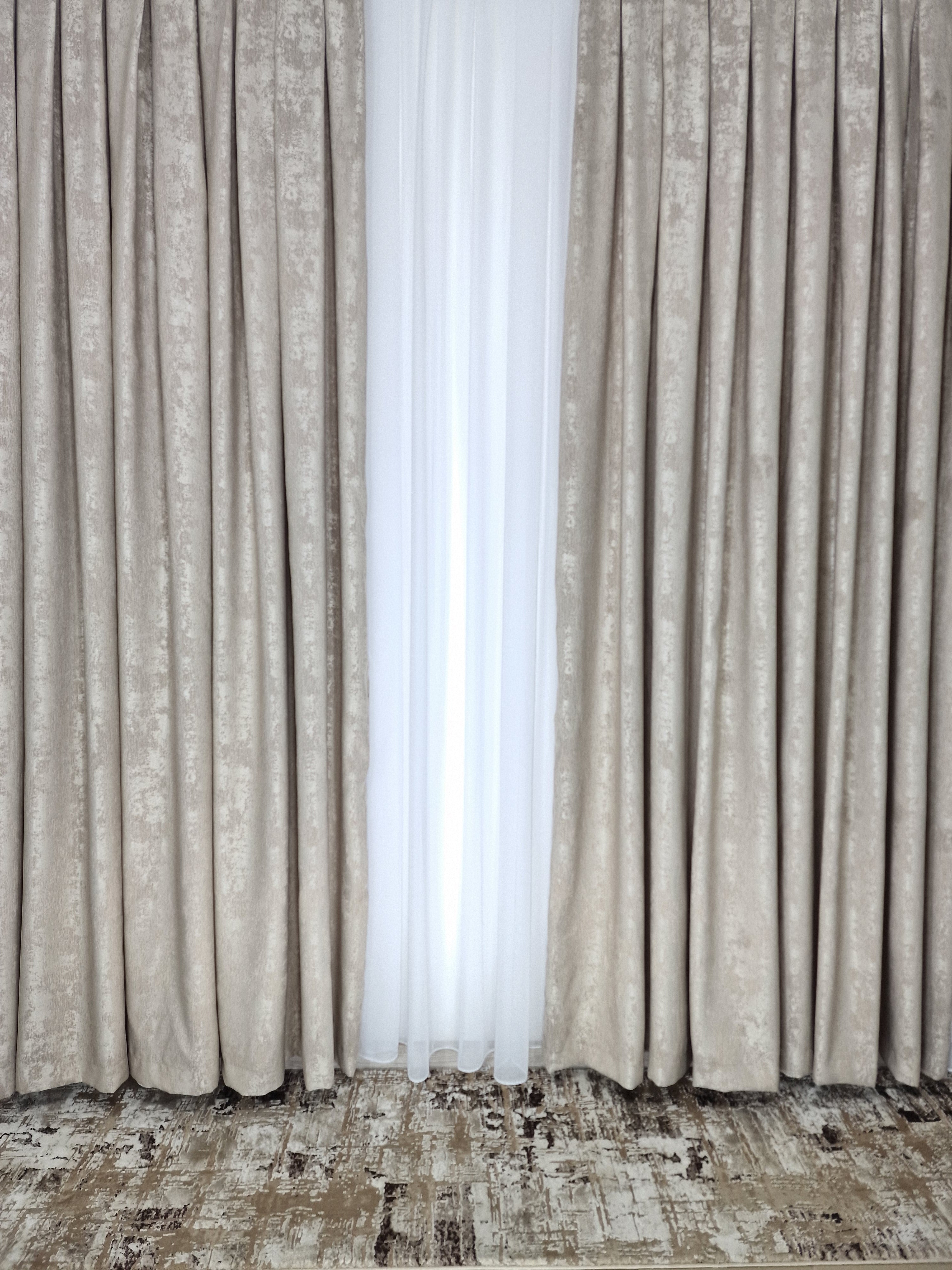 Această combinație între perdea albă din voal și draperie cu model de vopsea decorativă de culoare crem se integrează armonios în diverse stiluri de decor, de la clasic la modern sau boem. Fiind ușor de asortat cu mobilierul și restul elementelor decorative, acest set va crea un mediu primitor și stilat în locuința ta.