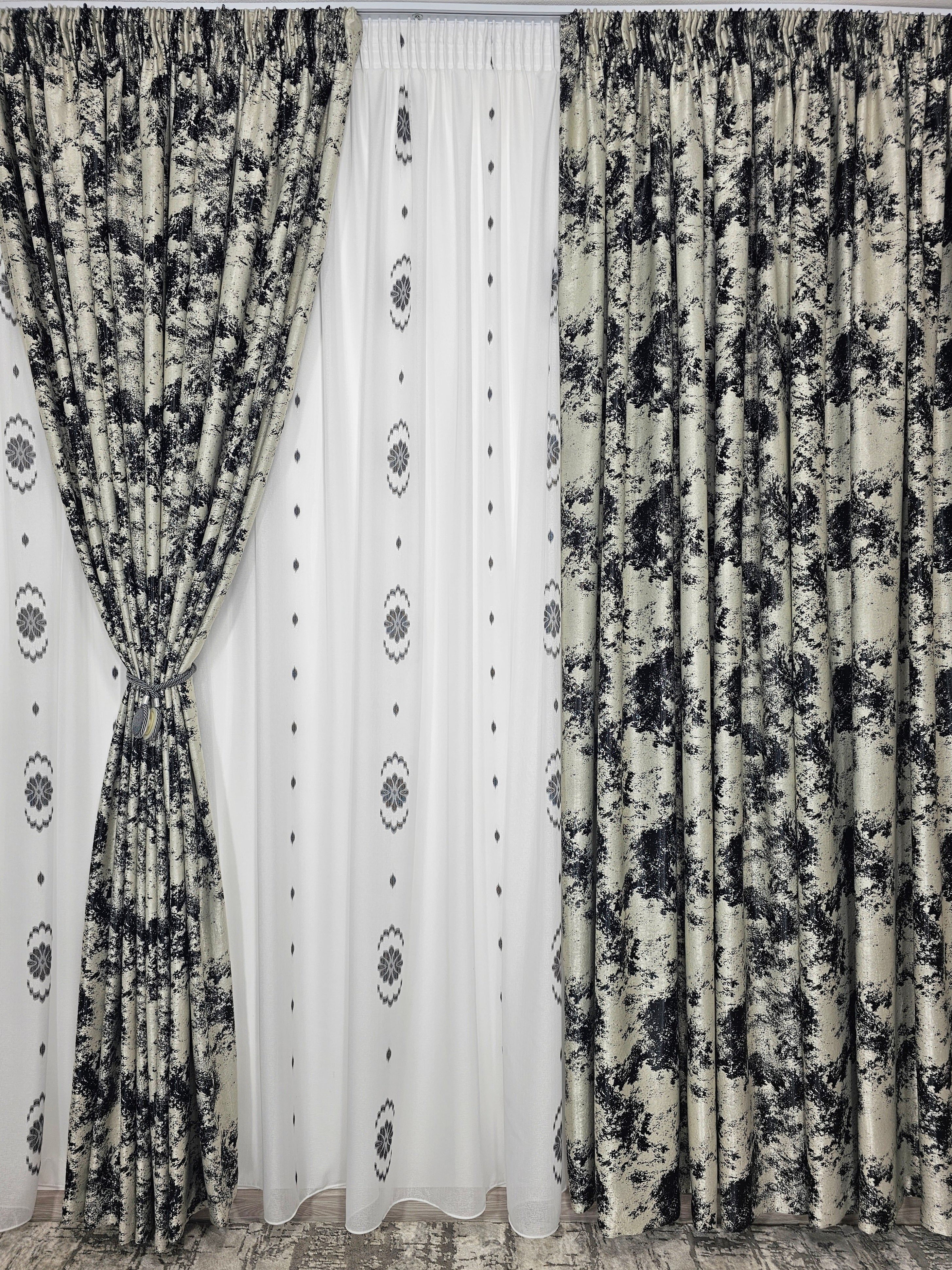 O draperie cu design sofisticat Jaguar, în nuanțe de gri și negru, perfectă pentru interioarele moderne și elegante. Fabricată din material blackout 100% poliester, asigură oprirea eficientă a luminii și un confort sporit în orice încăpere.