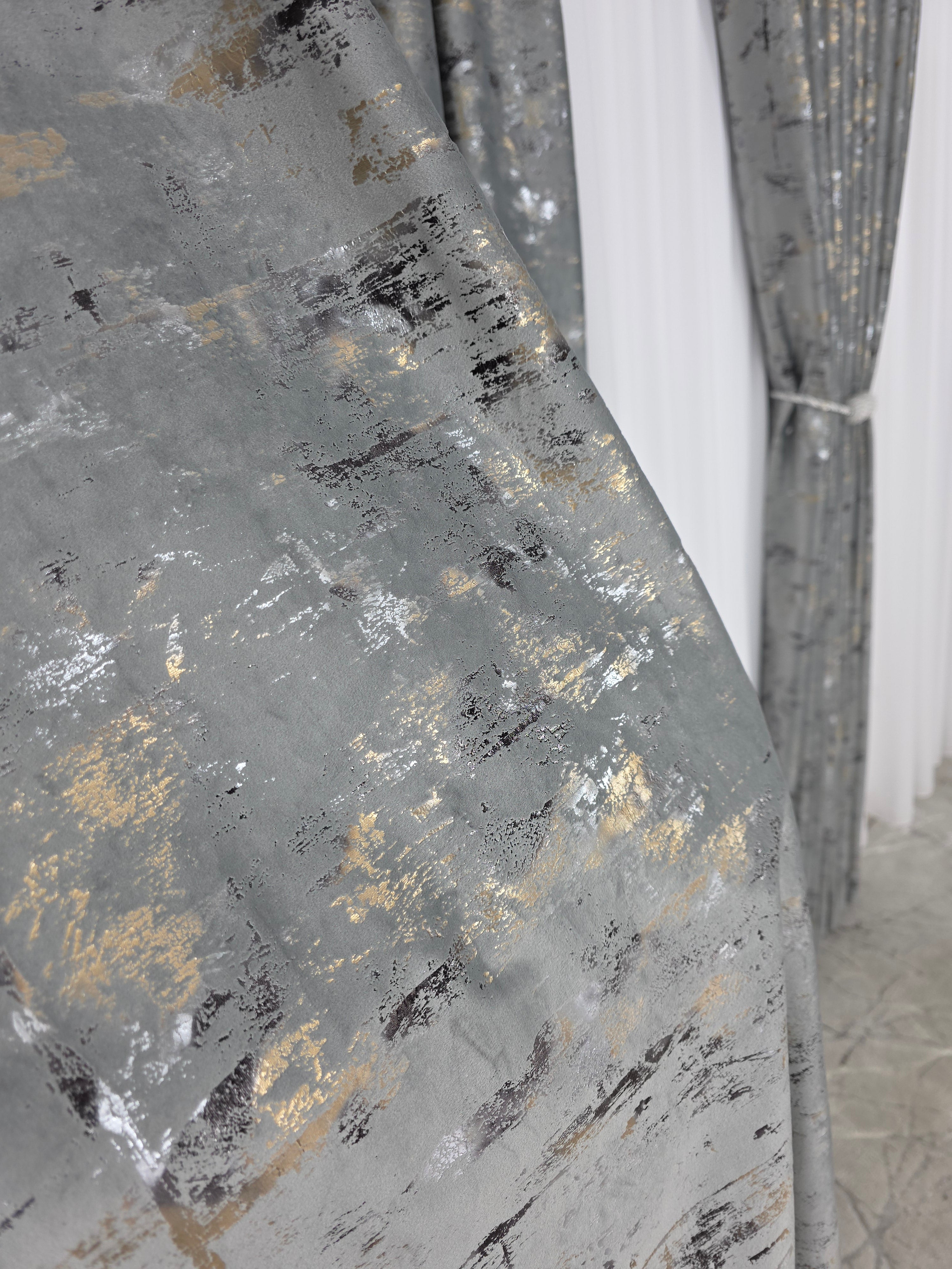 Această draperie din catifea gri deschis cu aurii este alegerea perfectă pentru un decor sofisticat, modern și plin de rafinament.