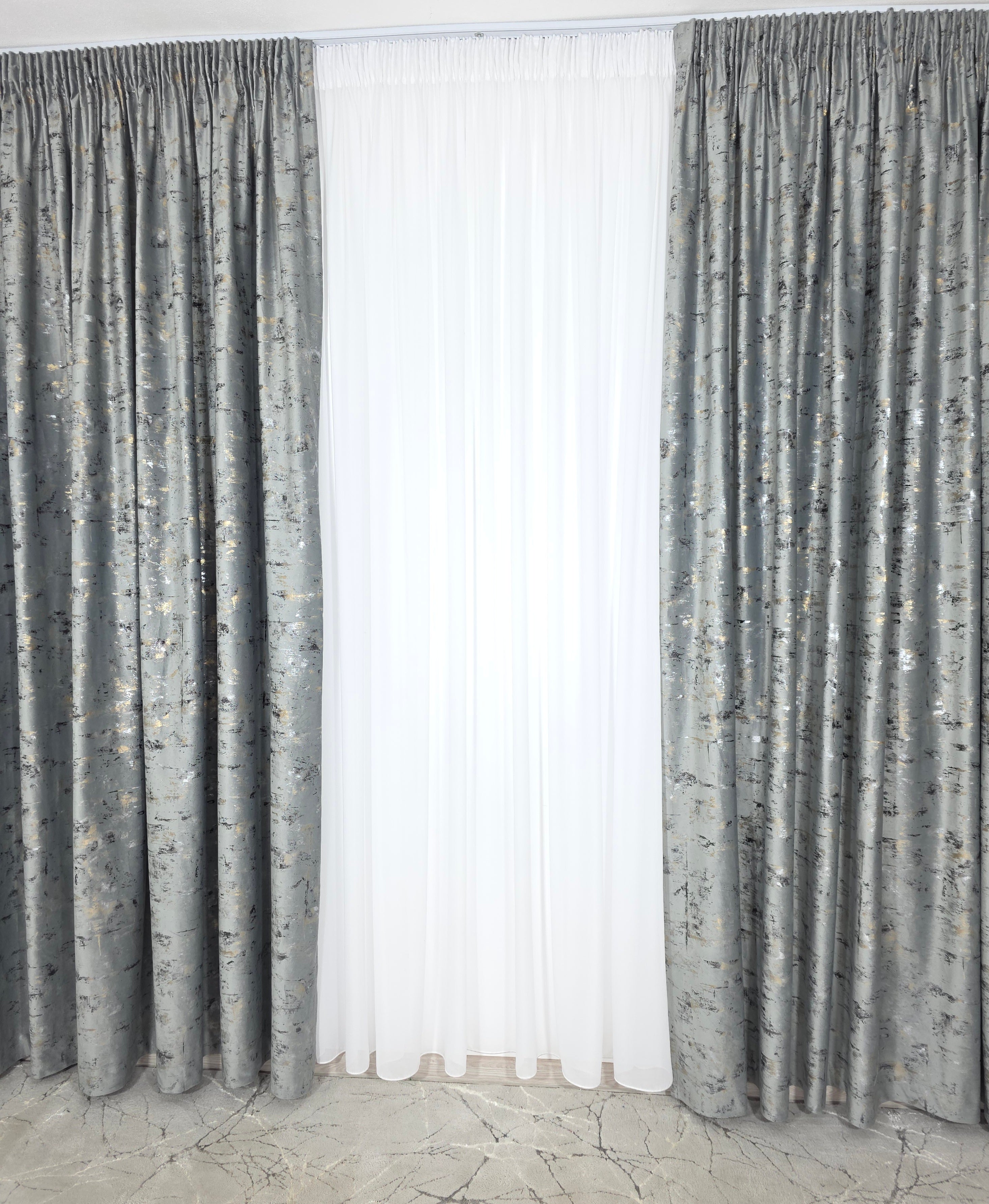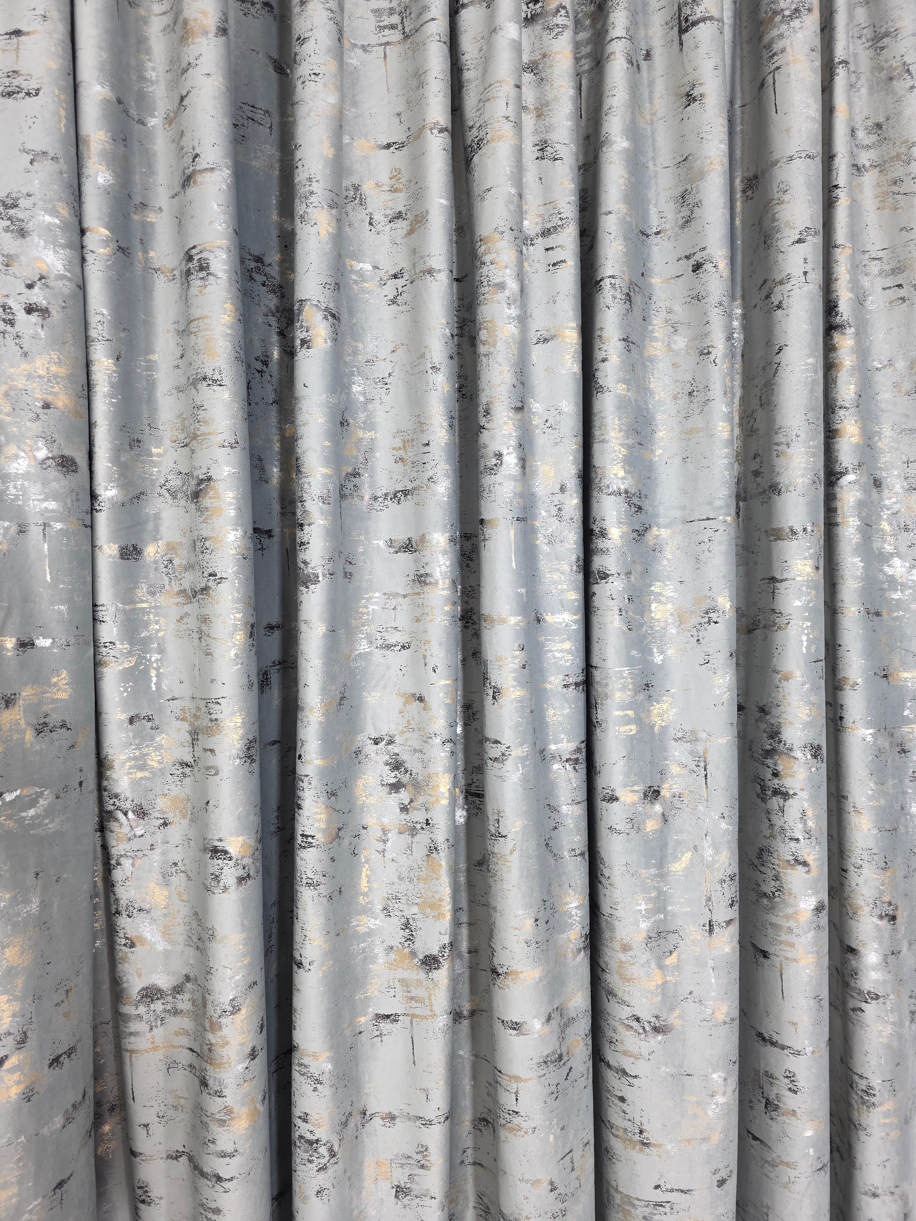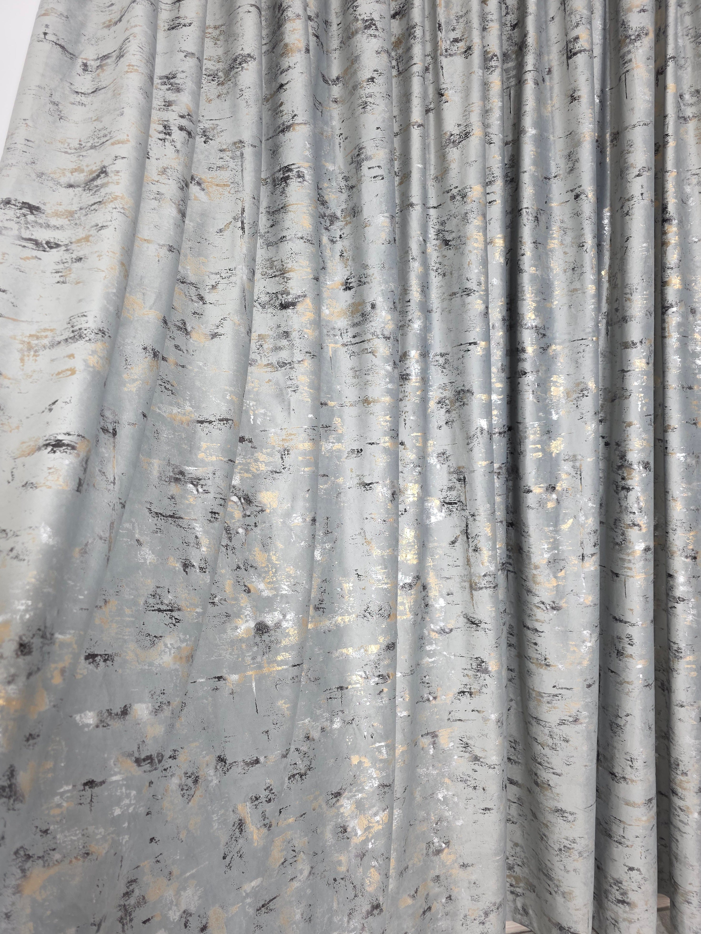 O draperie elegantă și modernă, realizată din catifea gri deschis decorată cu inserții aurii subtile, ce aduce un plus de rafinament și luminozitate în orice încăpere.