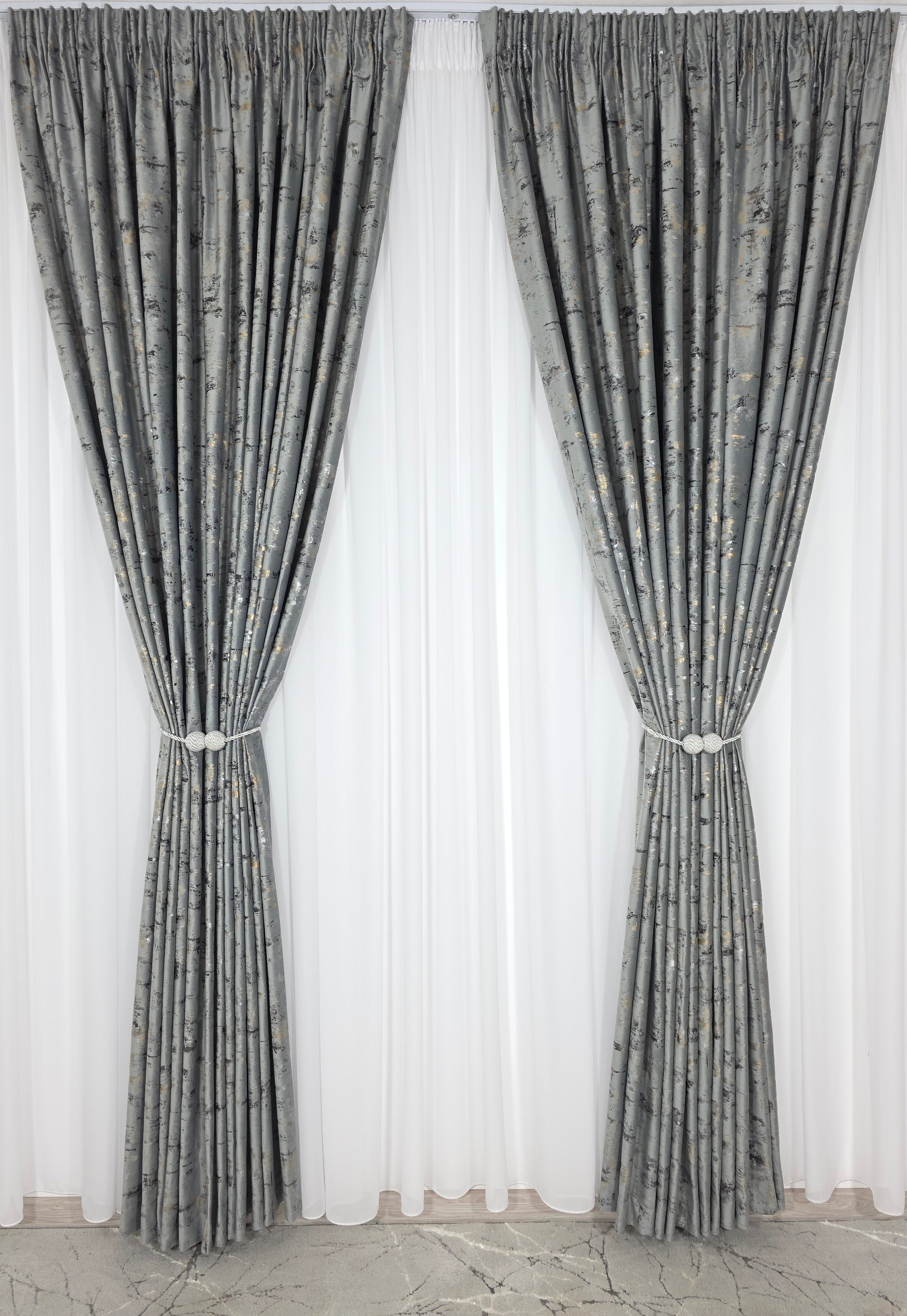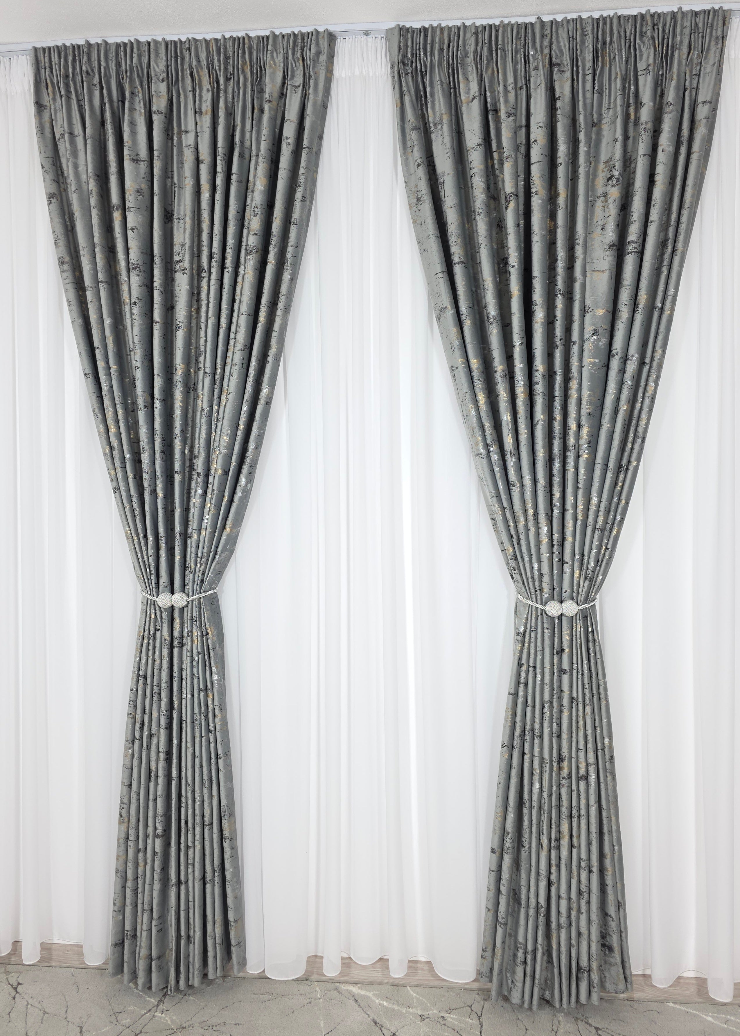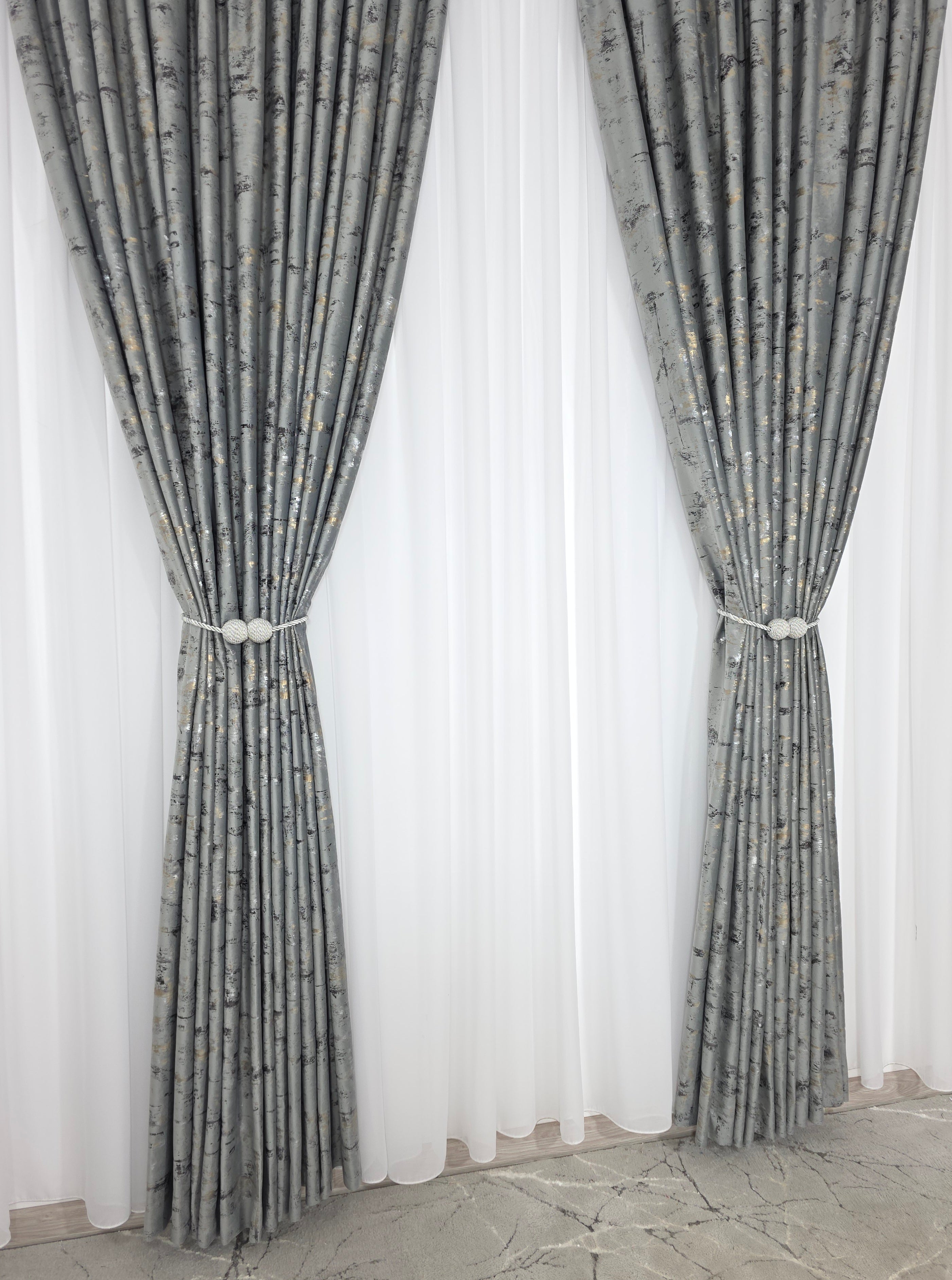 Draperie din material tip catifea gri deschis, cu detalii aurii fine