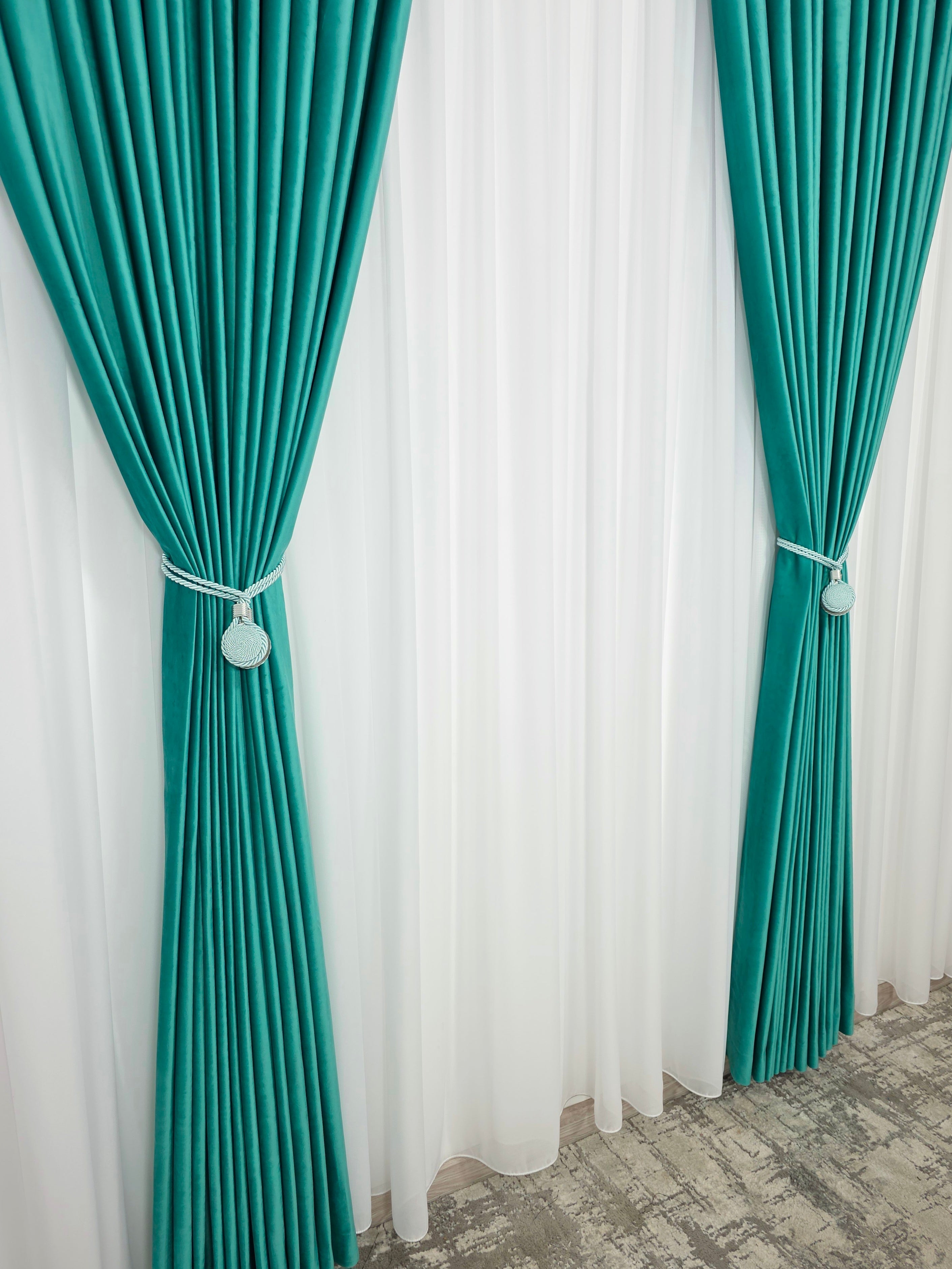 Adaugă profunzime și rafinament oricărui spațiu cu această draperie din catifea simplă, în nuanță intensă de verde marin, cu opacitate de aproximativ 90% blackout: