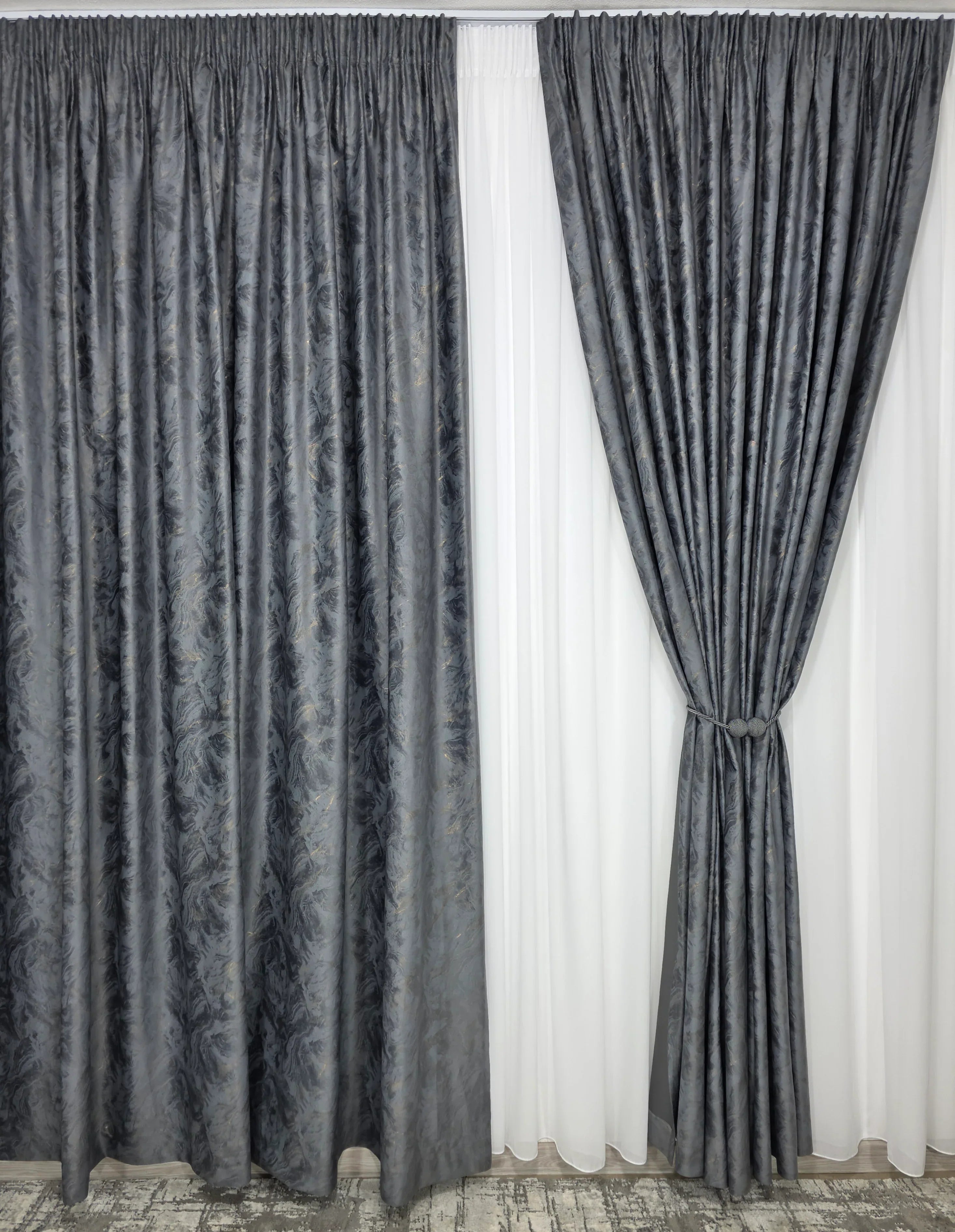 Această draperie rafinată îmbină profunzimea catifelei gri închis, cu textură densă și sofisticată, cu strălucirea discretă a inserțiilor aurii, care adaugă un plus de rafinament și lumină. Este alegerea ideală pentru interioarele elegante, unde tonurile neutre și accentele luxoase se completează armonios.