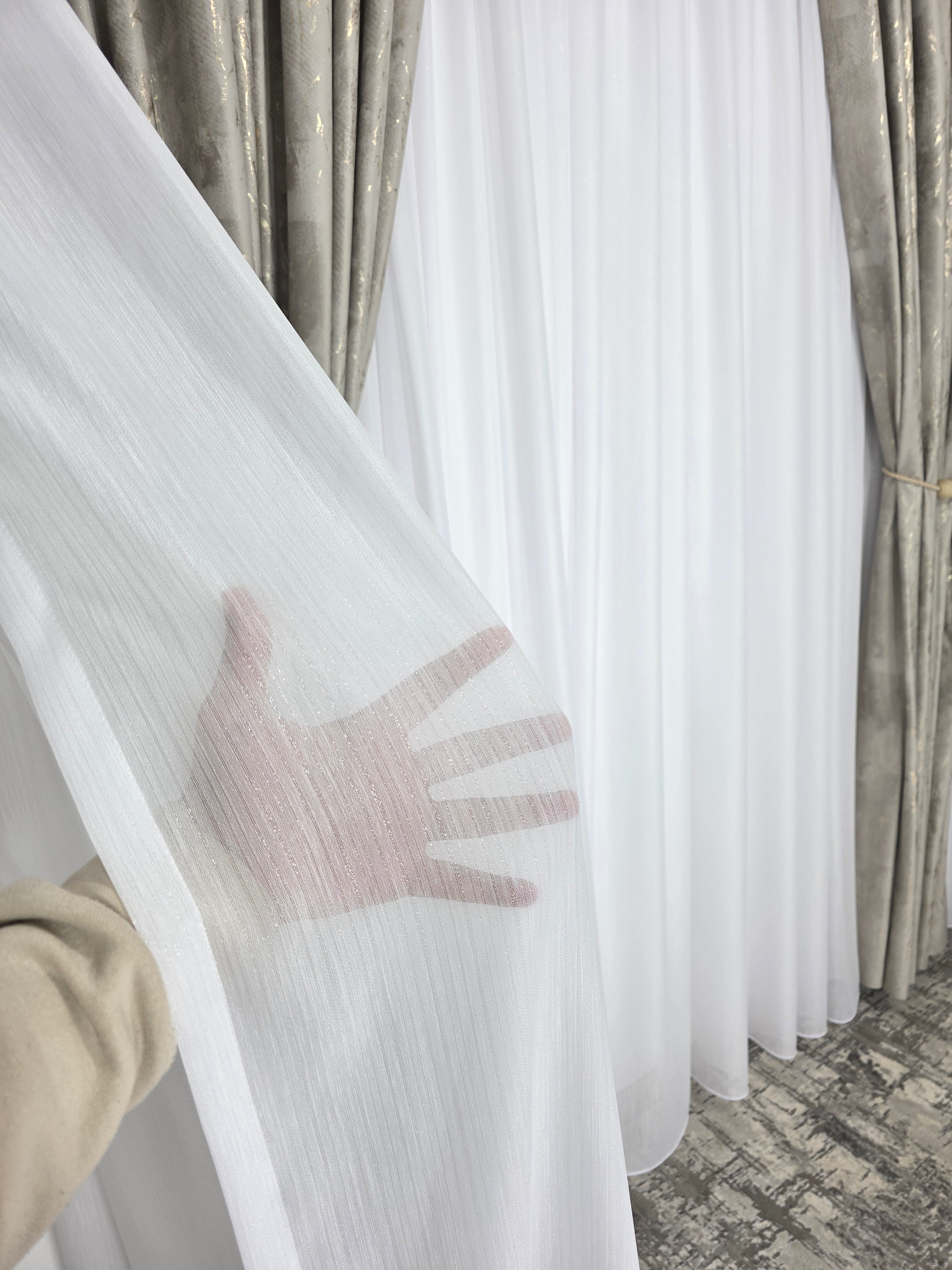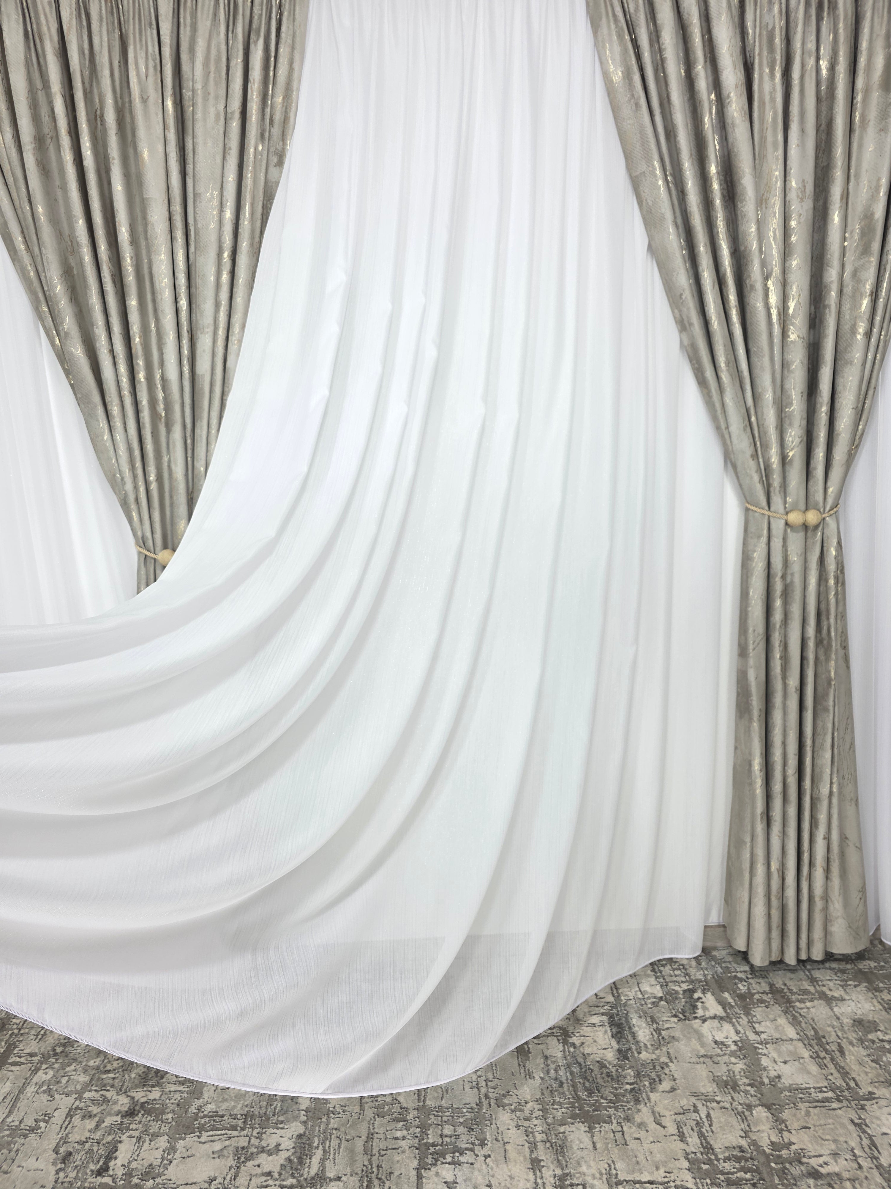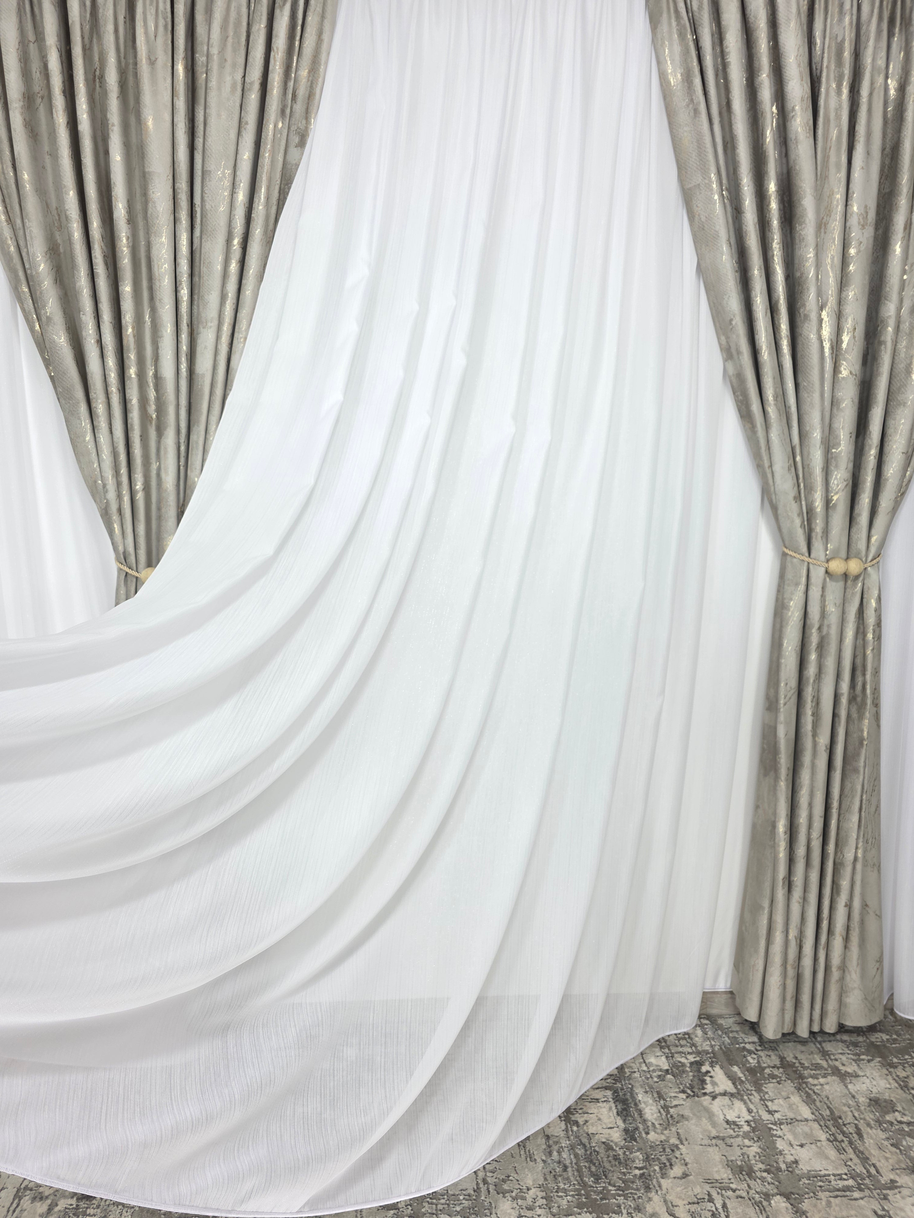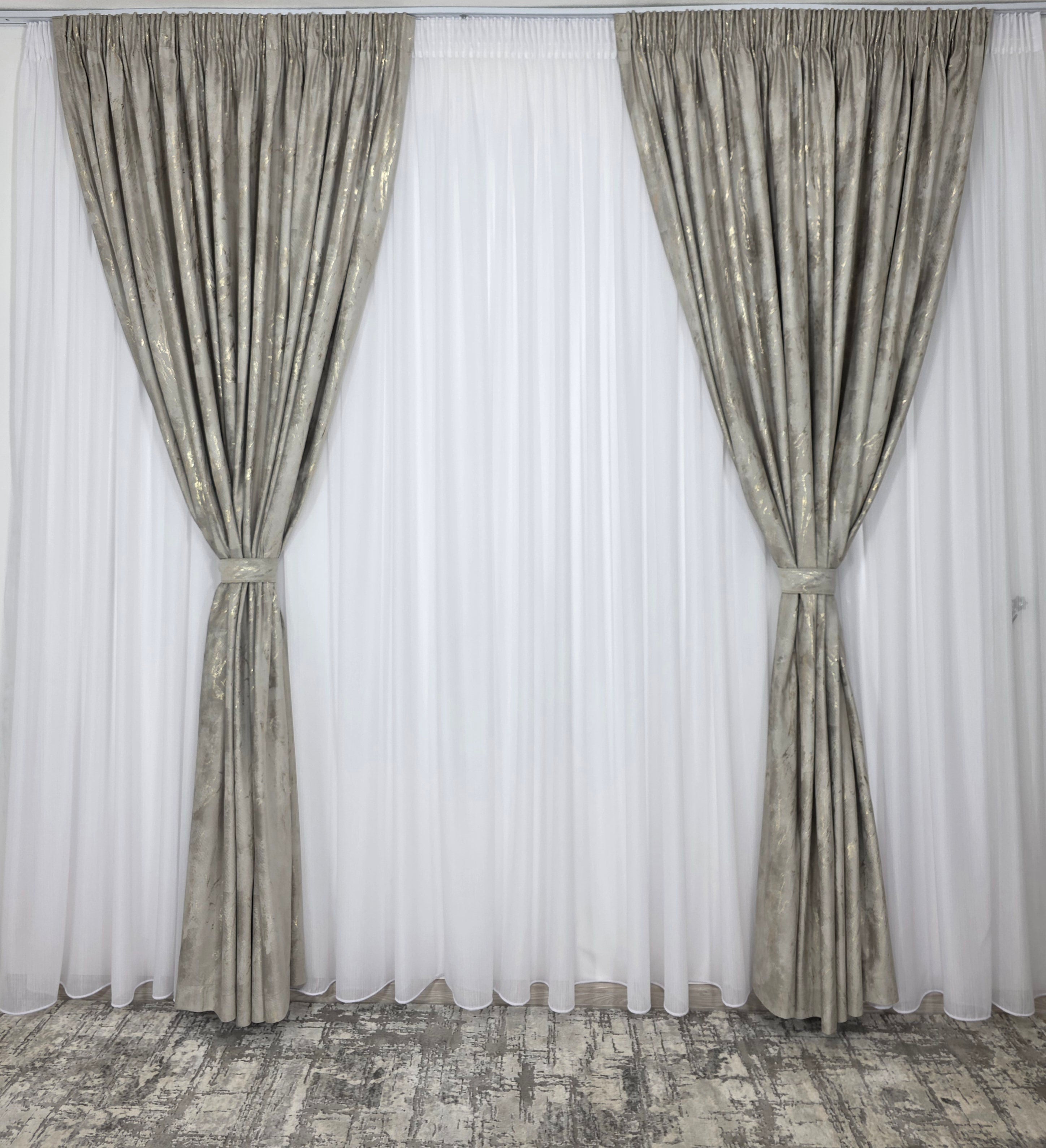 Această draperie exclusivistă impresionează prin frumusețea catifelei grej deschis, cu textură moale și cădere impecabilă, îmbogățită cu inserții aurii subtile, ce adaugă un plus de lux și rafinament. O alegere ideală pentru interioarele moderne și sofisticate, unde fiecare detaliu contează.