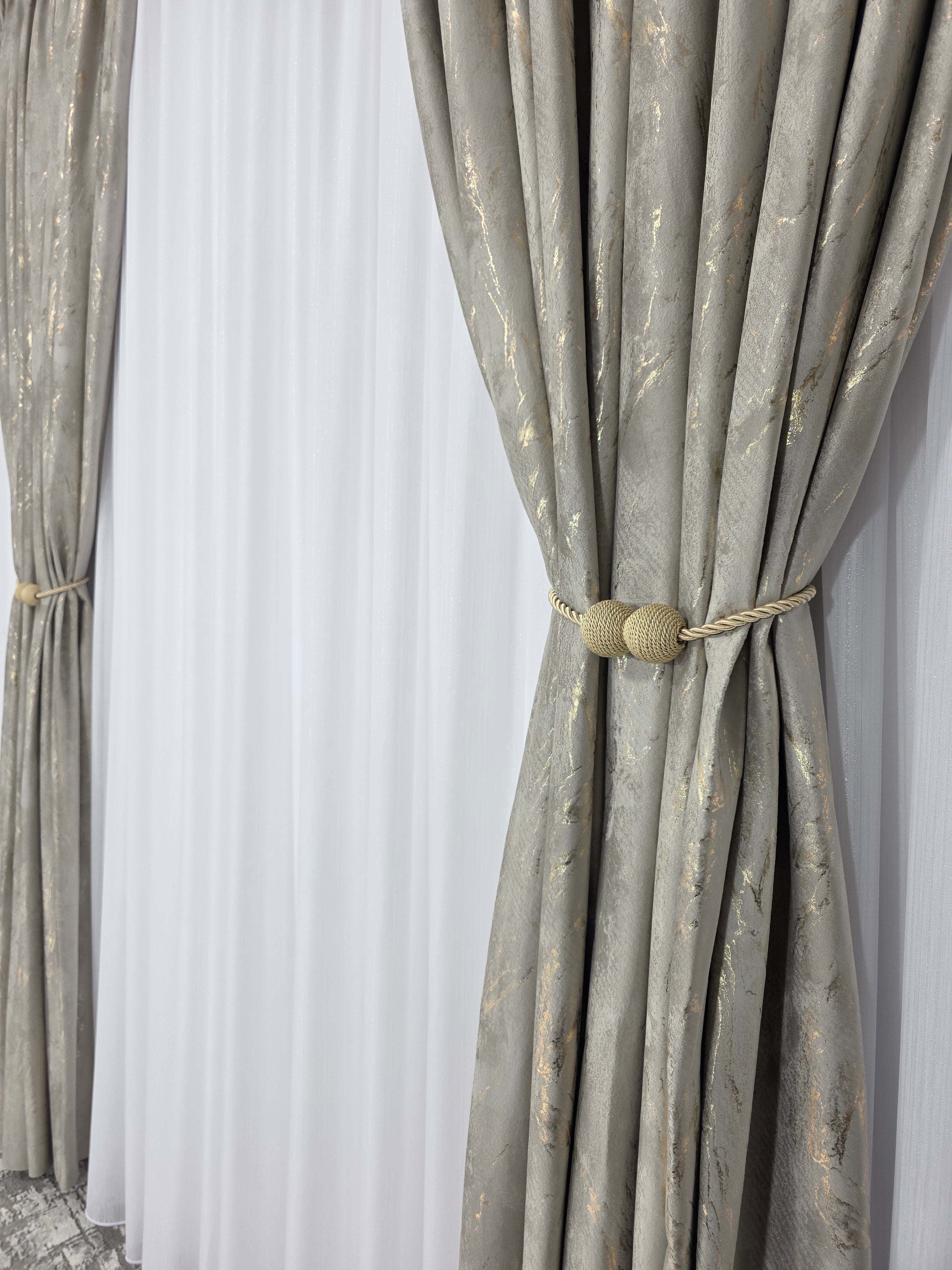 Prin combinația dintre eleganța neutră a catifelei grej și strălucirea discretă a inserțiilor aurii, această draperie aduce în casă un aer cald, modern și rafinat – o alegere premium pentru interioare cu stil. ✨