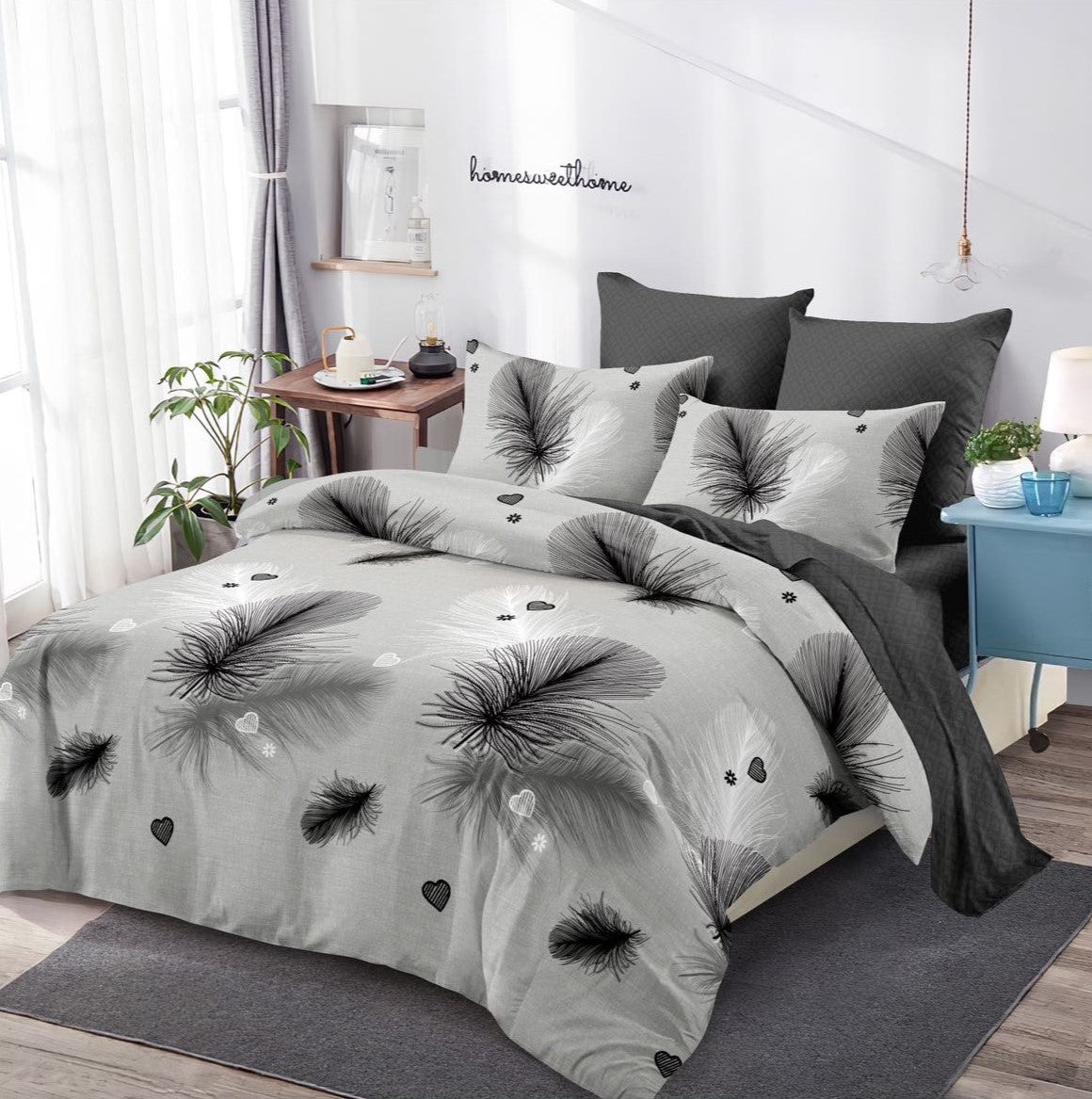 Lenjerie finet, gri cu pene negre, cerceaf cu elastic 160/180x200, Cod: B988