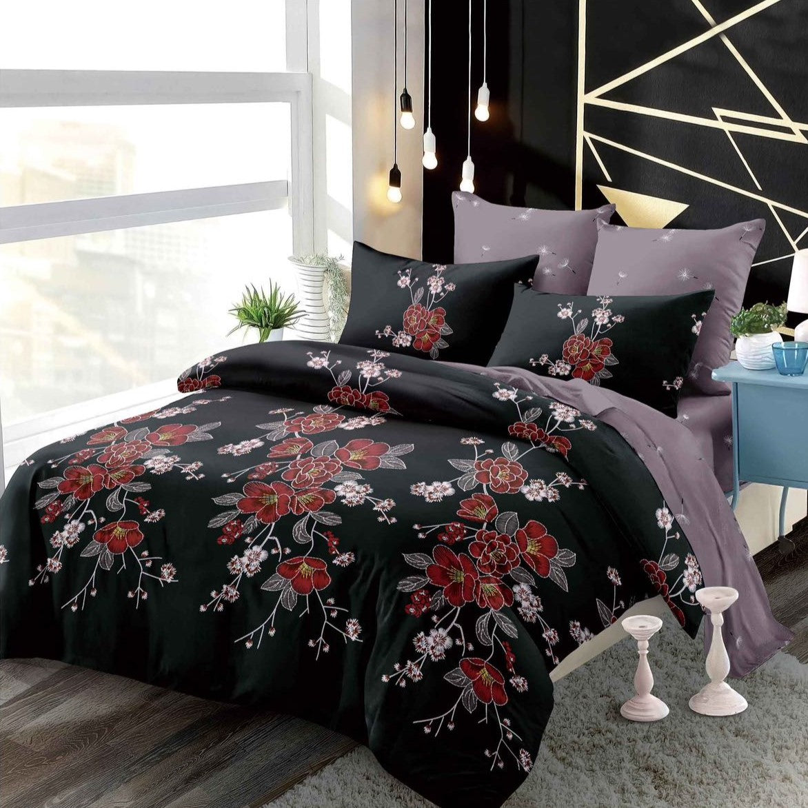 Lenjerie finet, negru model floral rosu, cerceaf cu elastic 160/180x200, Cod: B931