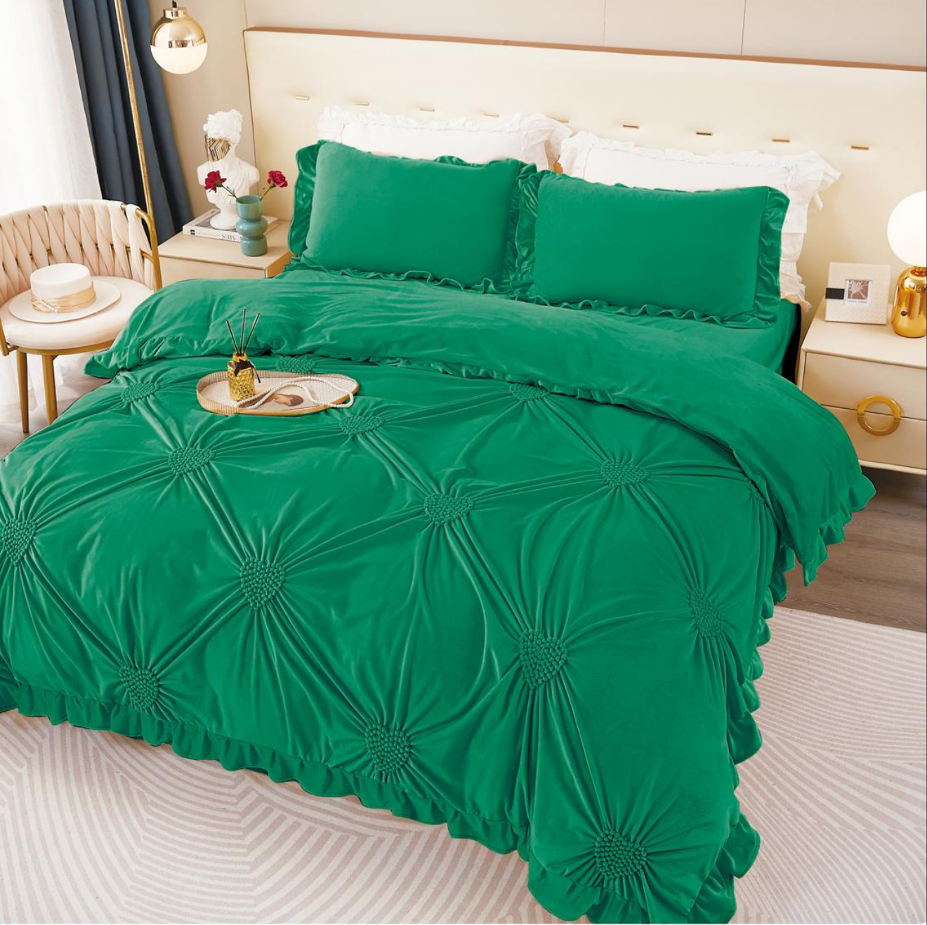 Lenjerie 4 Piese pentru Pat Dublu din Catifea cu Pliuri Brodate și Volănașe – Lux și Confort la Superlativ