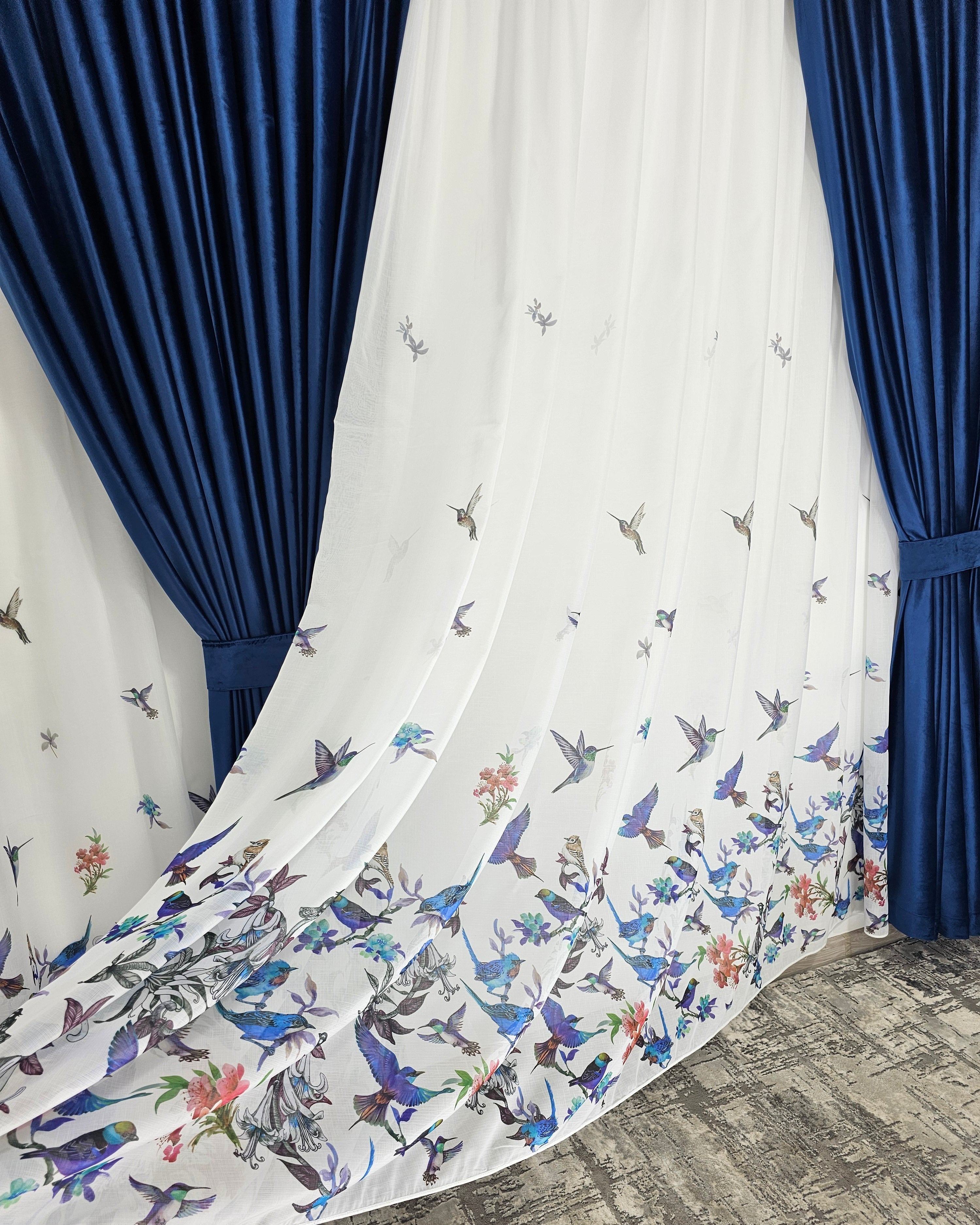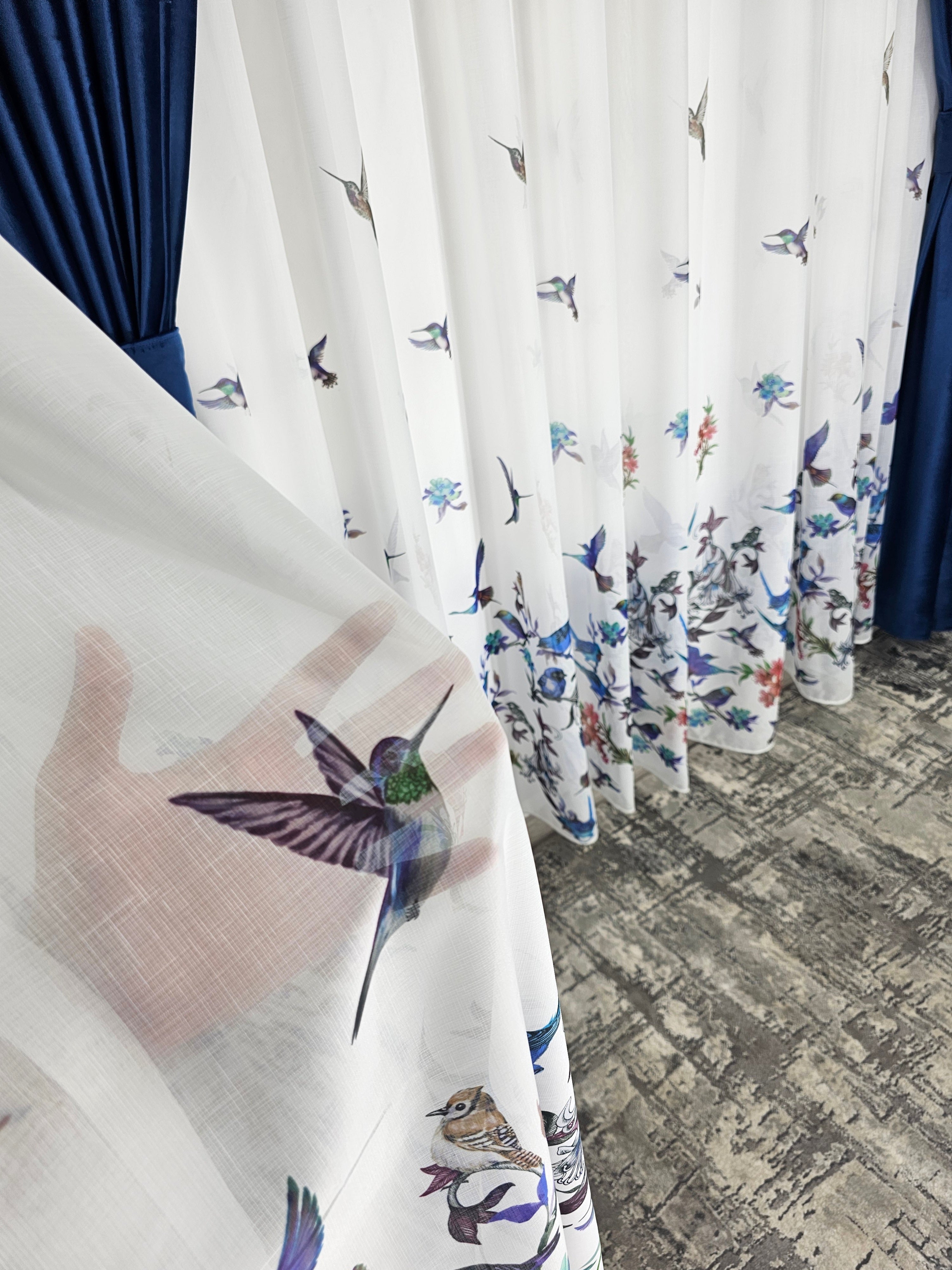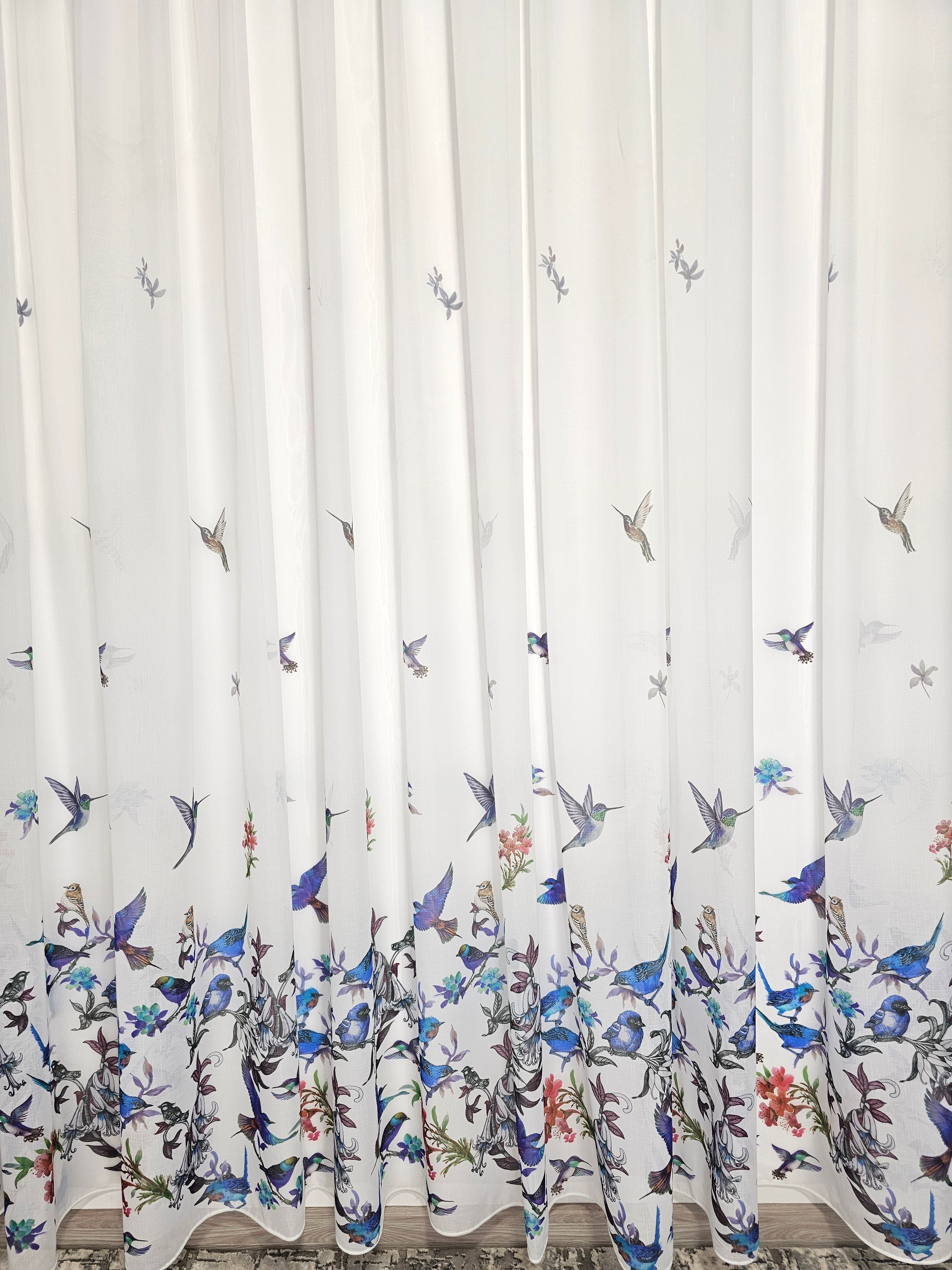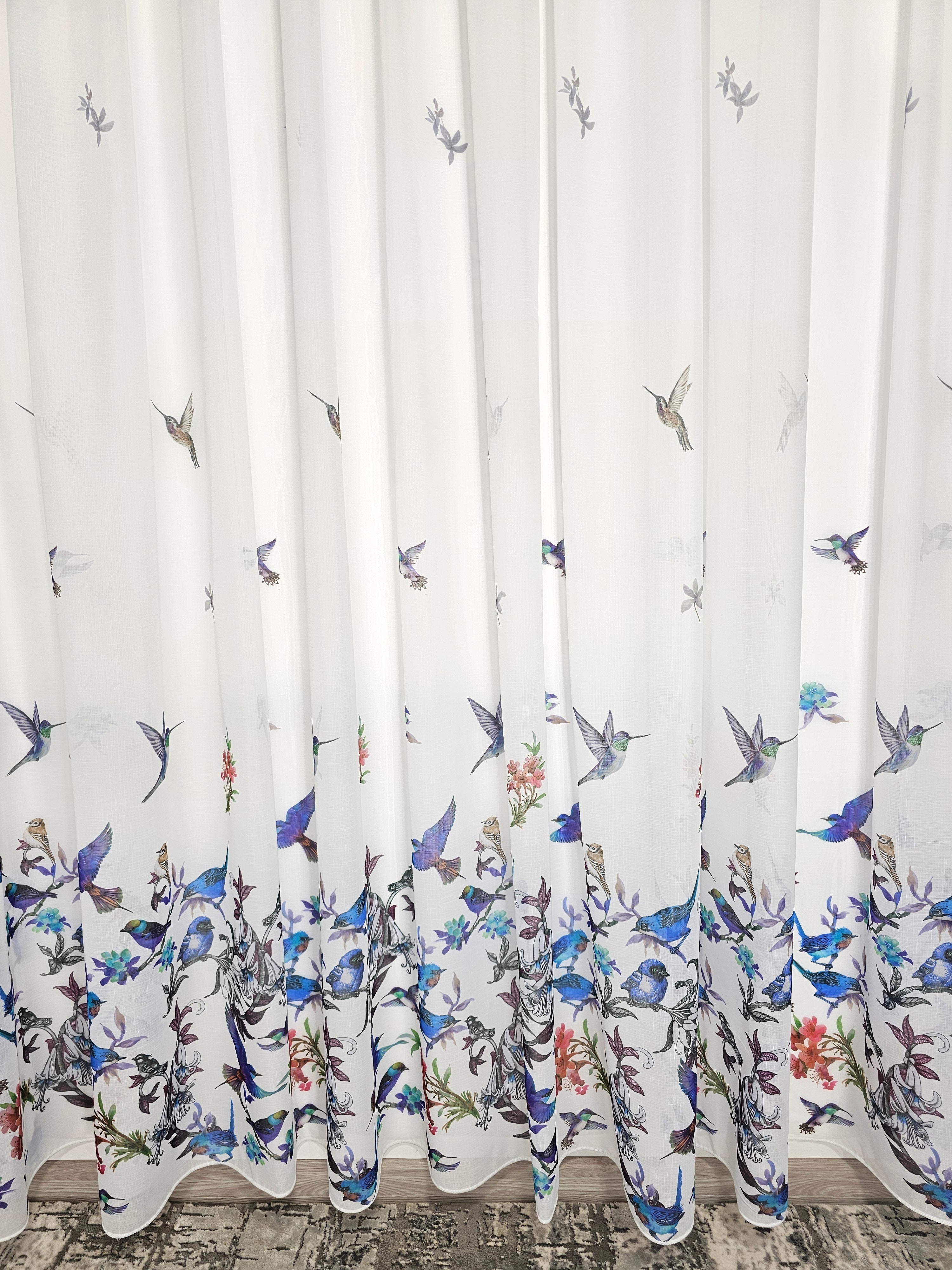 Perdeaua albă cu mov, model Păsărele, transformă ferestrele într-un element decorativ deosebit, aducând frumusețe, stil și energie pozitivă casei tale.