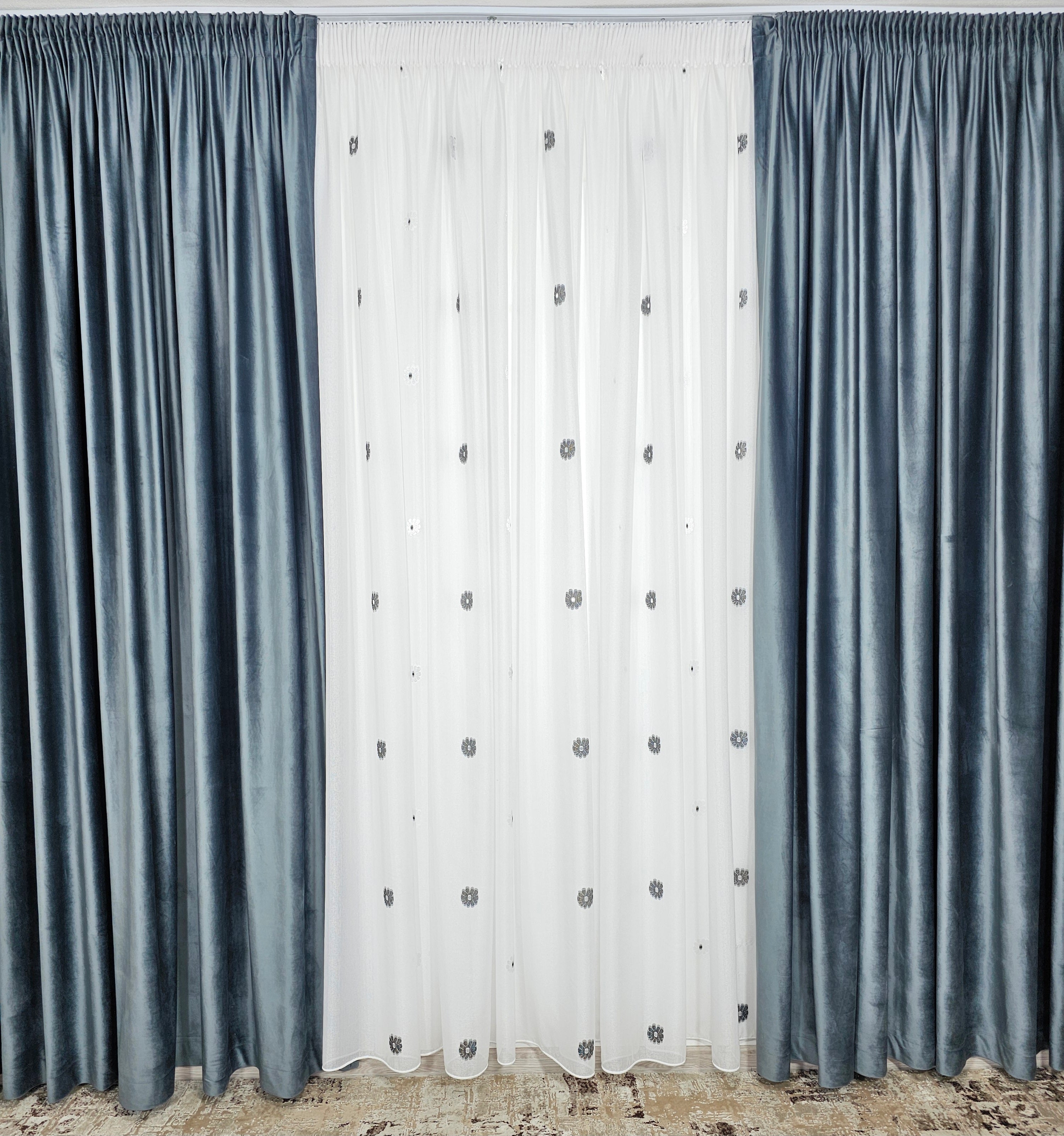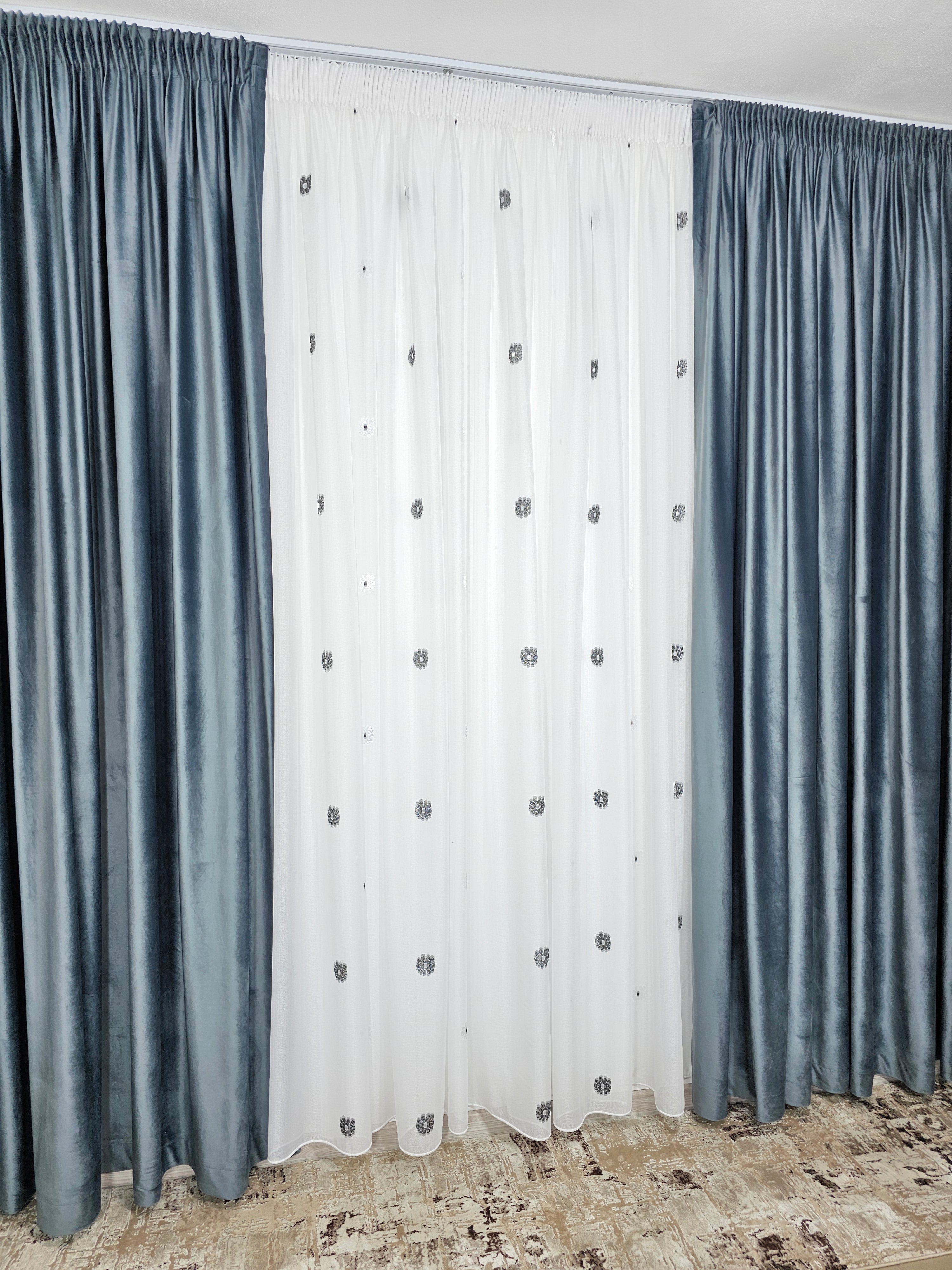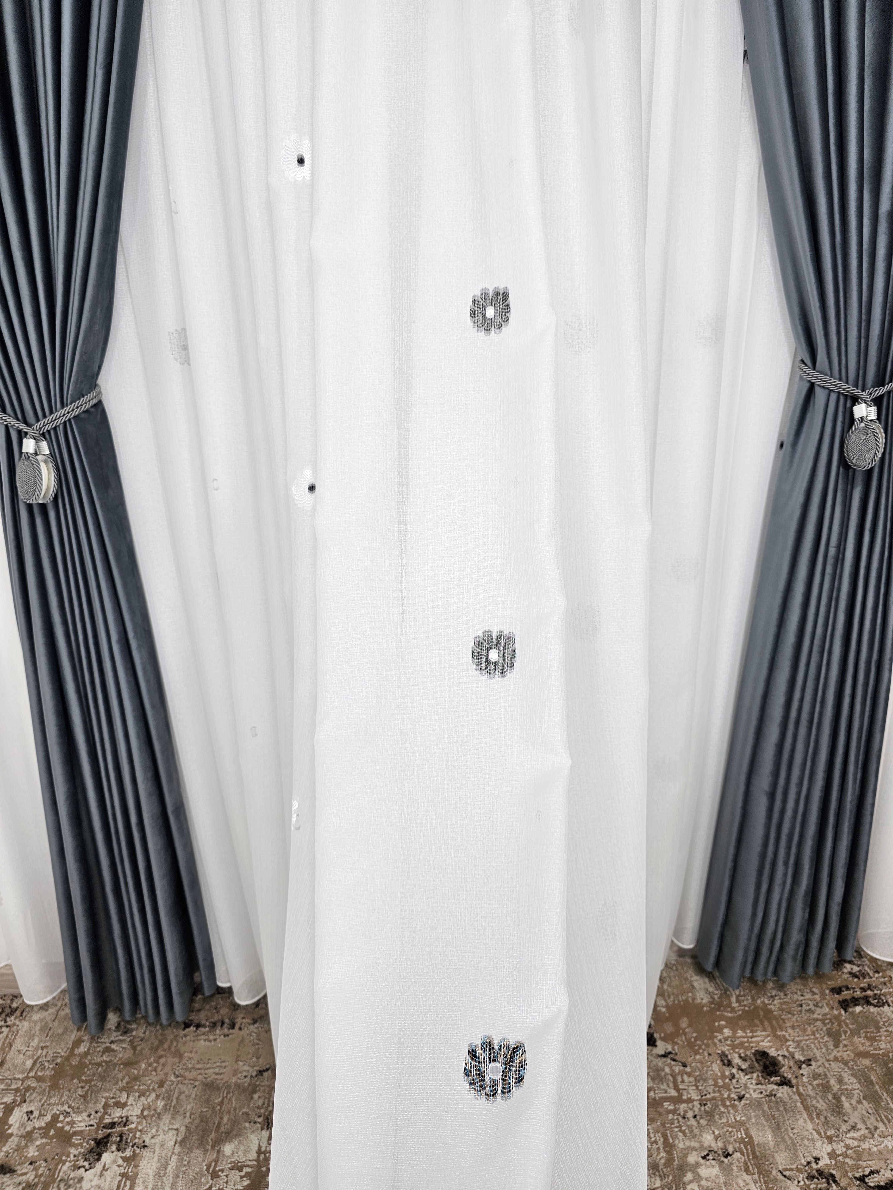 Perdeaua Dora aduce rafinament și delicatețe în decorul casei. Confecționată din material plin ca textură tip in cristal, albă și decorată cu flori alb-gri, oferă un efect elegant și discret, ideal pentru interioare moderne și luminoase.