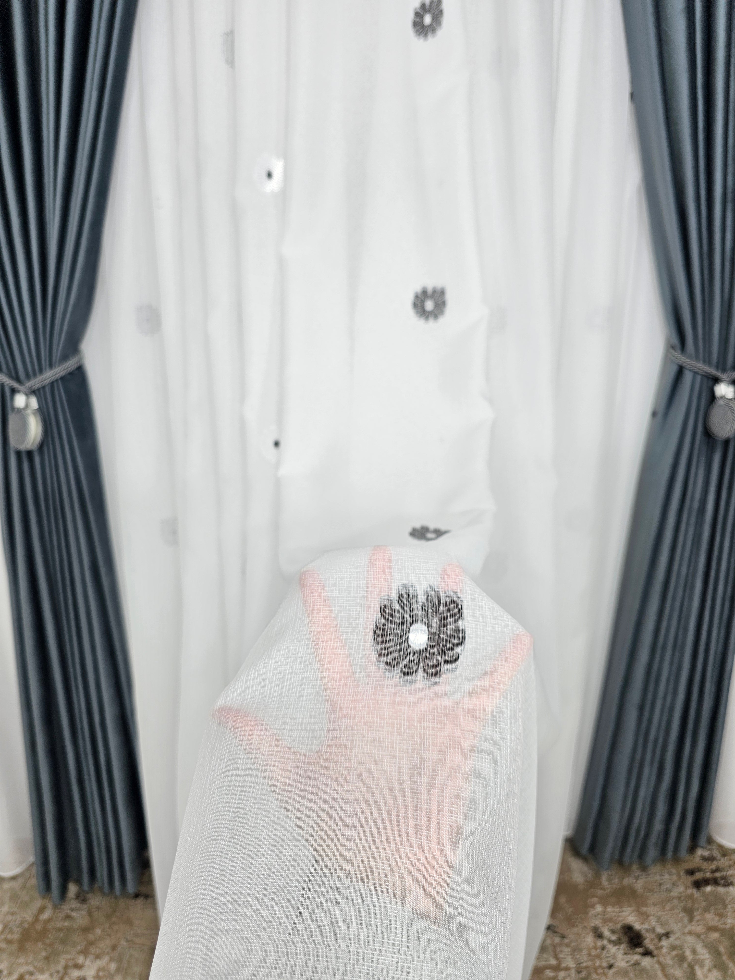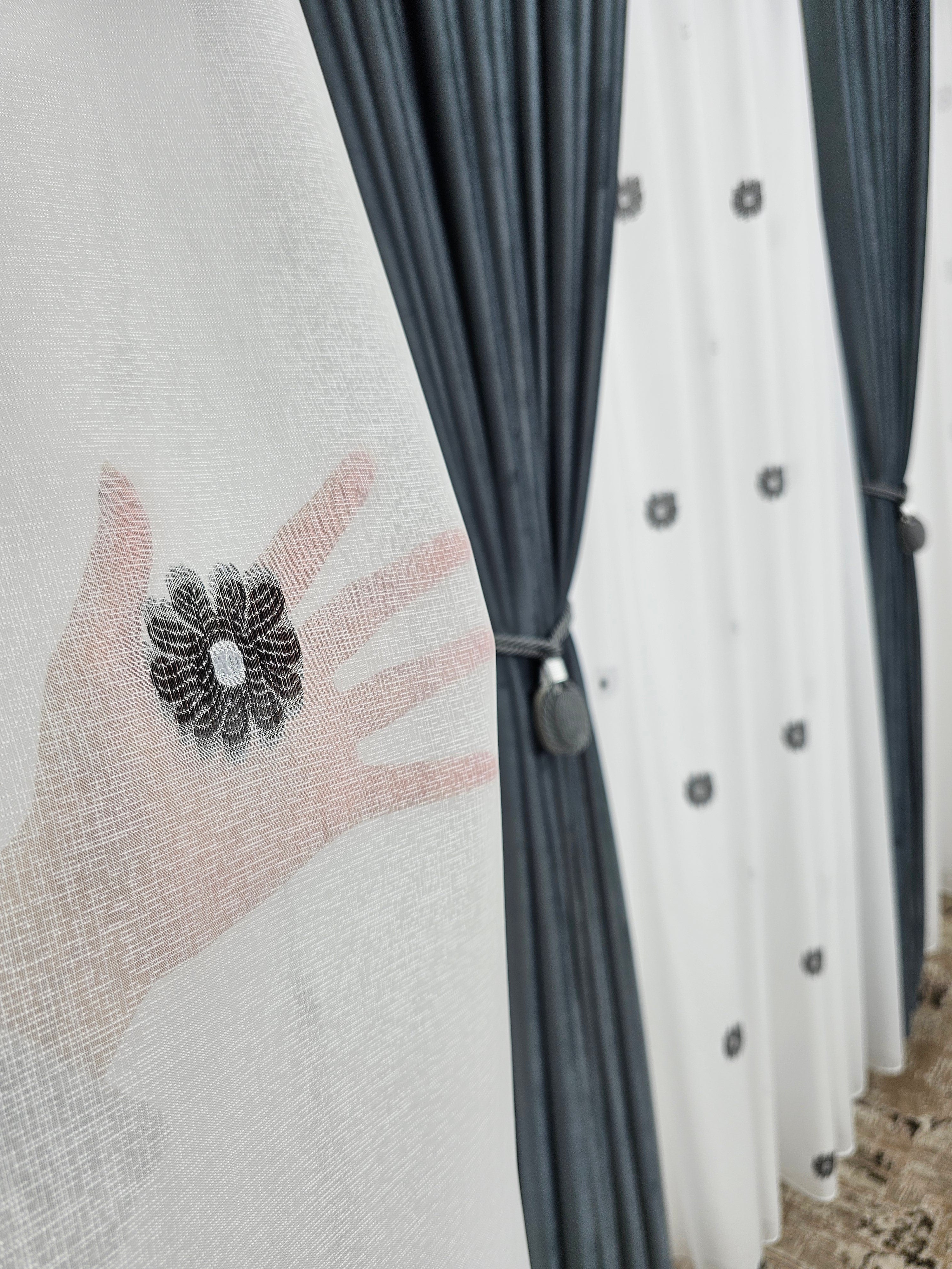 Perdeaua Dora albă cu flori alb-gri transformă ferestrele într-un detaliu decorativ deosebit, aducând un plus de stil și eleganță naturală casei tale.