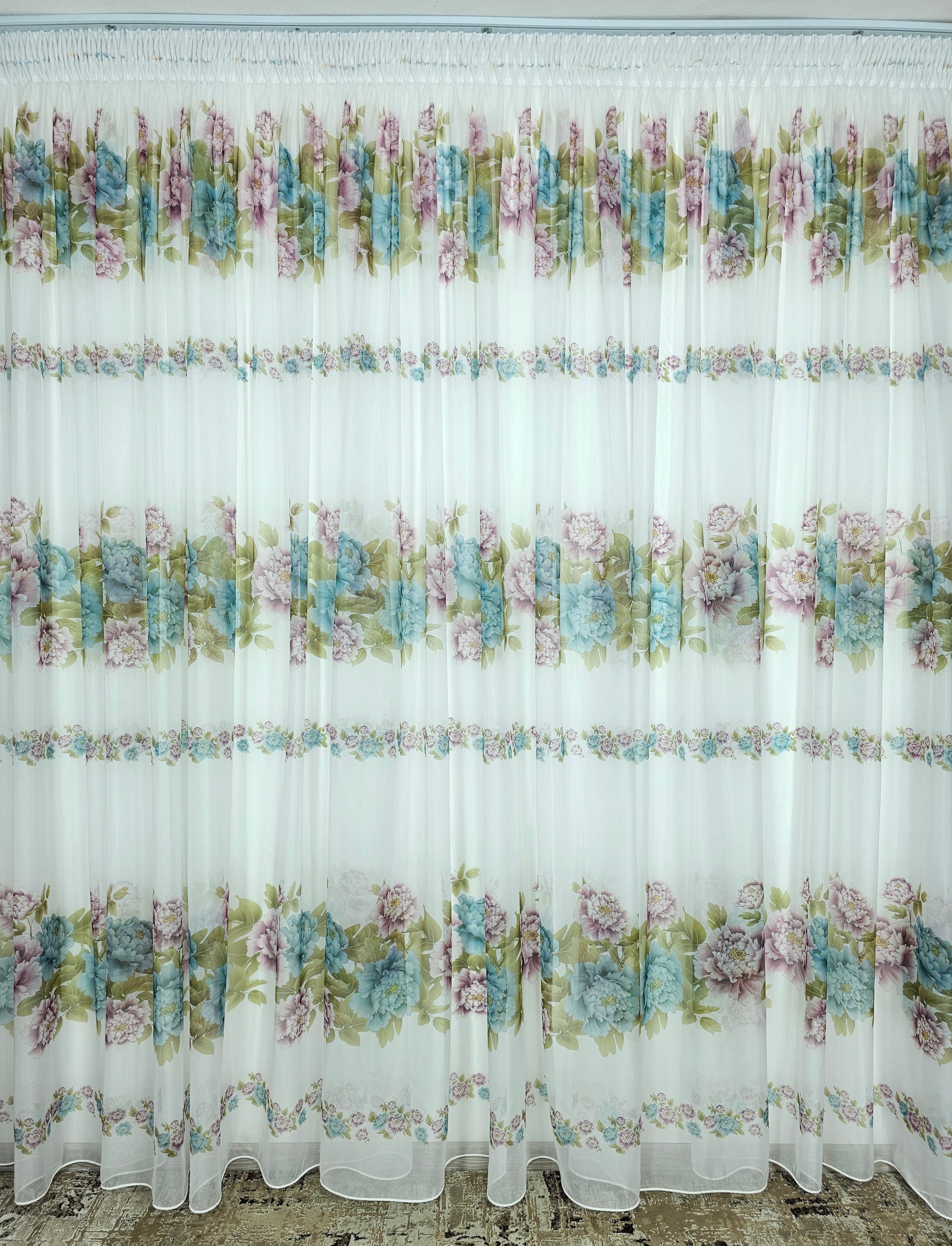 O perdea delicată și modernă, realizată din voal alb decorat cu imprimeu floral în nuanțe de roz și verde olive, ideală pentru a aduce prospețime și rafinament în orice spațiu.